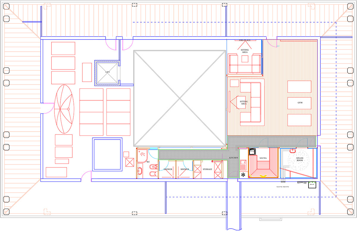 Место для расположения wellness-зоны было выбрано нетрадиционное — на крыше здания. Плоская конструкция виллы с приподнятыми по периметру скатами крыши позволила выделить пространство для wellness-зоны и разместить техническое оборудование. Предстояло провести дополнительные коммуникации в уже существующем здании и надстройки крыши с высокими теплоизоляционными свойствами.