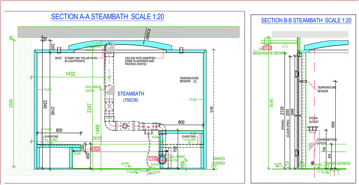Клиент пожелал спроектировать спортивный зал, сауну, паровую, несколько душевых, зону отдыха с камином и небольшую кухню.