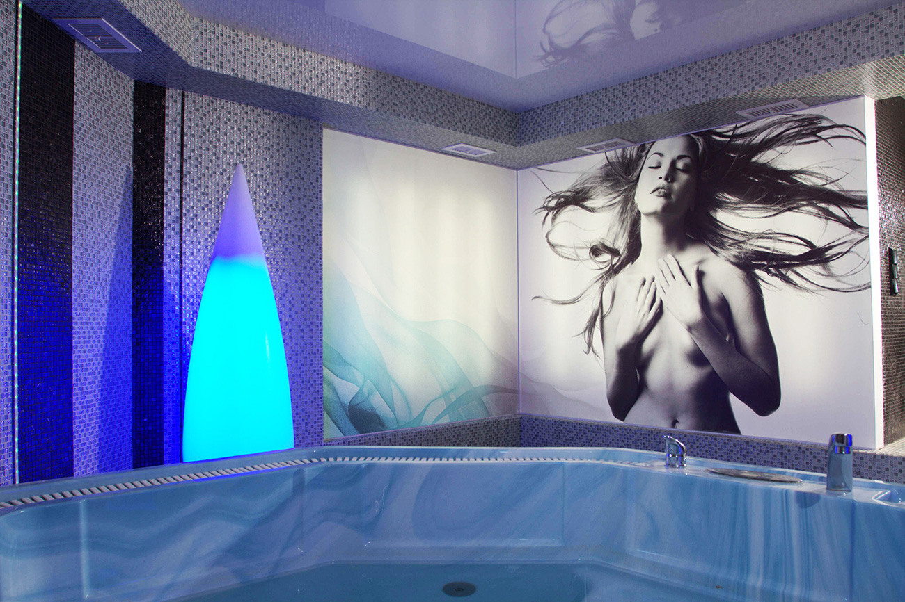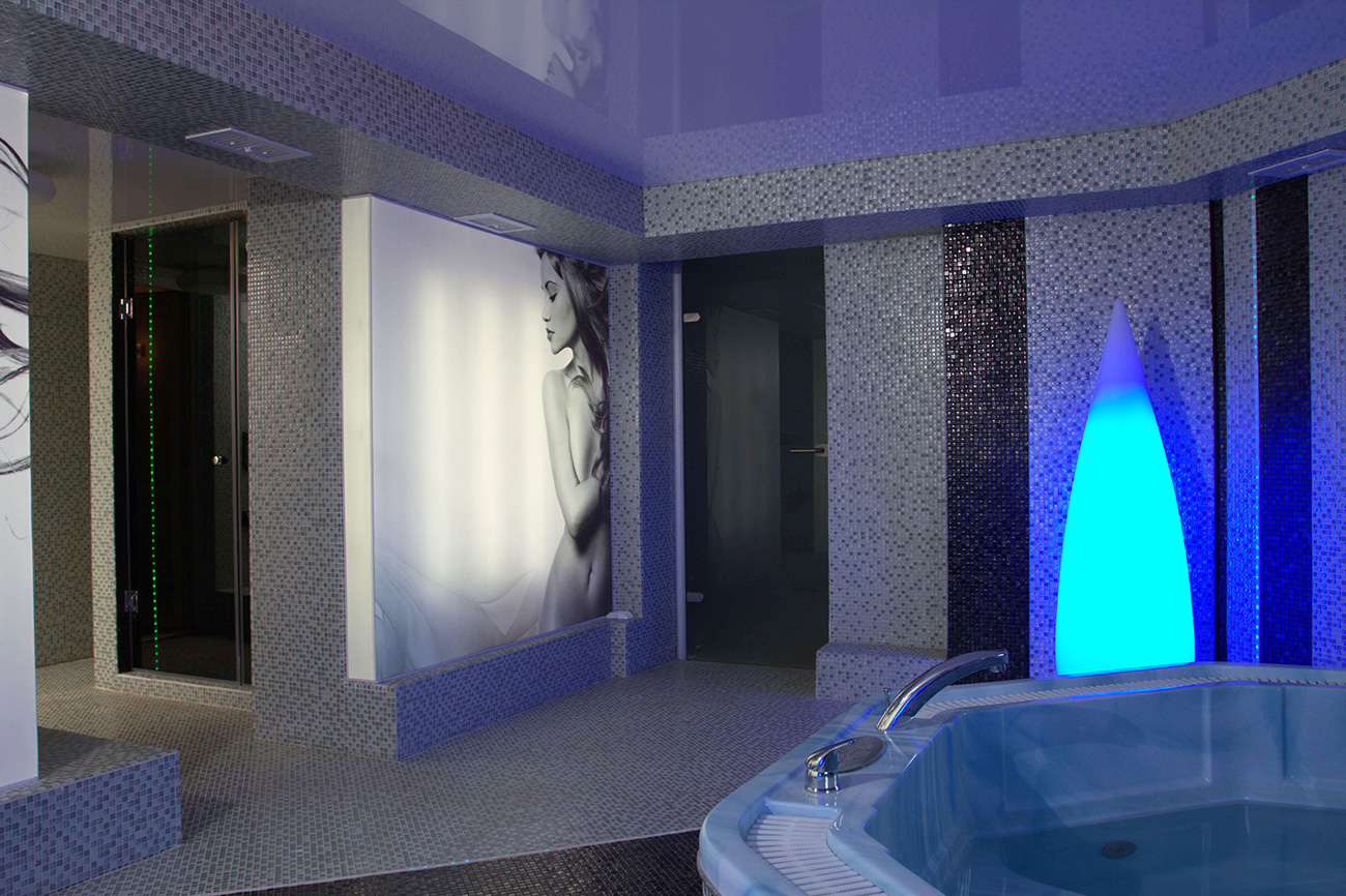 Полностью автономный спа-бассейн, встроенный в центр эркера, оснащен подогревом, системами обеззараживания ультрафиолетом и фильтрации, гидромассажем и гейзером. В отделке стен выполнены тематические постеры из транслюцентной пленки. Полупрозрачное полотно является также влагонепроницаемым, оно легко демонтируется и может быть заменено в будущем на семейную тематику.