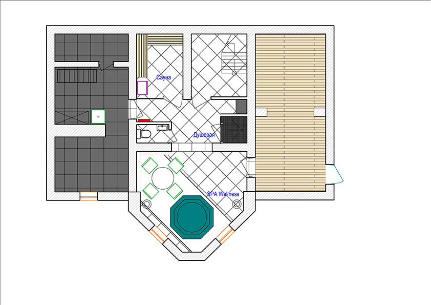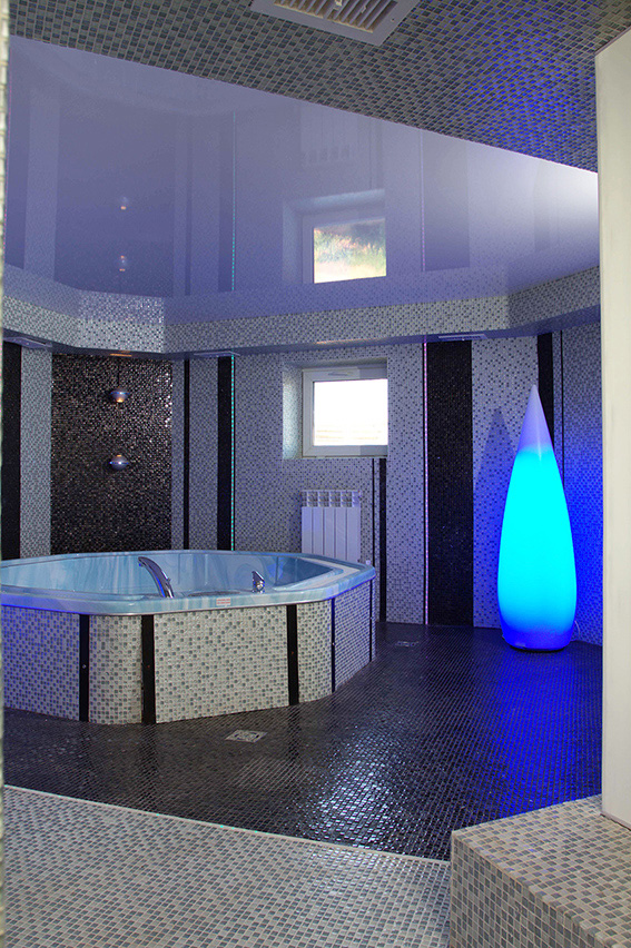 Wellness-зона находится в подвальном помещении загородного дома в г. Ижевск. В комплекс входят спа-бассейн, сауна, душевая в строительном исполнении. Стены и пол полностью отделаны мозаичной смесью из керамики и смальты,что создает эффект перетекания пространства. В мозаику встроены светодиодные ленты, затертые эпоксидной затиркой, в том числе и в душевой кабине. Это герметичная конструкция.