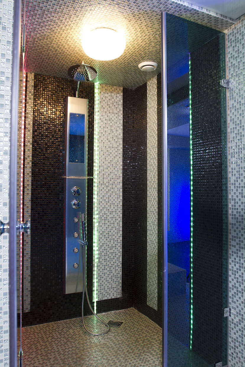 Светодиоды подчеркивают линейный рисунок мозаики, перетекая со стен на пол и обратно. Они функционируют как в статичном режиме, так и в режиме RGB с эффектом смены и мерцания света для проведения вечеринок. Все это создает неповторимую атмосферу мини-курорта дома для отдыха и оздоровления.
