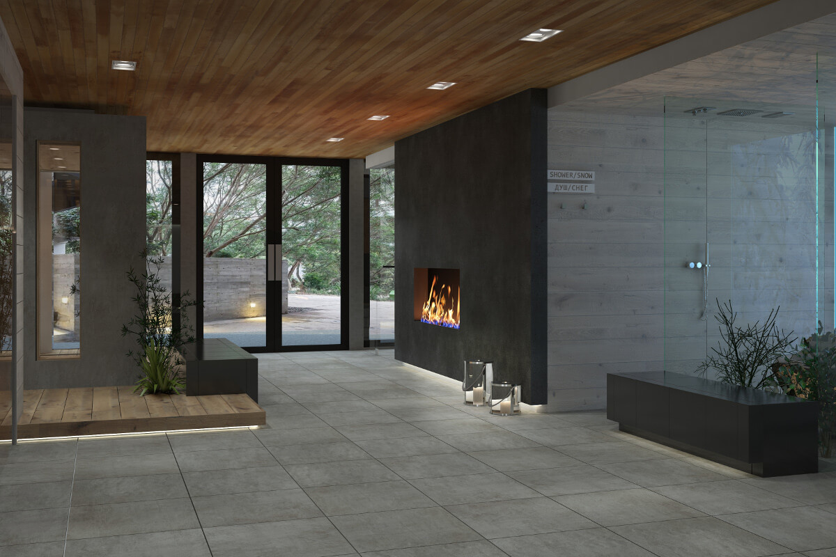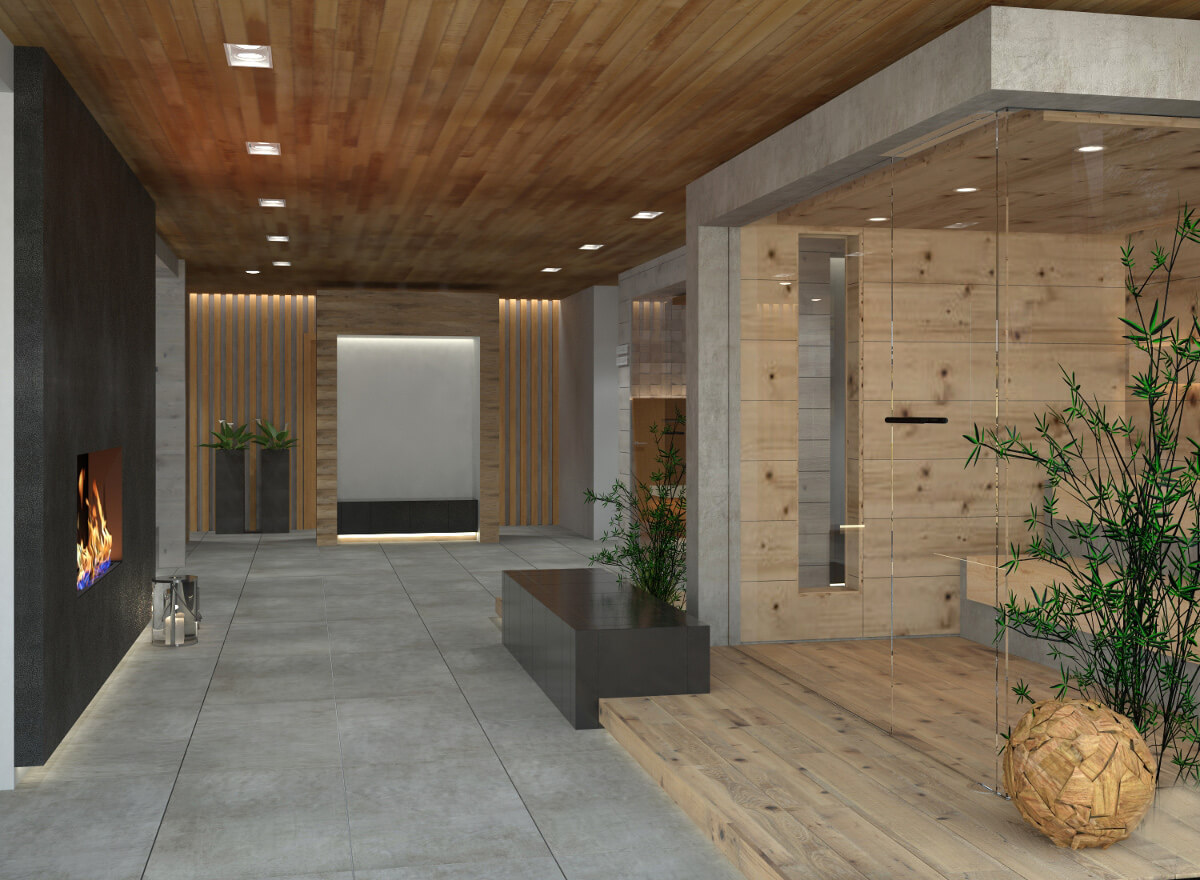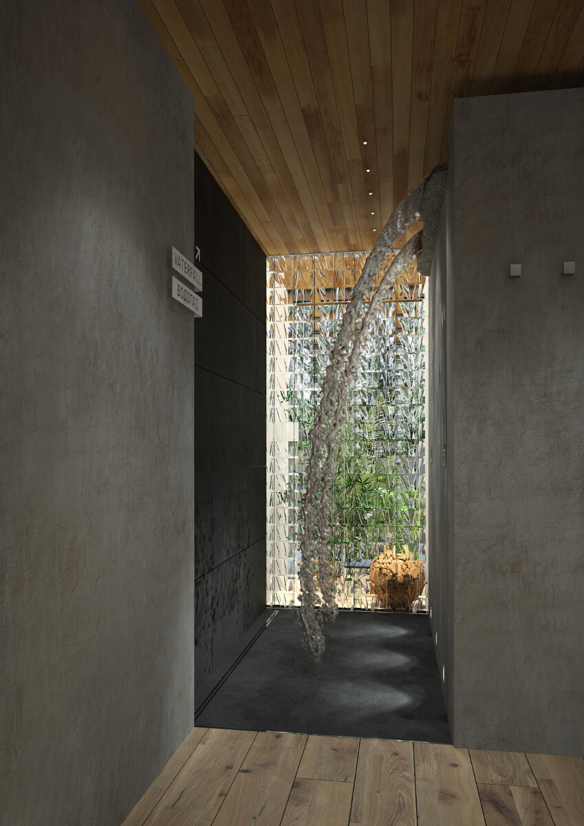 Вход в спа организован по коридорам, ведущим из двух блоков гостиницы, к стойке-рецепции, украшенной резным кружевом, напоминающим украшения русских деревянных домов. Керамическая плитка MUTINA Bas-relief garland nero и MUTINA PUDD14 DECHIRER DECOR NERO с рельефным рисунком, панели с дубовым шпоном и изготовленные из половинок бревна столики завершают образ современного русского спа.