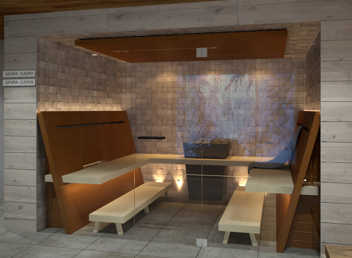 Ароматическая сауна — мягкая, нежаркая, с лавками оригинальной конструкции, выполненными из Rohol S-Ply меранти, и потолком из того же материала. Стены облицованы керамогранитом PORCELANOSA Taco Oxford Acero. Оборудование для ароматизации Laconium (Wellness Design Technology) позволяет синхронно менять 3 цвета подсветки и 3 аромата, подающиеся на камни печи вместе с водой. При смене аромата раздается предупреждающий сигнал.