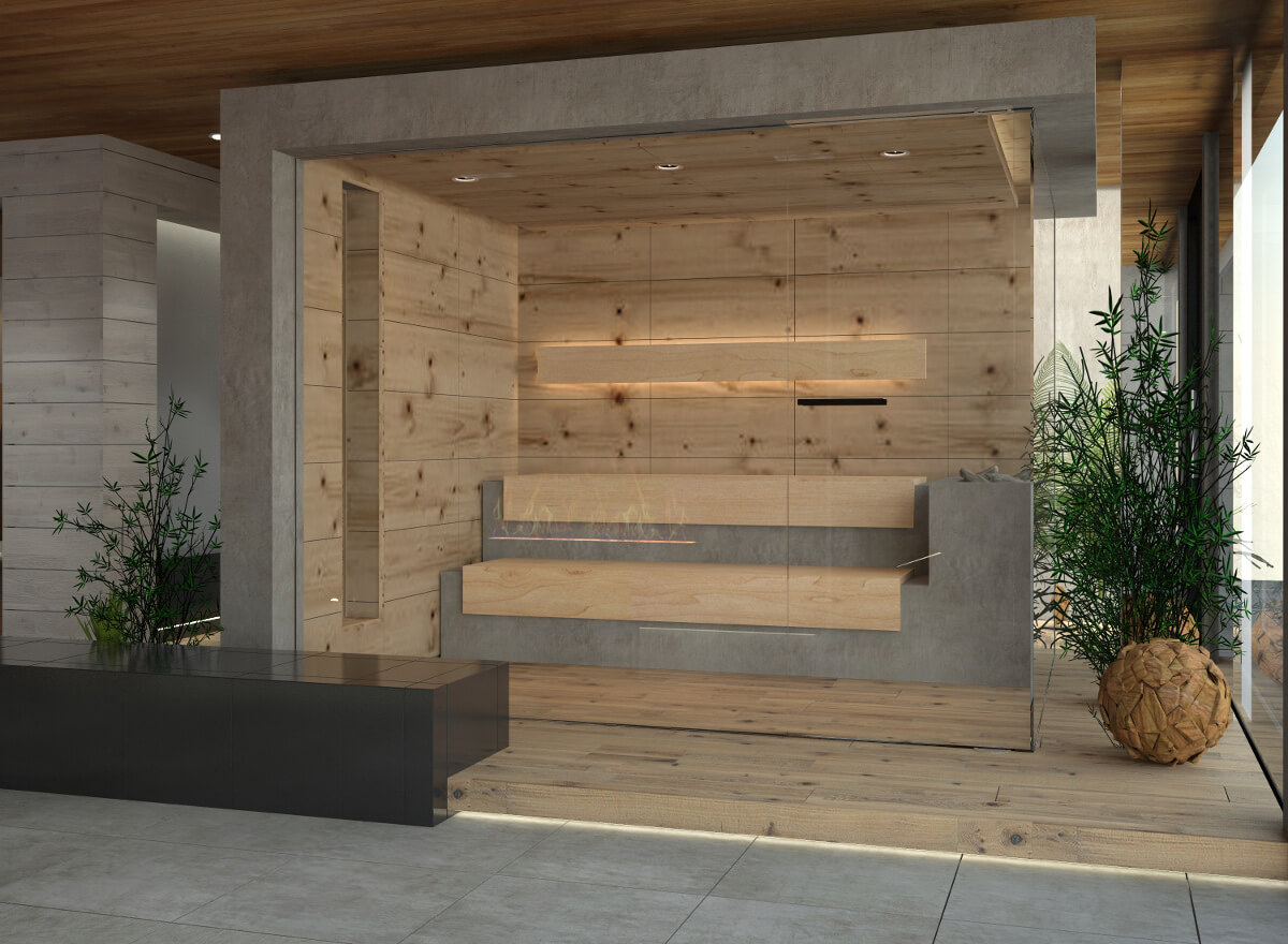 Сауна — небольшая, открытая дневному свету баня с видом на улицу, оборудованная мощной электрической печью, интегрированной в общий с основанием скамьи объем, облицованной керамогранитом. Дополнительное узкое вертикальное окно в стене сауны пропускает дневной свет в глубину холла.