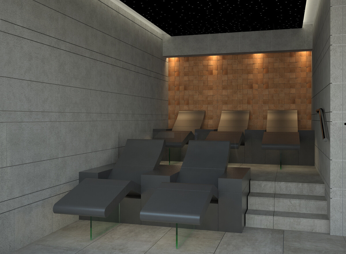 Для отдыха предусмотрены три двухместные и две трехместные керамических скамьи с подогревом. Они рассредоточены по банному комплексу, образуя несколько удобных мест для общения. Отдельная комната отдыха с чайным набором для самообслуживания и комфортными шезлонгами оформлена декоративными фотопанно с растениями.
