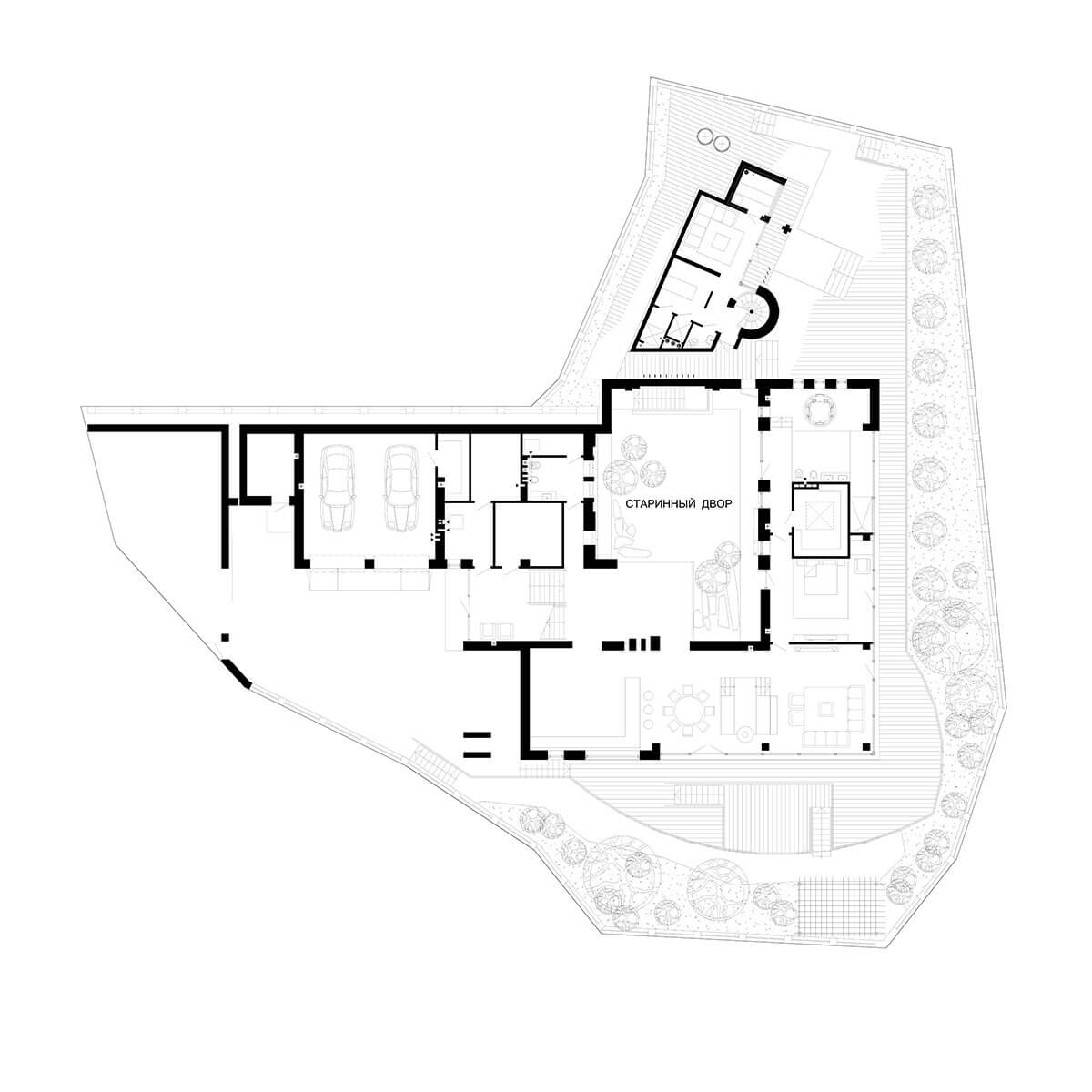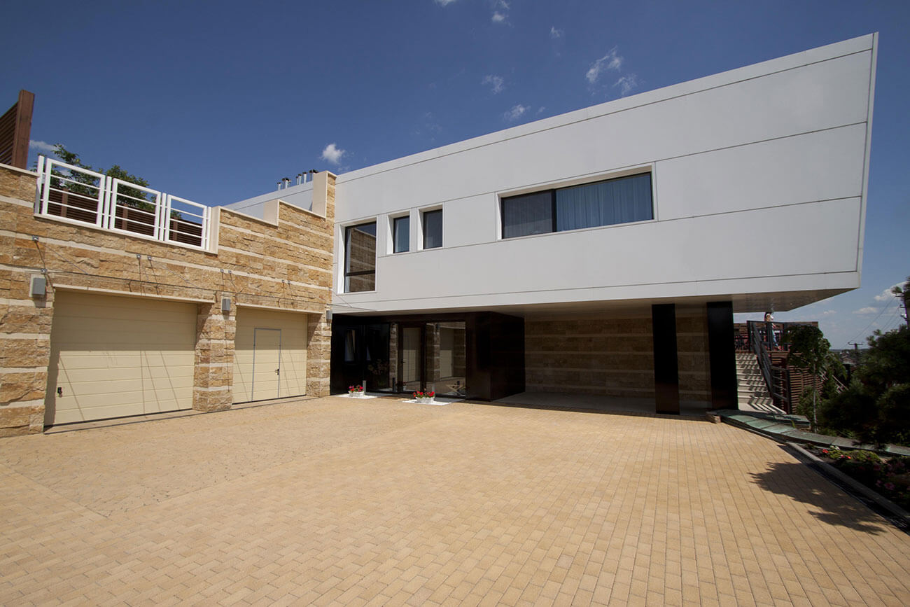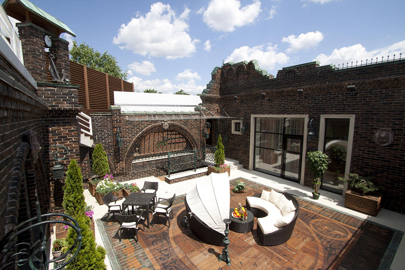 Плоская эксплуатируемая кровля в виде «набережной», характерные ограждения, деревянный настил и крупная галька создают отличную возможность остаться наедине с небом и звездами. Дом практически не виден с дороги, но отовсюду можно любоваться окружающими пейзажами. Единственное пространство, замкнутое на себе — это внутренний двор, абсолютно европейский по духу и яркая иллюстрация того неожиданного, что скрывается за современной пластикой этого дома. Старинный кирпич, деревянная черепица, каскады разрушенных стен, загадочная карта Меркатора под ногами… Это абсолютно контрастное отношение к внешней архитектуре решение — воплощение концепции яхт-хауса. Ведь мы не просто перемещаемся в пространстве, мы по-настоящему путешествуем, оказываясь в разных странах, культурах, эпохах…создавая смену пространственных настроений.