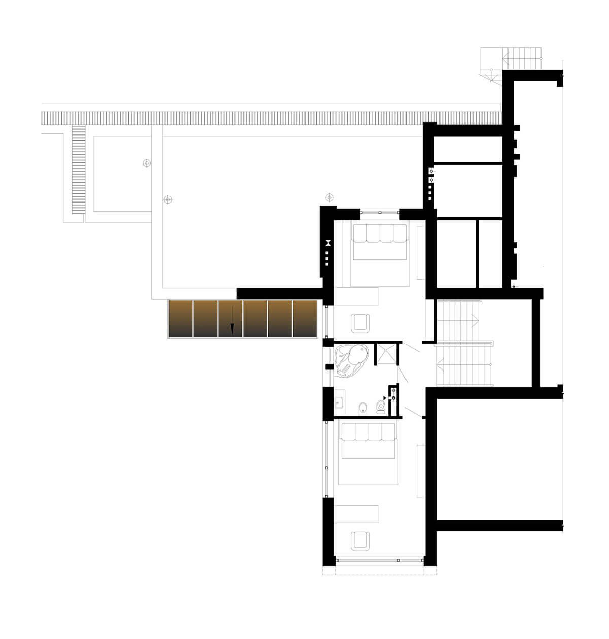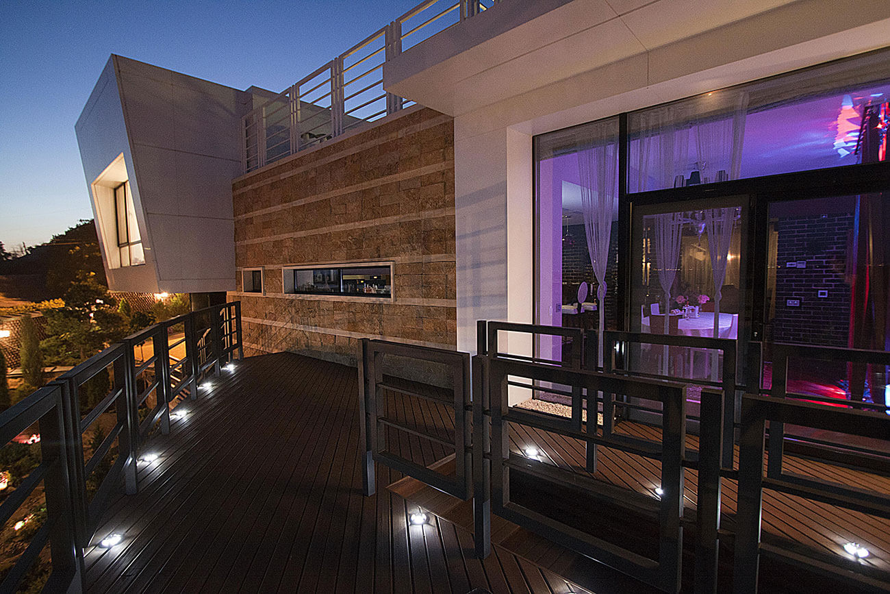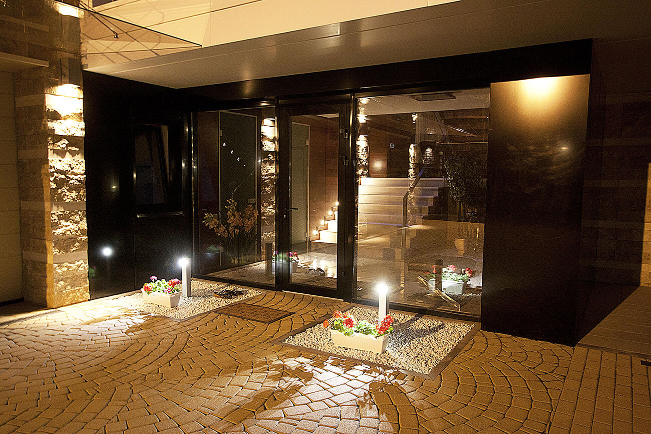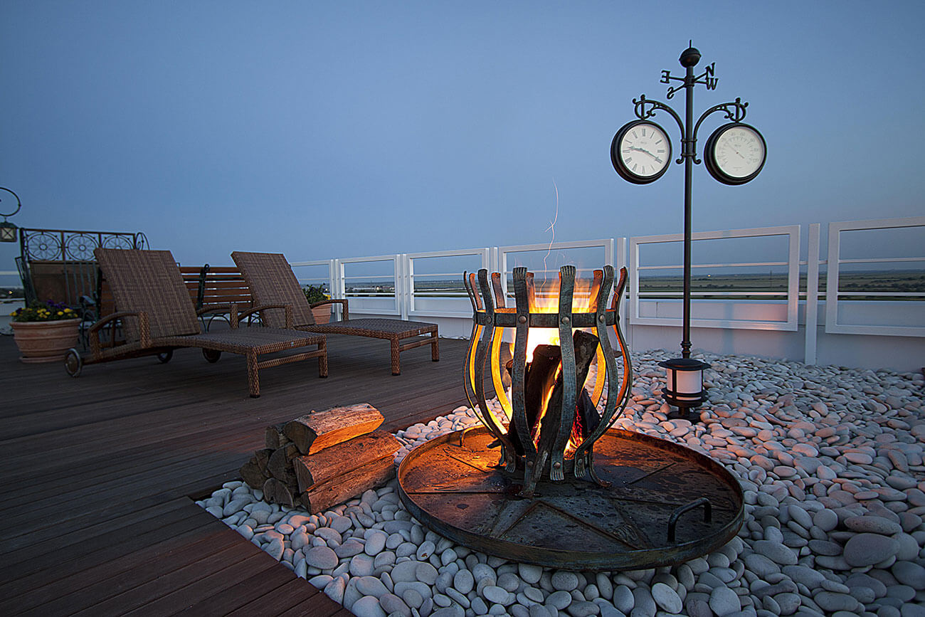Плоская эксплуатируемая кровля в виде «набережной», характерные ограждения, деревянный настил и крупная галька создают отличную возможность остаться наедине с небом и звездами. Дом практически не виден с дороги, но отовсюду можно любоваться окружающими пейзажами. Единственное пространство, замкнутое на себе — это внутренний двор, абсолютно европейский по духу и яркая иллюстрация того неожиданного, что скрывается за современной пластикой этого дома. Старинный кирпич, деревянная черепица, каскады разрушенных стен, загадочная карта Меркатора под ногами… Это абсолютно контрастное отношение к внешней архитектуре решение — воплощение концепции яхт-хауса. Ведь мы не просто перемещаемся в пространстве, мы по-настоящему путешествуем, оказываясь в разных странах, культурах, эпохах…создавая смену пространственных настроений.