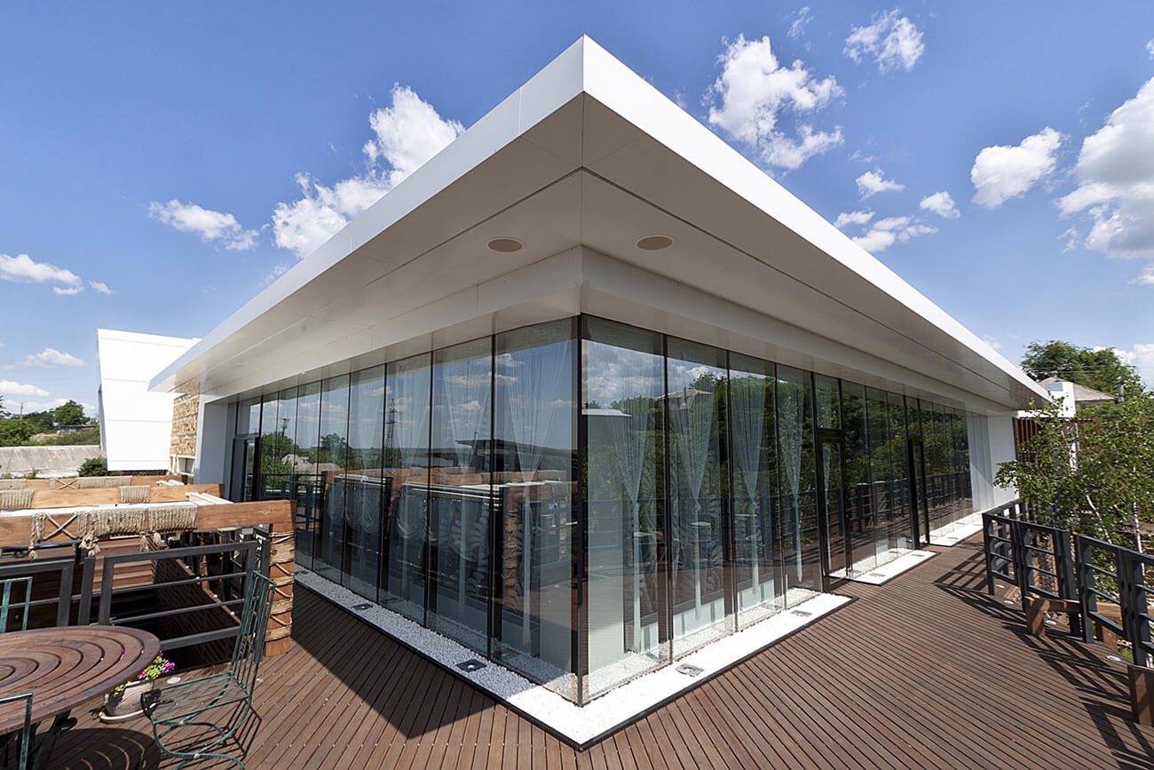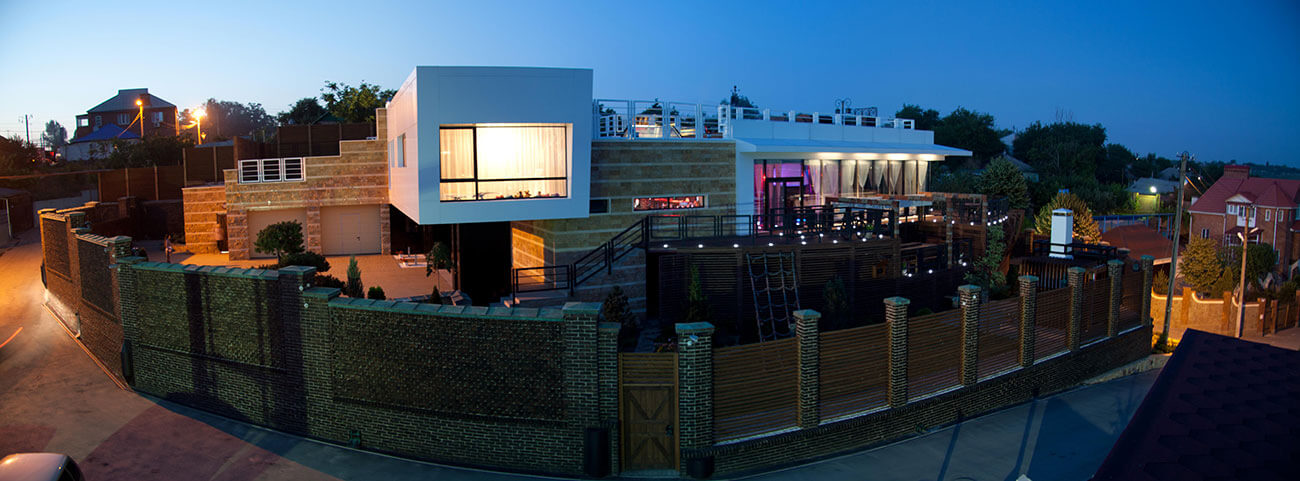 Название дома связано с его основной концепцией — путешествием... Солнце и ветер! Дом расположен на южном склоне крутого холма, простирающегося практически до самого горизонта поймы реки. Одновременно из всех основных помещений дома открывается панорамный обзор. Стремительные формы современной архитектуры, корабельная геометрия здания яхт-хауса скрывают за собой много неожиданного. За каждым поворотом, как и положено в любом путешествии, возникают совершенно новые перспективные виды, со своим настроением, со своими фактурами — натурального камня, дерева, стекла...
