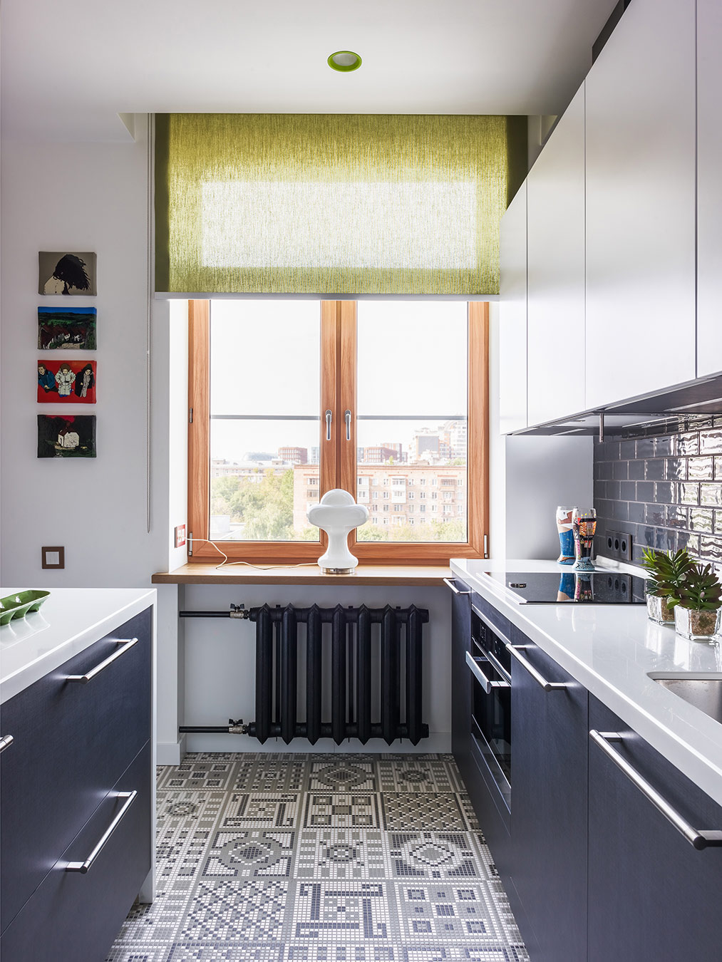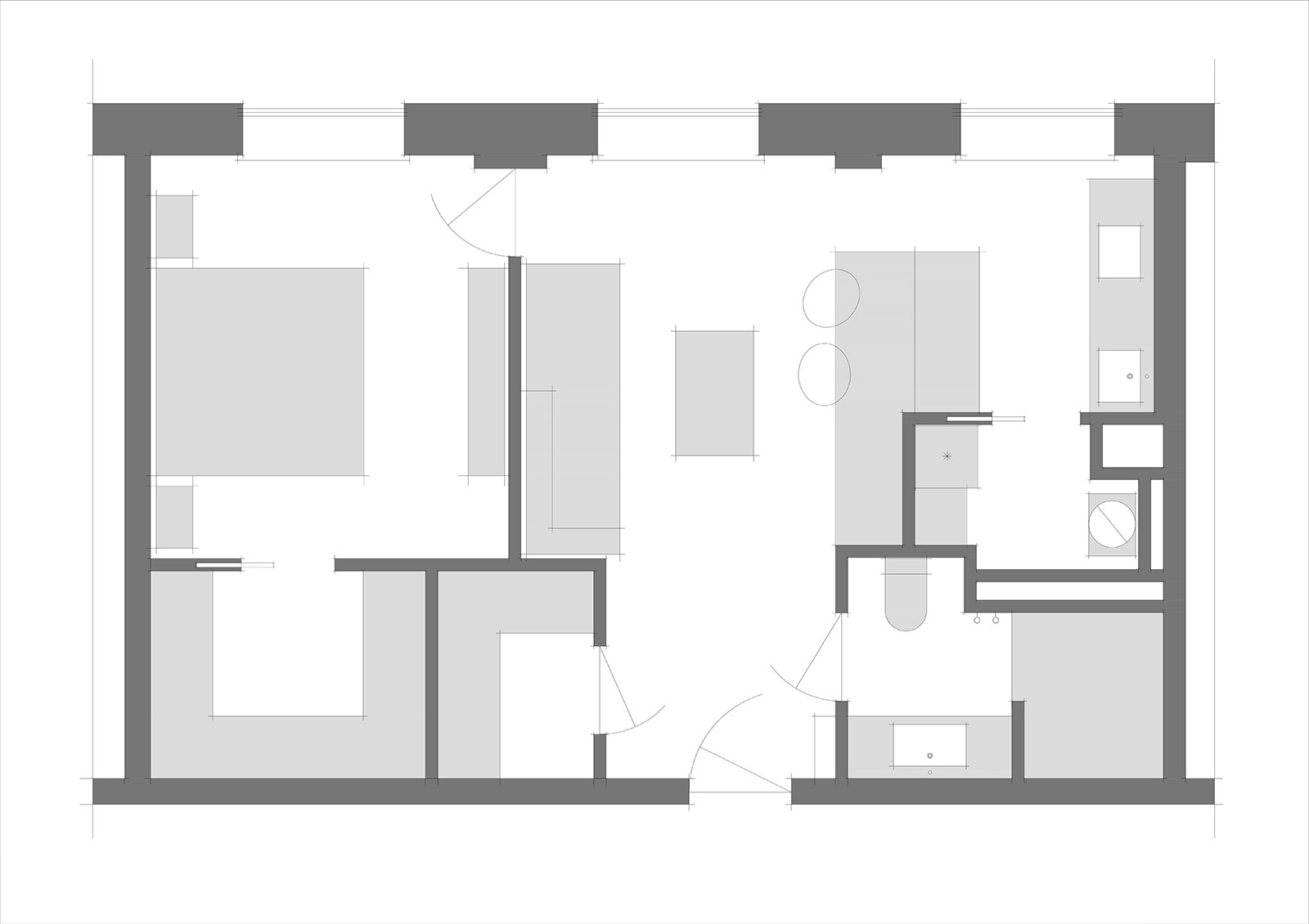 Команда студии превратила стандартную московскую двушку в сталинском доме в эргономичное современное пространство. После перепланировки на месте коридора появились две гардеробные (одна — в спальне, вторая — в прихожей), а рядом с кухней — подсобка, куда убрали холодильник, стиральную машину и все необходимые в хозяйстве вещи. Прихожую, гостиную и кухню объединили, а спальню оставили изолированной.