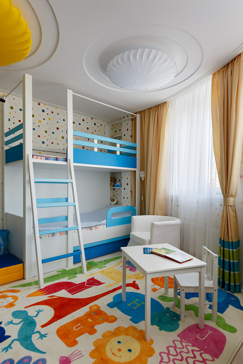 Дизайн детской для мальчика выдержан в современном и модном стиле. При этом в ее оформлении использованы яркие цвета. Проблема низких потолков, невозможность задействовать высоту помещений обусловили использование приема, единого для всей квартиры: потолки обыгрываются небольшими перепадами, а ниши под шторы закрываются специально подобранным молдингами.