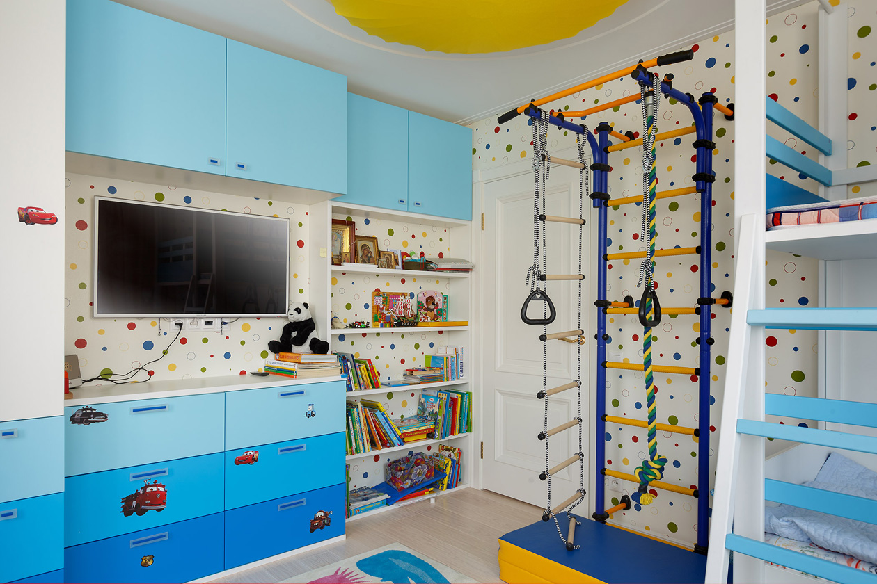 В светлой детской преобладает синий цвет, однако комната выглядит яркой и жизнерадостной — цветной ковер на полу с изображениями красочных персонажей привносит в интерьер позитив и уют.