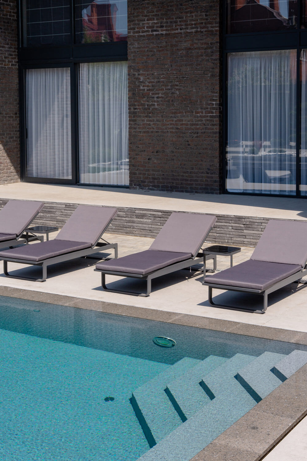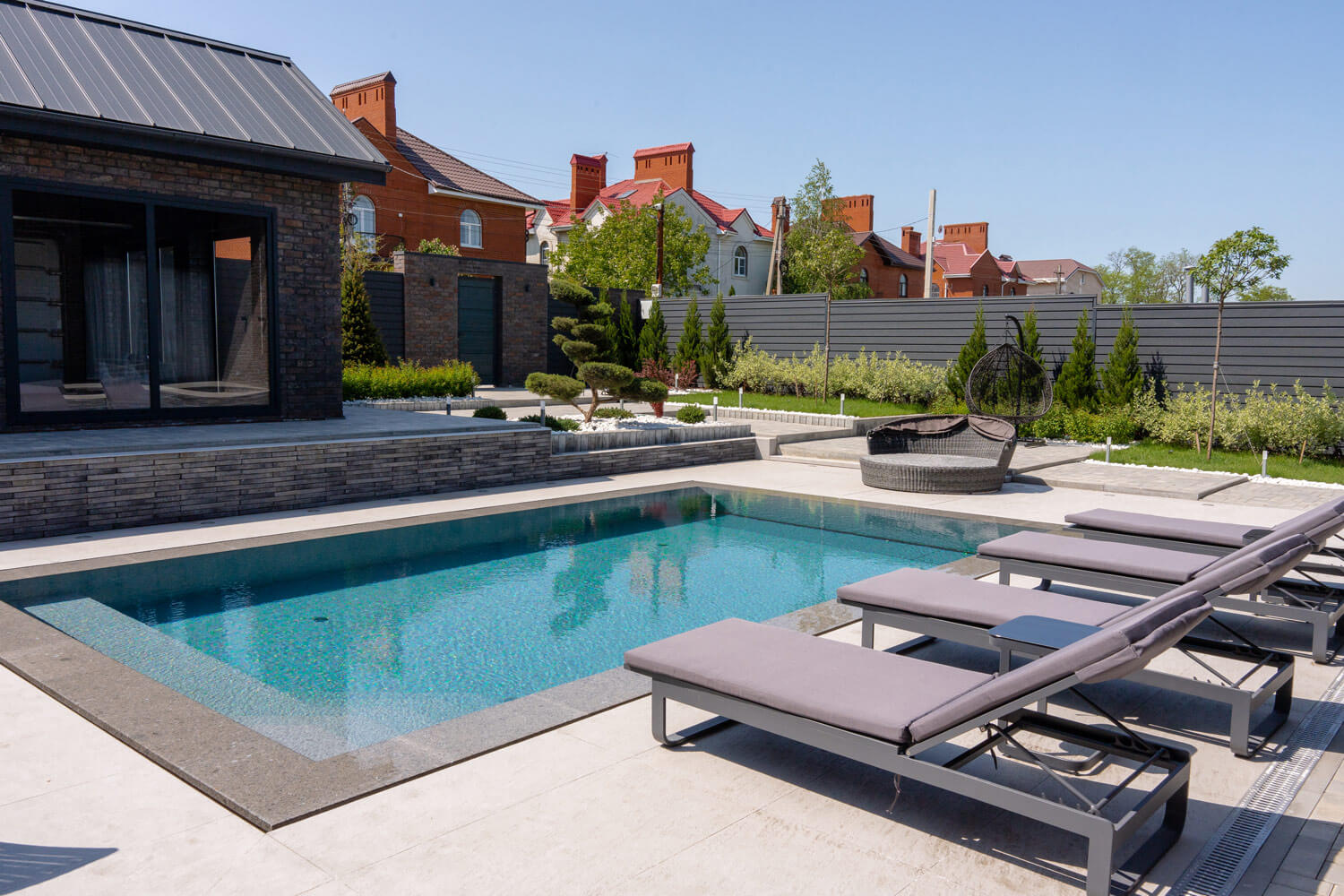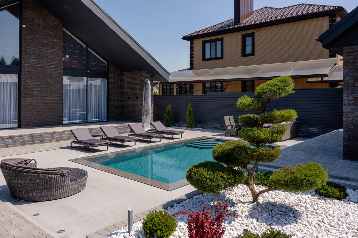 Переливной бассейн в полной комплектации выполнен дизайн-студией специально для проекта и выложен антискользящим крупноформатным керамогранитом.