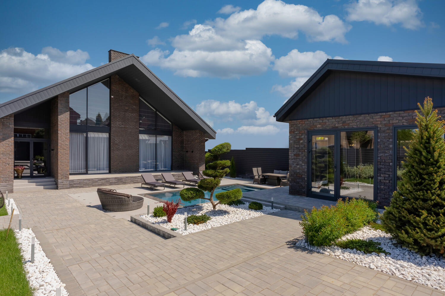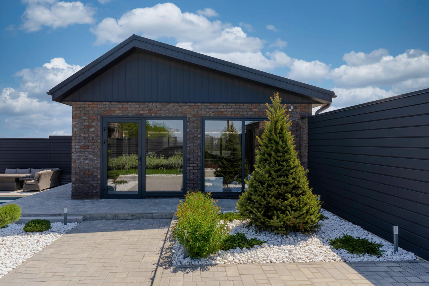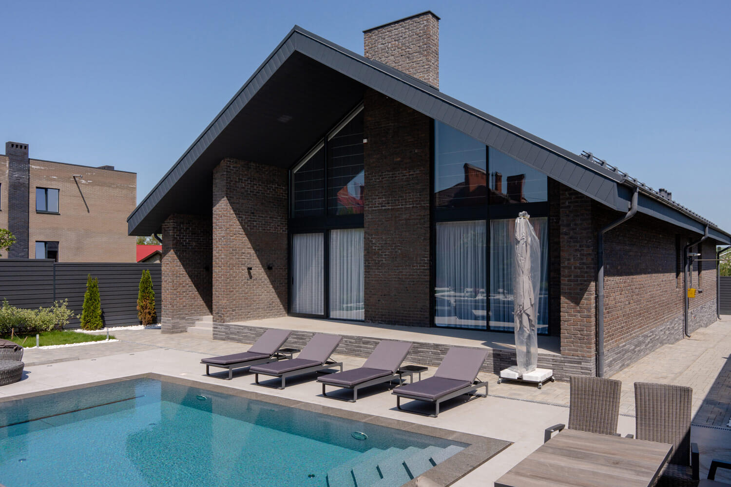 Экстерьер одноэтажного дома построен на сочетании двух стилей — барнхаус и шале. Он возведен на стандартном ленточном фундаменте, а в качестве основного материала для облицовки стен выбрали клинкерный кирпич ручной формовки. Алюминиевые оконные конструкции Shuco гармонируют с фальцевой кровлей.