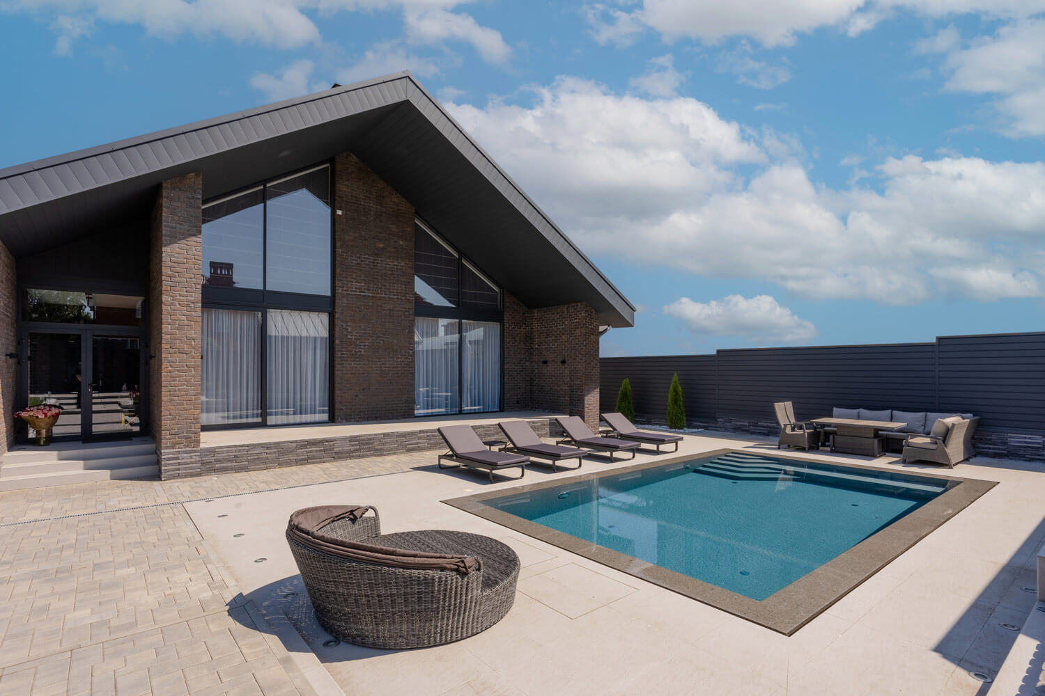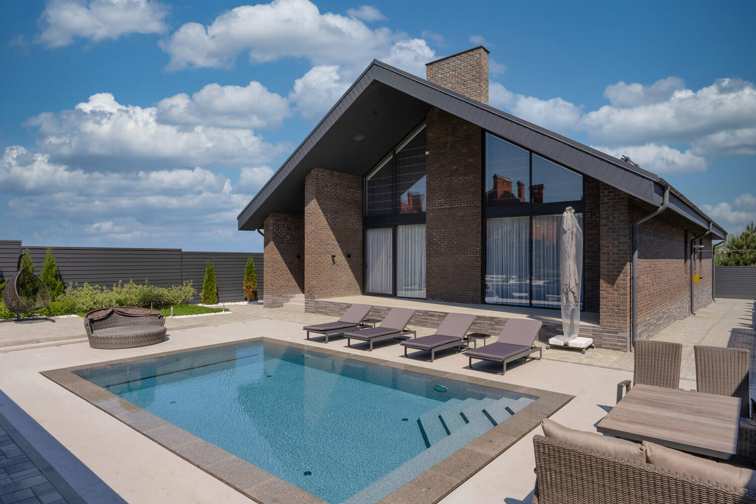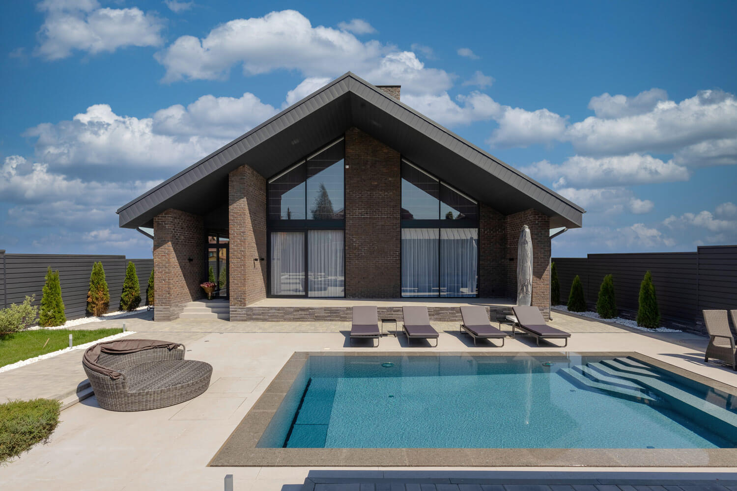 Экстерьер одноэтажного дома построен на сочетании двух стилей — барнхаус и шале. Он возведен на стандартном ленточном фундаменте, а в качестве основного материала для облицовки стен выбрали клинкерный кирпич ручной формовки. Алюминиевые оконные конструкции Shuco гармонируют с фальцевой кровлей.