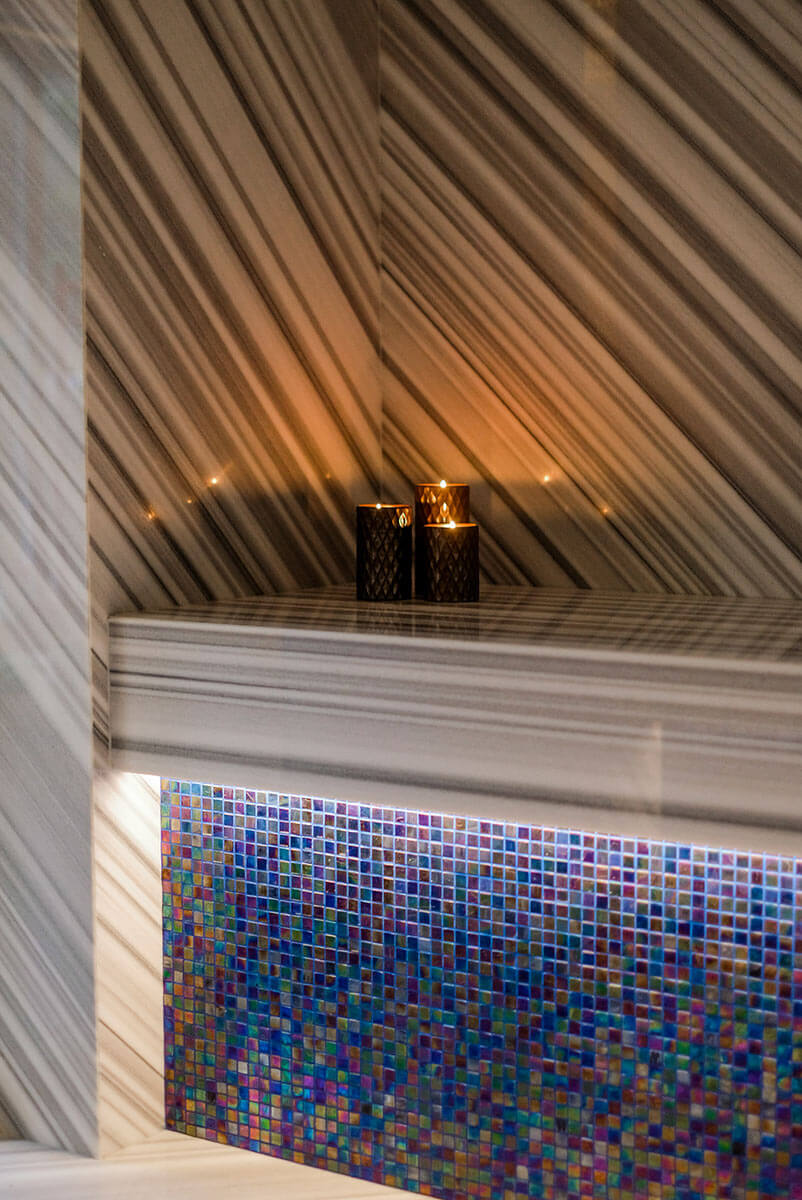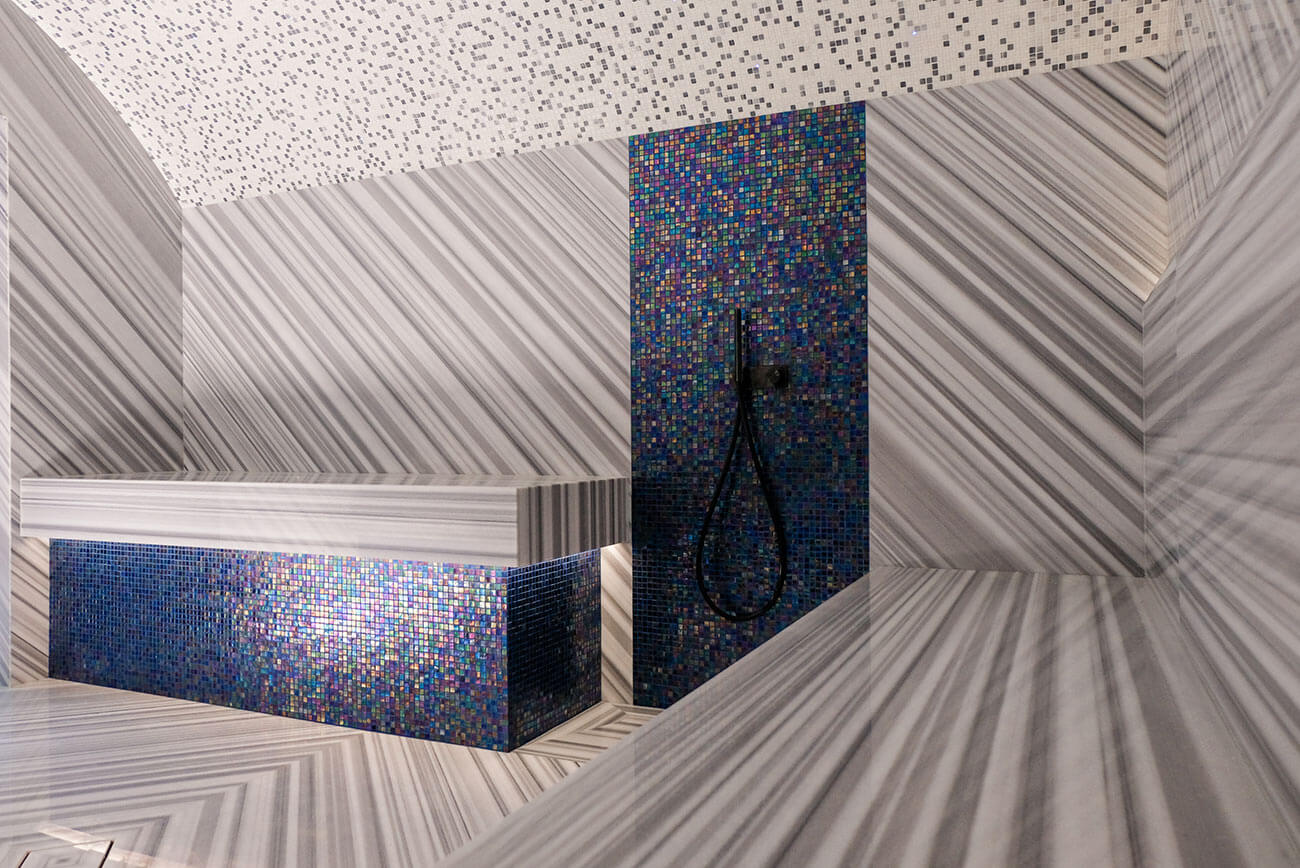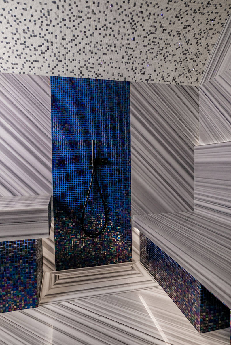 В облицовке душевой зоны и торцевой зашивке лежаков — ярко-синяя с бензольным отливом мозаика Sicis, играющая на свету всеми цветами радуги. Драматичная и неоднозначная, но, абсолютно точно, никого не оставляющая равнодушной!