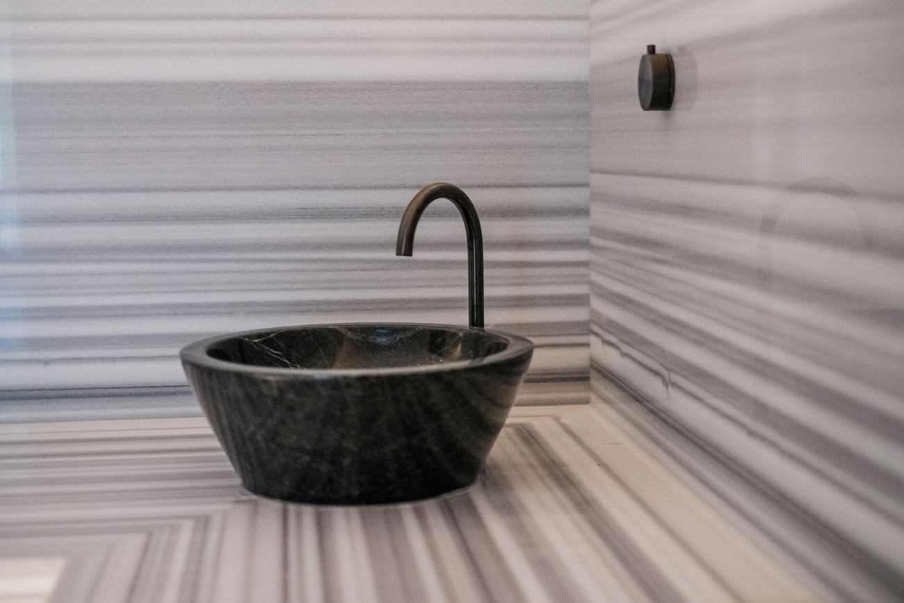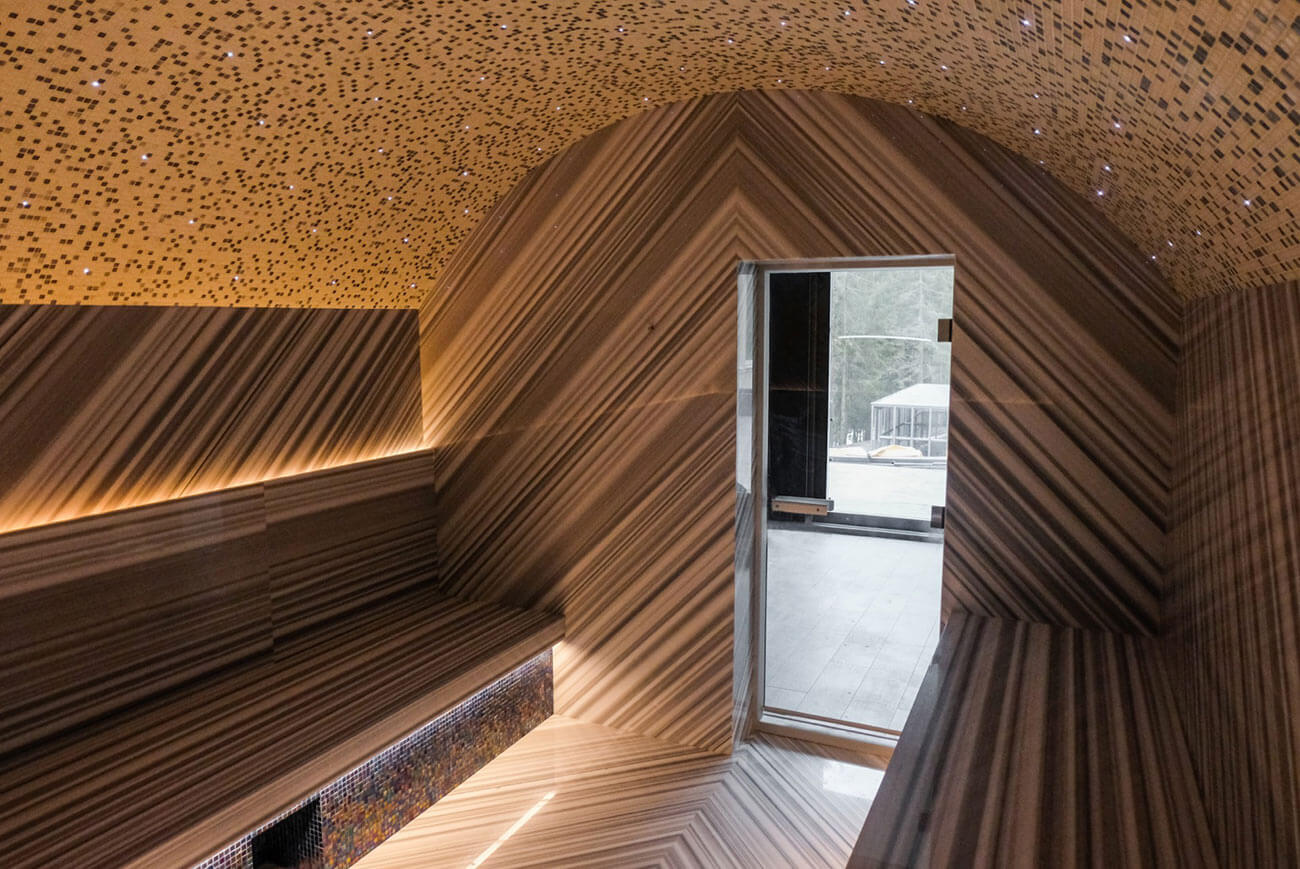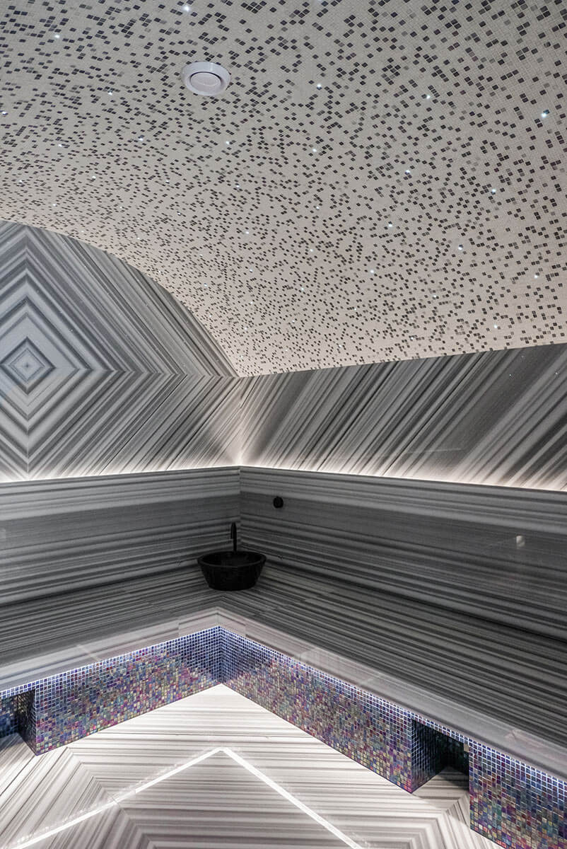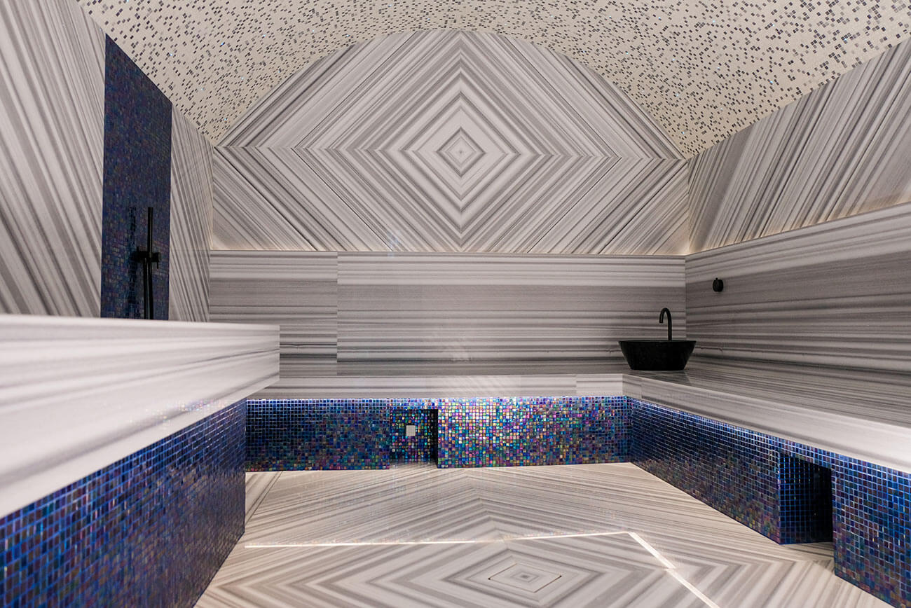 Используемый в отделке мрамор Striato Olimpico установлен на стене таким образом, что создается крупноформатный узор с эффектом «бабочки», этот же прием использован на полу. На лежаках и спинках, массажном столе тот же материал, но его раскладка меняется на горизонтальную, чтобы не отвлекать на себя внимание. Купол не выбивается из основной цветовой гаммы и облицован наборной мраморной мозаикой.