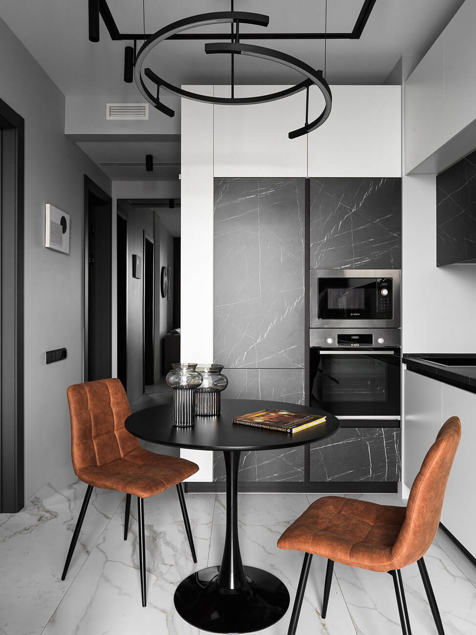 Рыжие стулья не только придают яркости монохромной палитре, но и становятся символом энергии и страсти. Они привносят внутренний огонь, дополняя общий характер мужской энергии.
