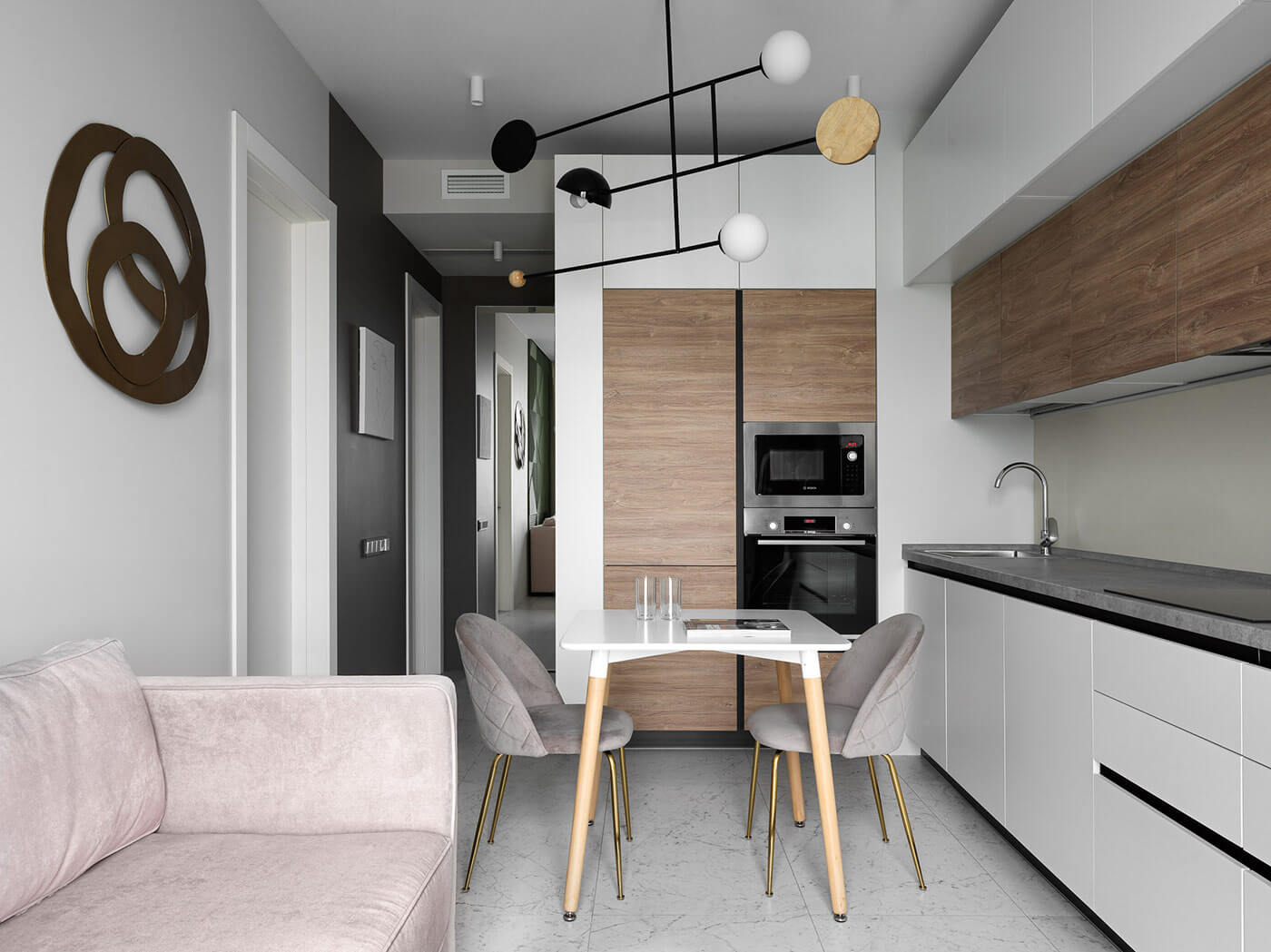 Две одинаковых квартиры оформлены по принципам китайского учения о единстве и борьбе противоположностей: мужское и женское, YIN & YANG — как две половинки одного целого. Квартира YIN из этого проекта — это истинное олицетворение женской энергии, окутанное атмосферой нежных пастельных оттенков. А квартира YANG — это воплощение мужской энергии, предстающей перед нами через монохром с контрастными акцентами.