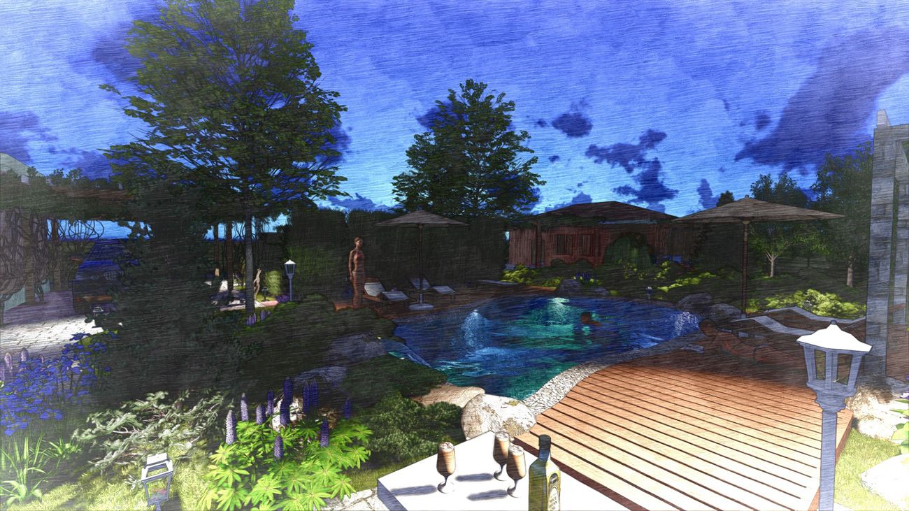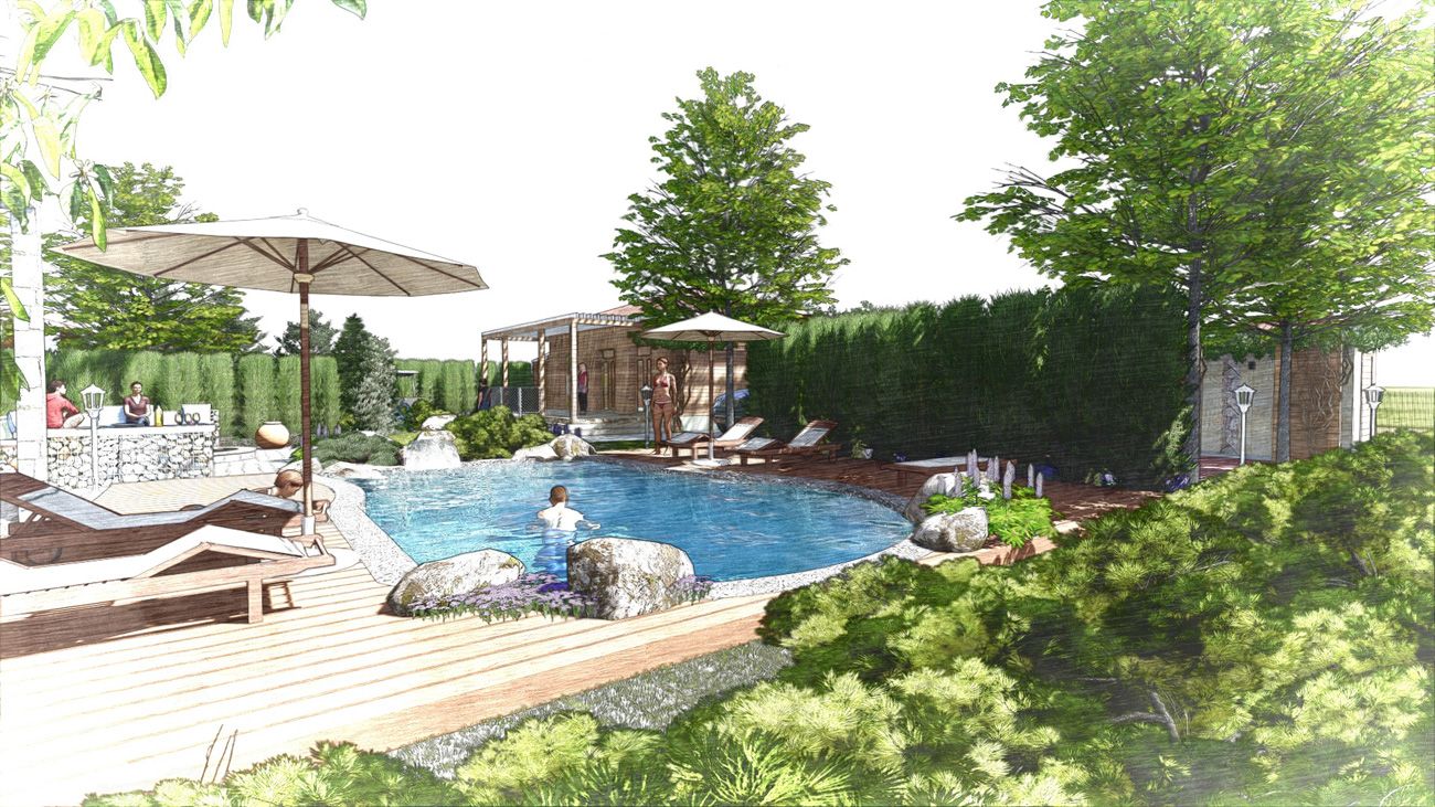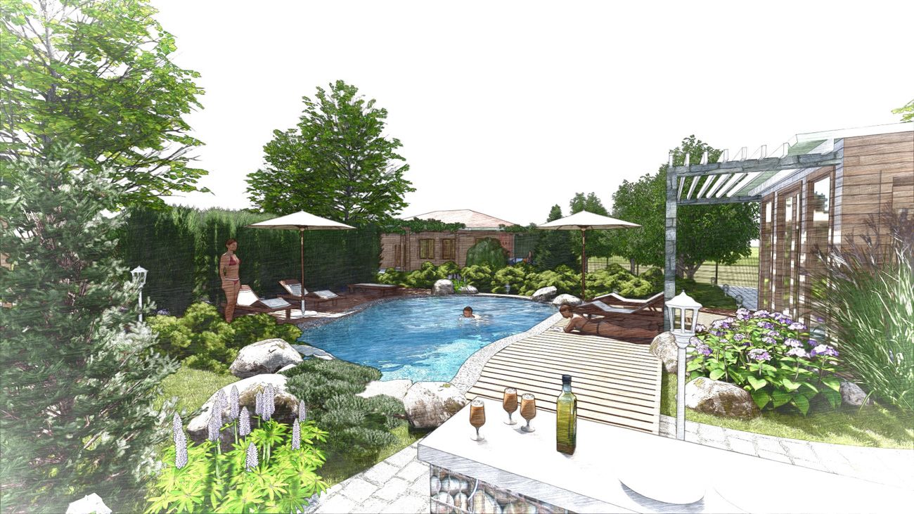 Так мы разработали в центре участка зону chillout с кострищем и садовыми скамьями из габионов; зону плавательного пруда с небольшим водопадом, вытекающим из камней-валунов, которая располагается около банного комплекса; детскую площадку в тени крупных деревьев, защищенную со стороны парковки и пруда живыми изгородями из купрессоципариса. В тени крымских сосен расположили беседку для небольших компаний. Благодаря обилию хвойных растений (сосны, можжевельники) это место идеально для фитотерапии.