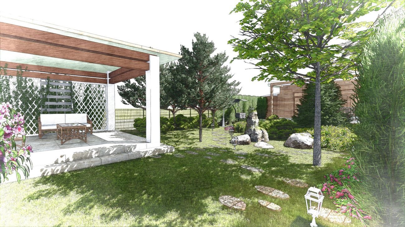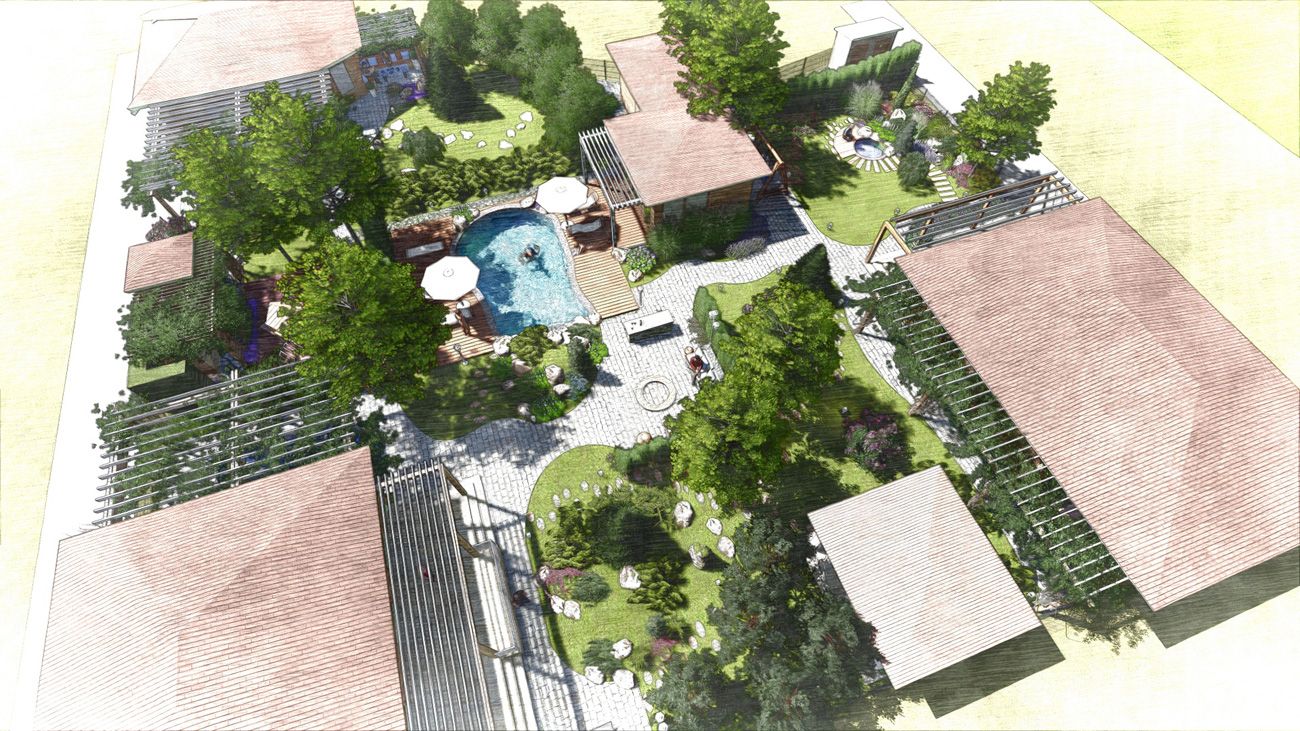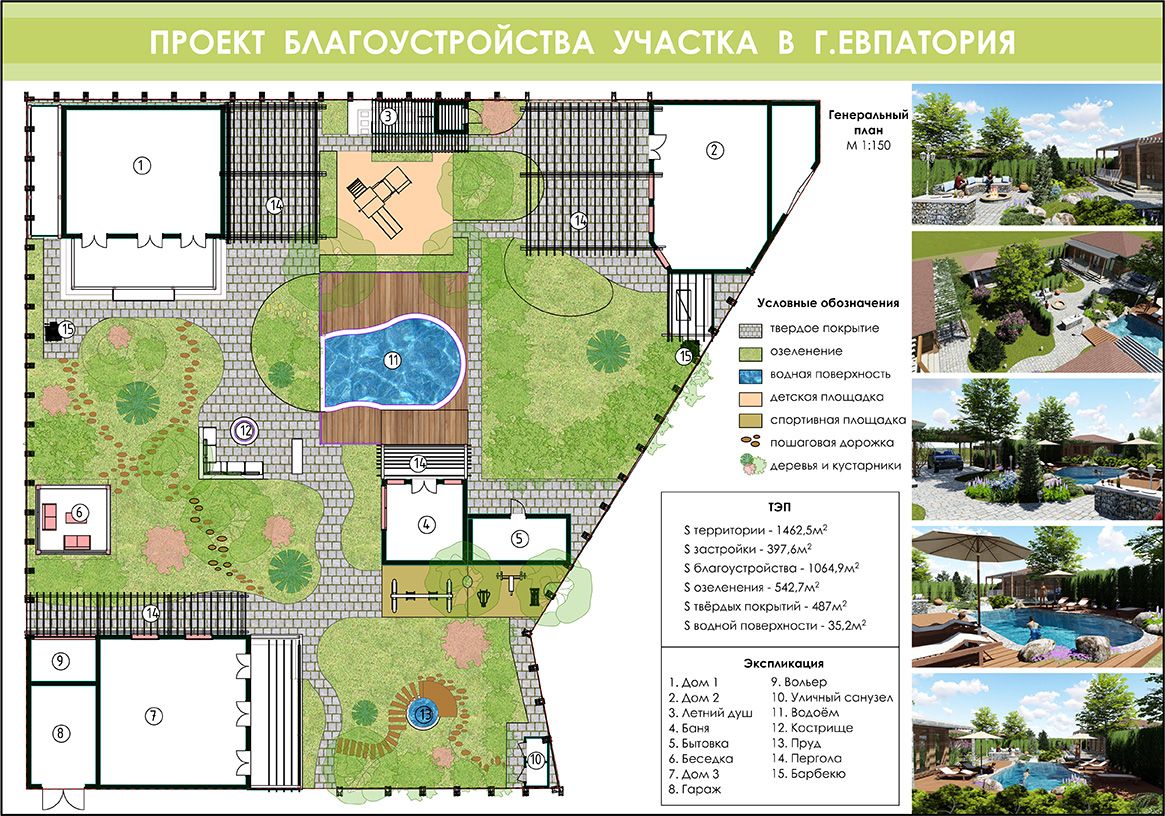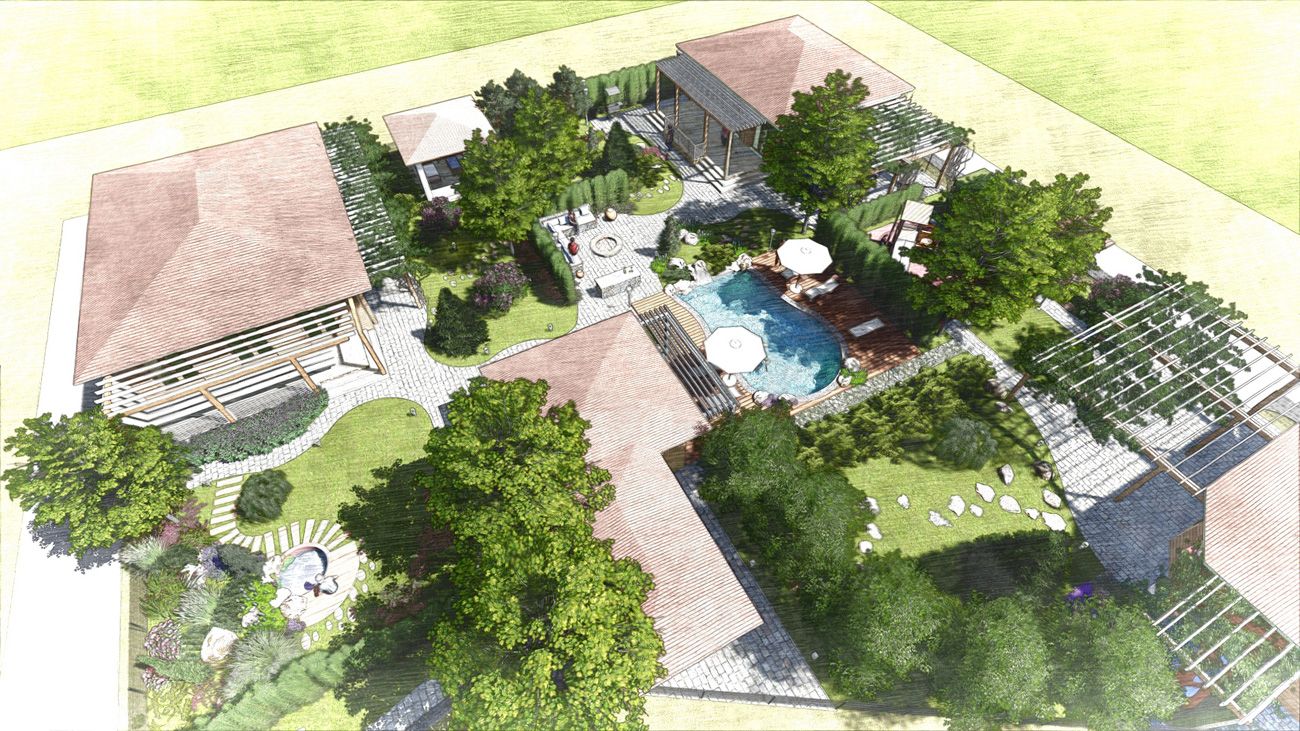 Общая идея благоустройства заключалась в том, чтобы разделить общую территорию на уютные зоны для каждого из 3 коттеджей и организовать несколько зон для общего использования всеми отдыхающими.