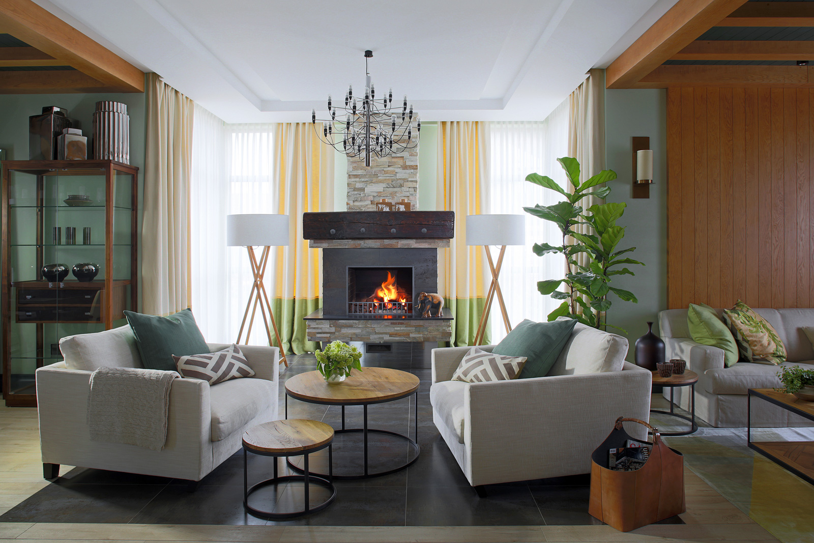 Просторная гостиная разделена на несколько зон. Ее центром служит дизайнерский камин. Рядом находится телевизионная зона, для обшивки стен которой использованы дубовые доски. Напольный ковер у дивана продолжает природную тему: его фактура и нежно-салатовый оттенок напоминают сочный лесной мох. Декоративные подушки на диване перекликаются по цвету с ковром. Особую гармонию и свежесть в интерьер привносит комнатное растение в напольной вазе.