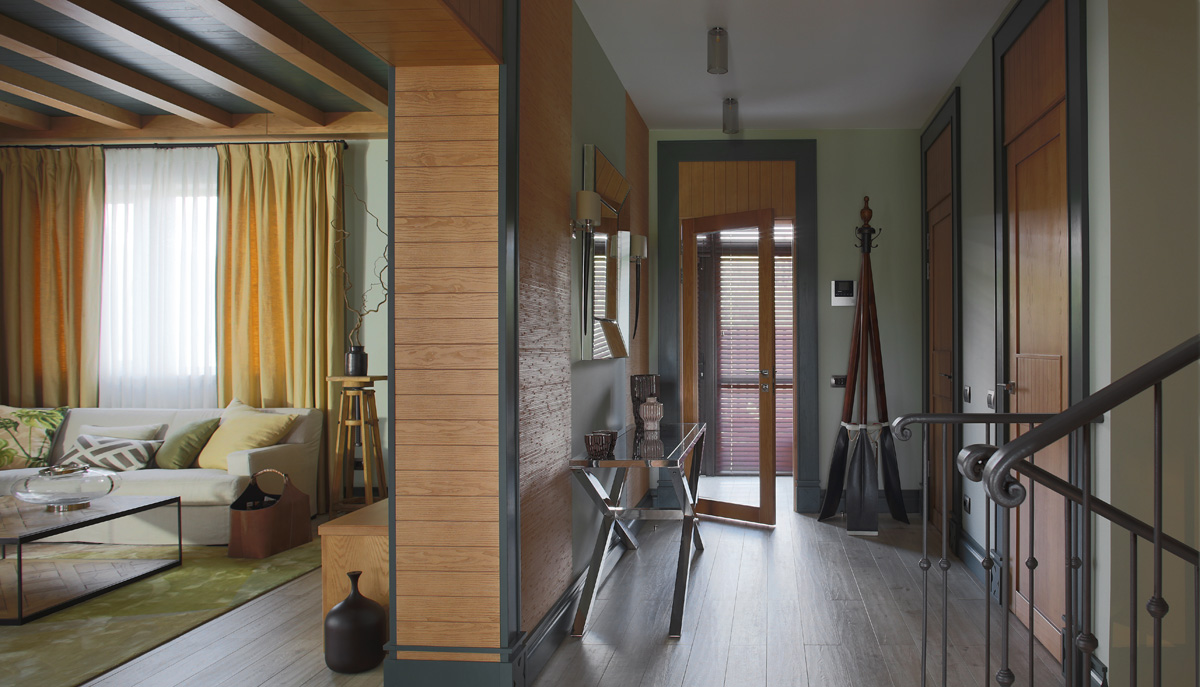 Заказчики приобрели дом в коттеджном поселке, построенный по типовому проекту. Они хотели получить уютное жилое пространство для нескольких поколений семьи. Данная концепция реализована благодаря использованию натуральных материалов — дерева, камня, текстиля — и современных приемов оформления, подчеркивающих принадлежность интерьера к загородному жилью.