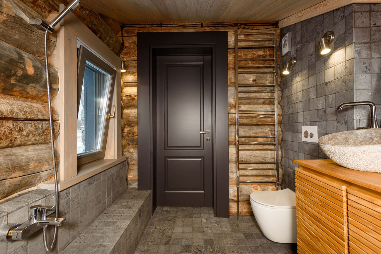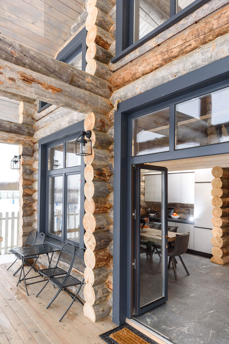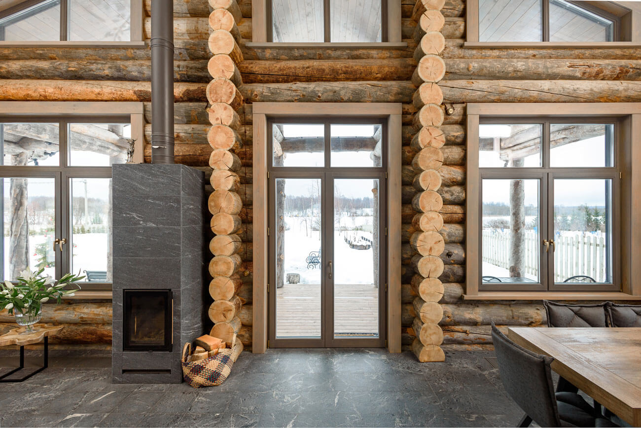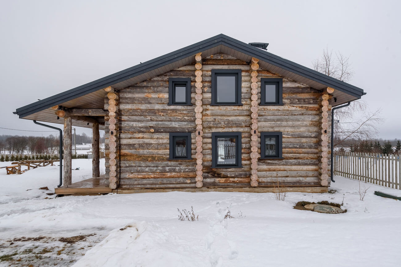 Наличники на окнах и доборы сделаны из лиственницы и покрыты кроющей серой краской. Выглядит стильно, правда?