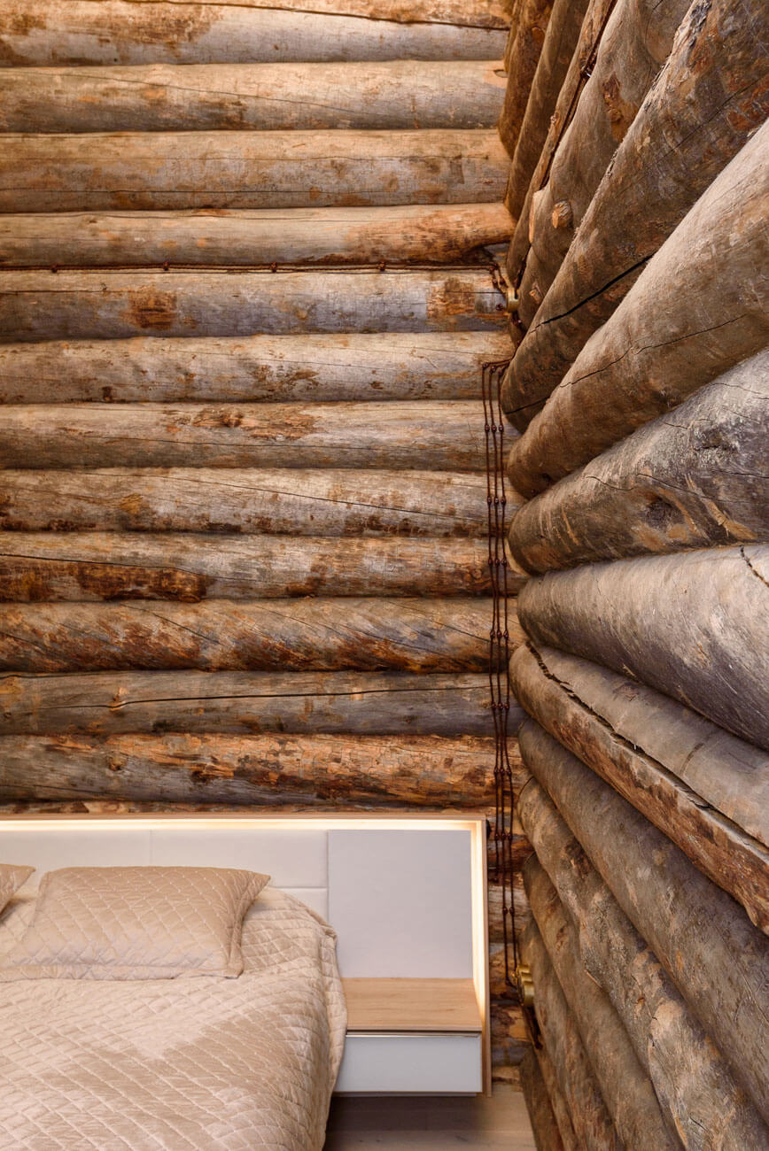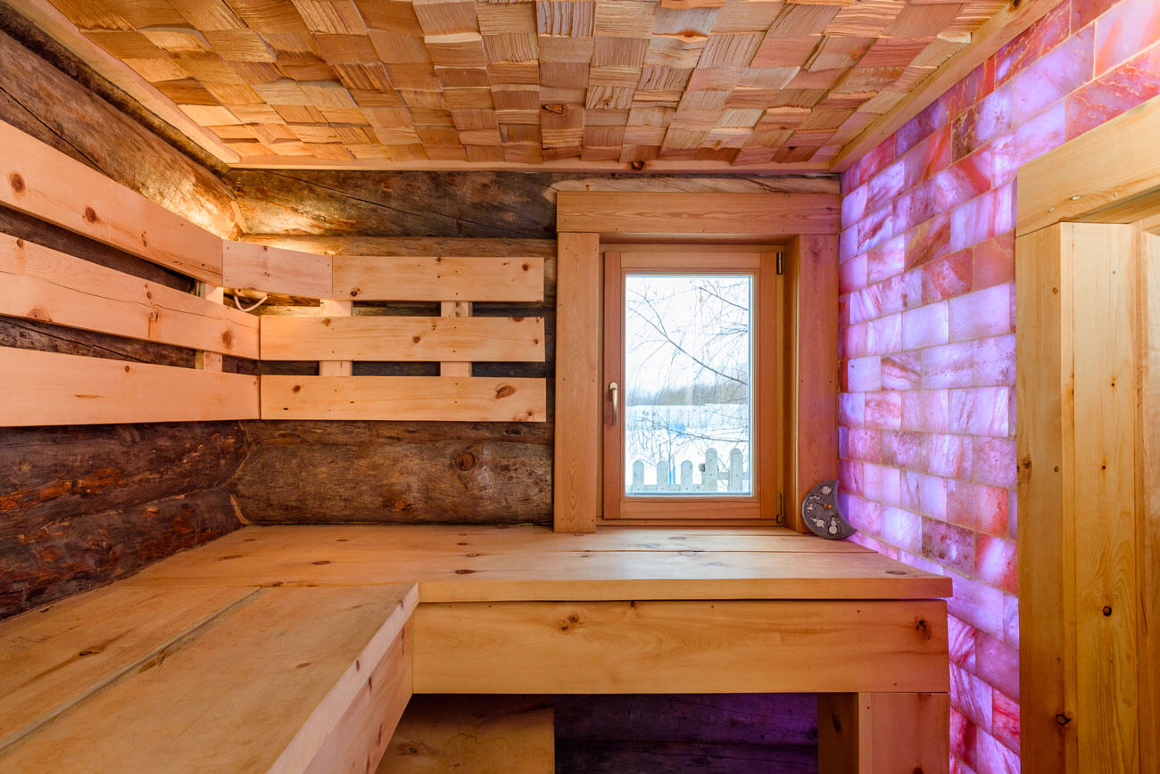 В парной установлена финская печка с закрытой топкой, но с открытыми камнями. Массивные, но достаточно лаконичные полоки выполнены из кедровой доски 50 мм. Обратите внимание на потолок: он отделан колотым кедром. Дополнительное украшение парной – это стена из гималайской соли с подсветкой.