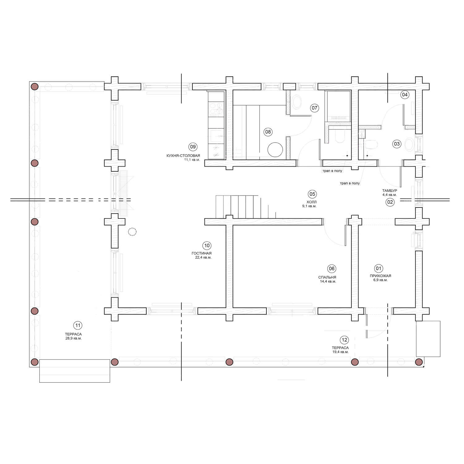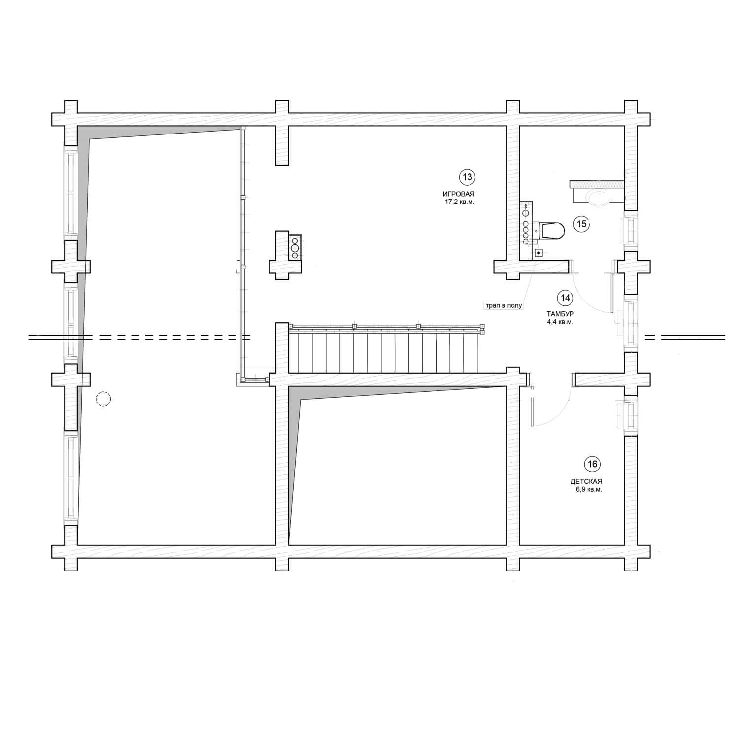 Композиционно объект состоит из просторной кухни-гостиной, хозяйской спальни, детской, игровой и банной зоны. Некоторые решения нам уже знакомы, например, большая обходная терраса.