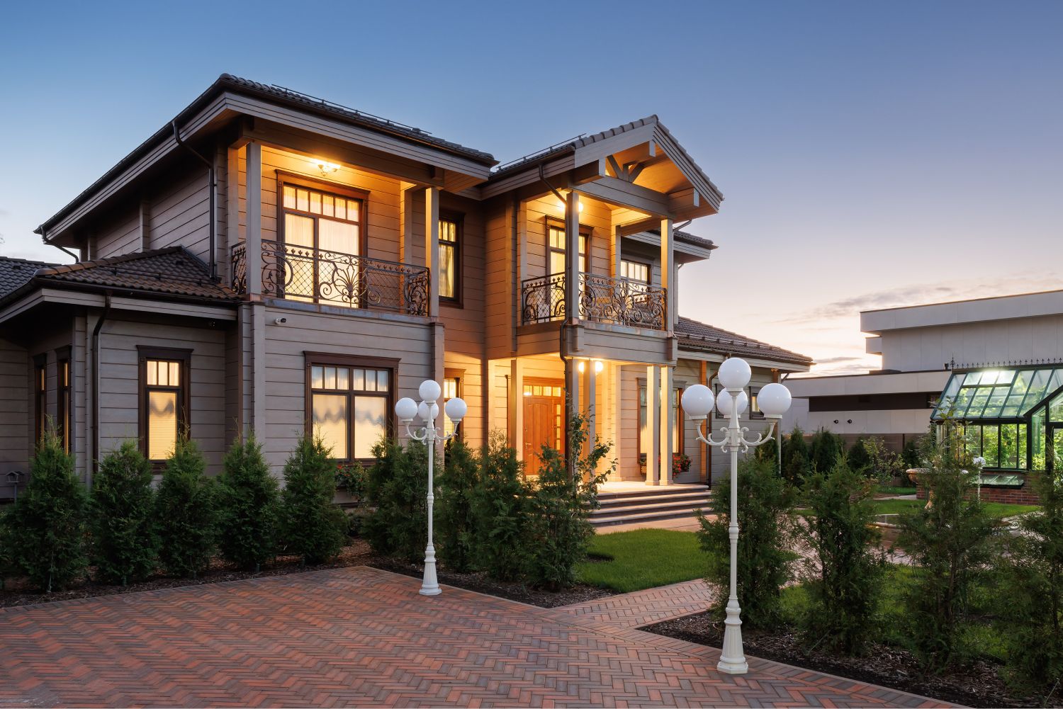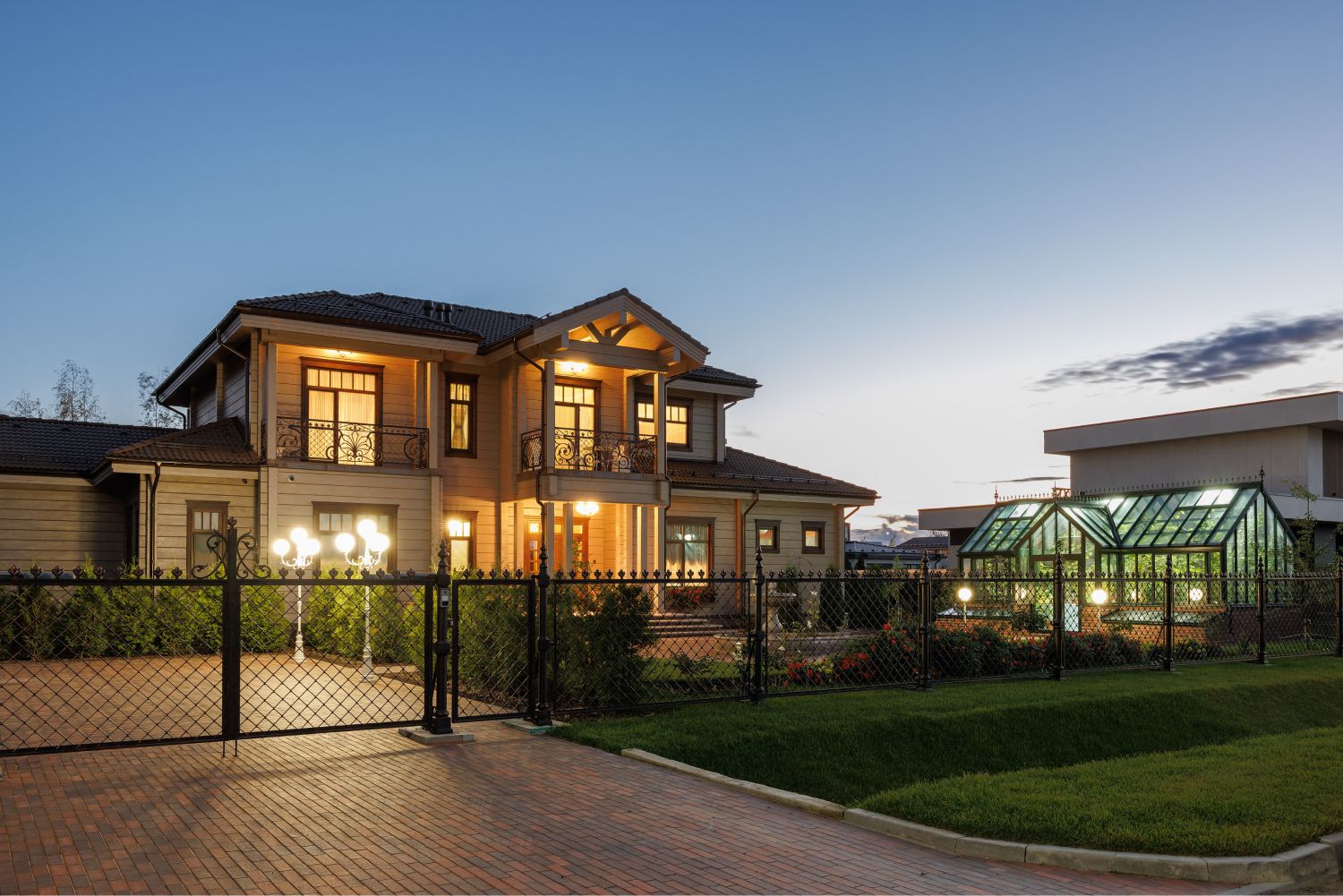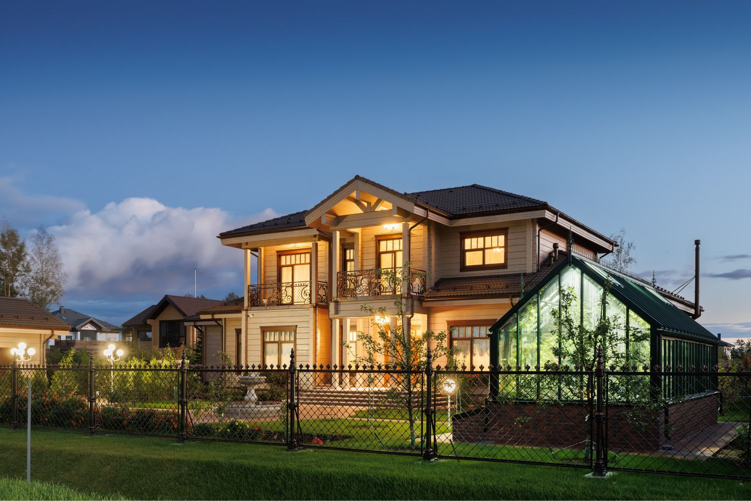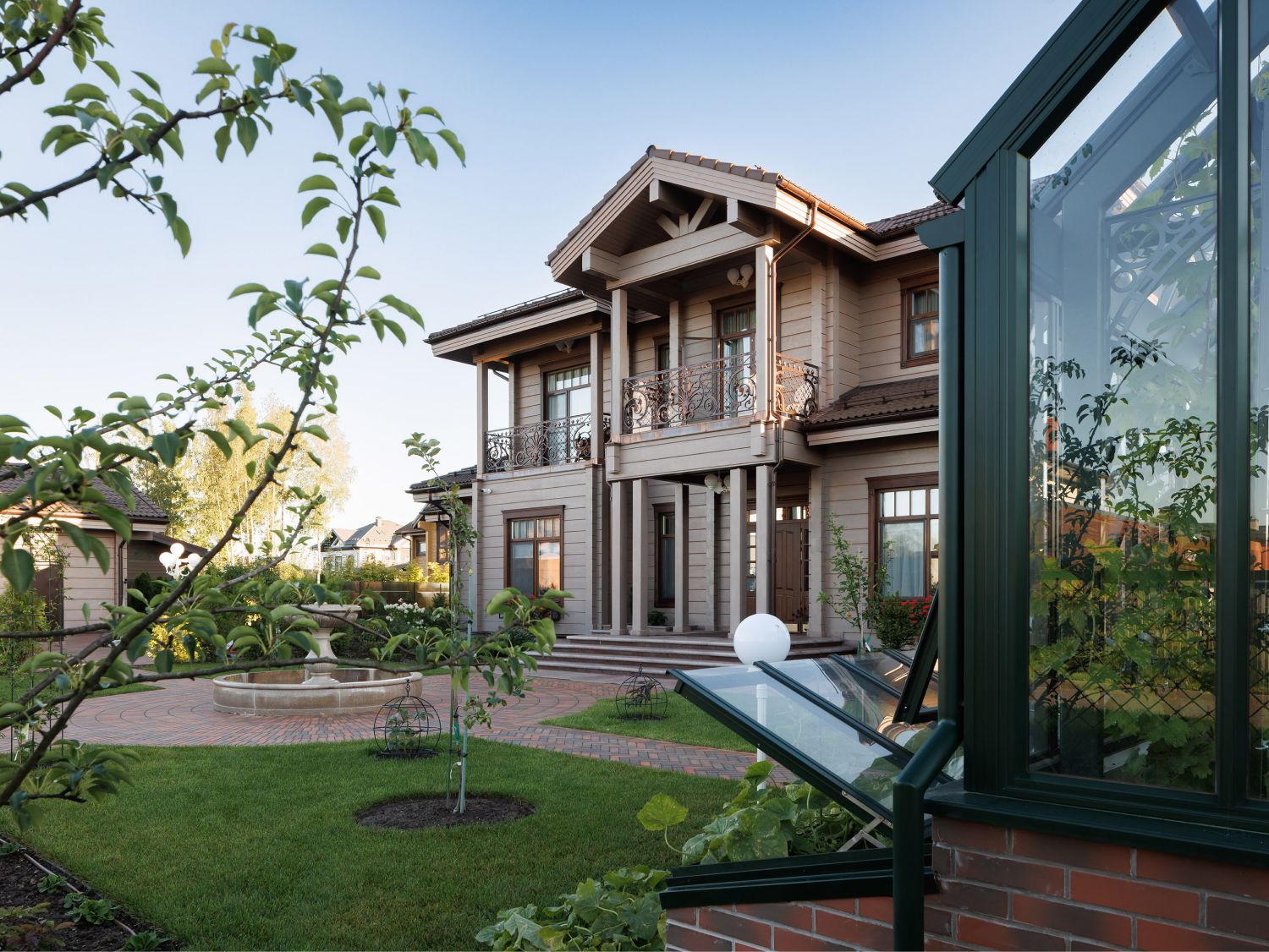 В оформление фасадов дома и ограждения участкабыли деликатно добавлены элементы кованого декора, выполненные вручную по оригинальным историческим моделям. Уделялось внимание каждой мелочи, поэтому даже выбор ткани для маркиз сталоммажемтрадиционному летнему оформлению Петергофских великокняжескихрезиденций. Размещенная рядом с домом аутентичная английская теплица, стала естественным продолжением этой темы.