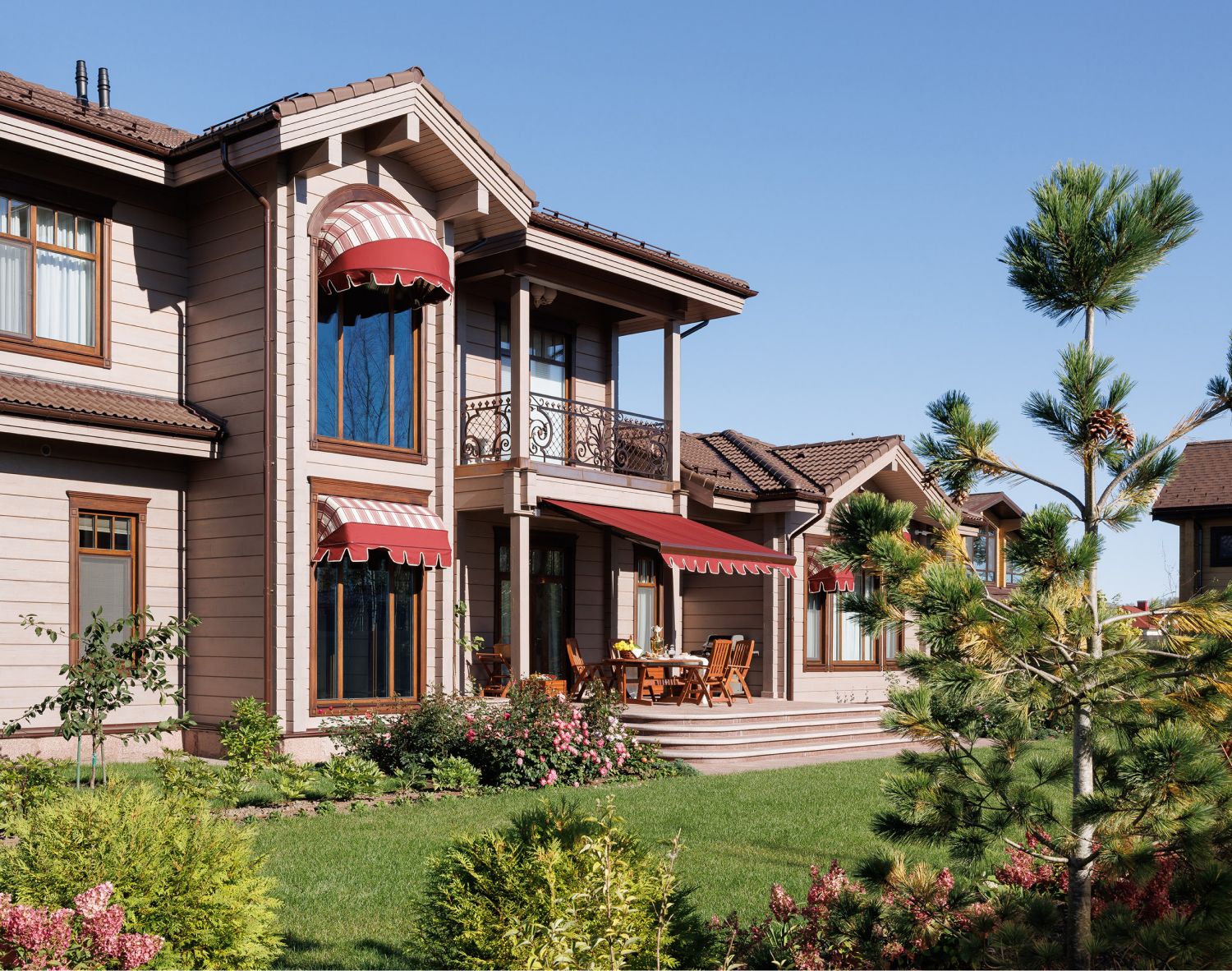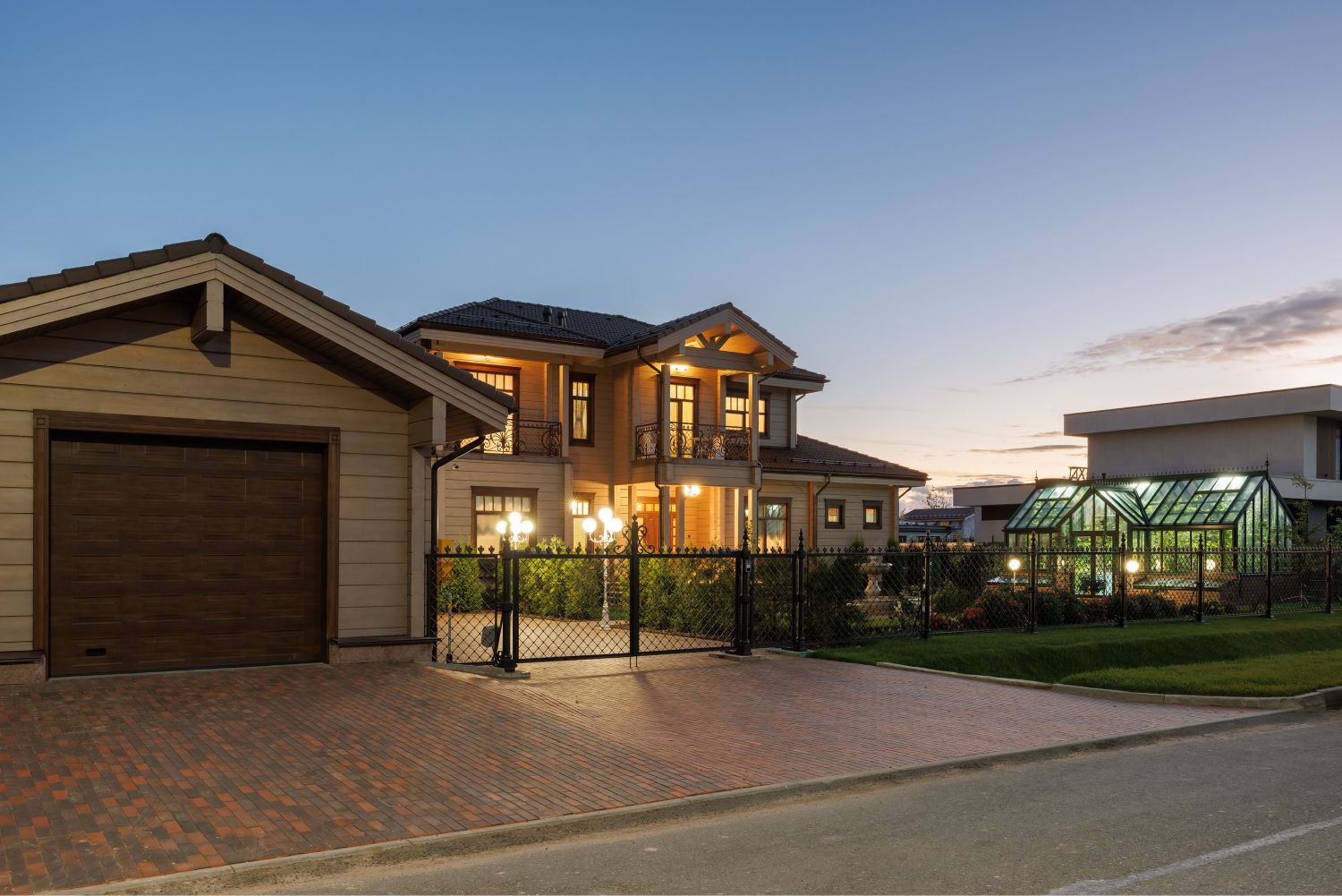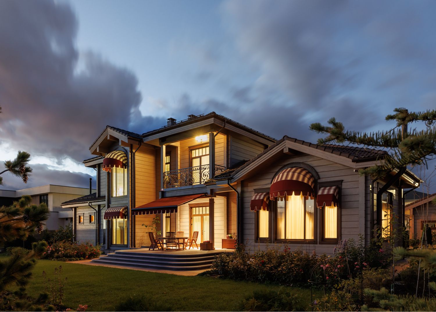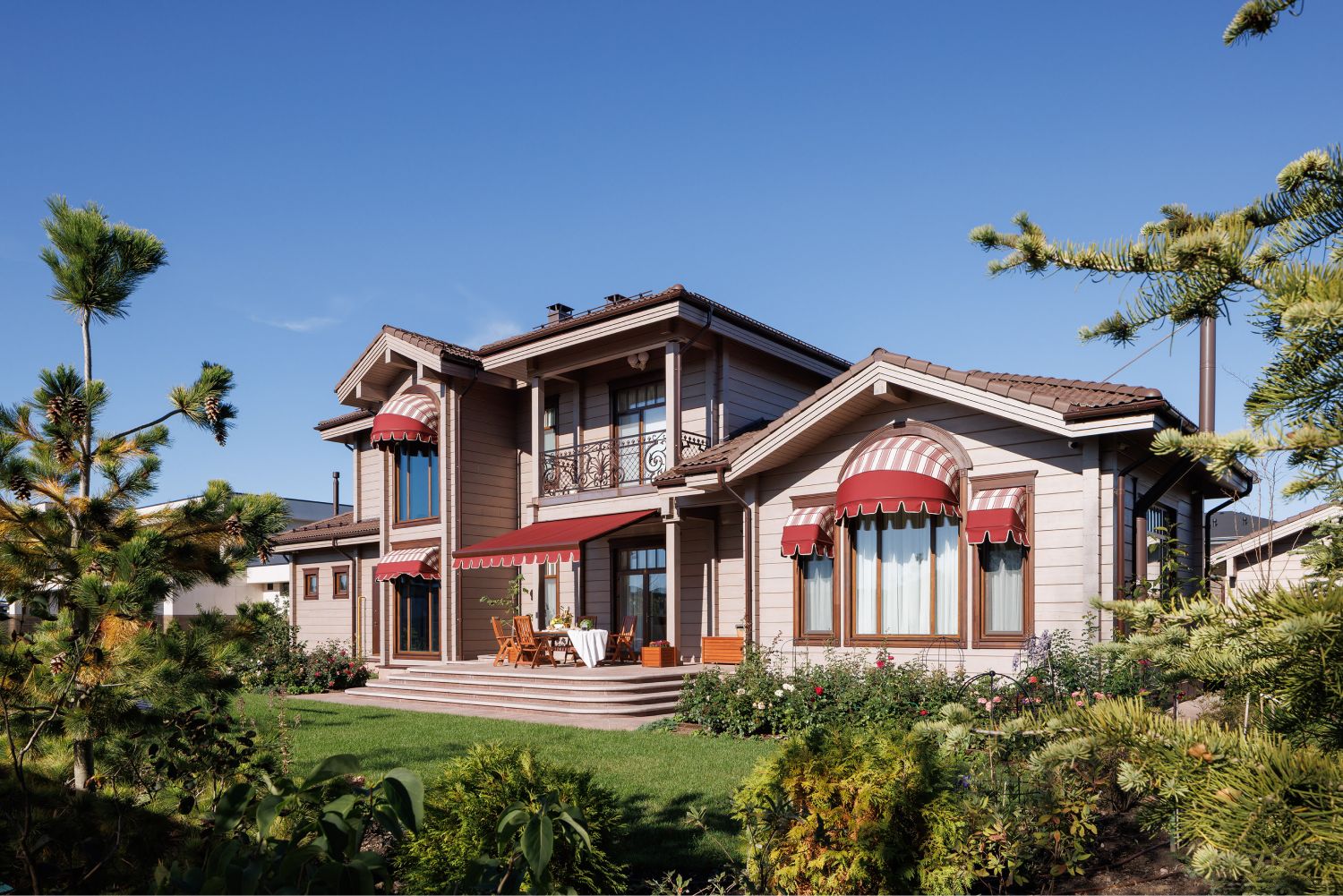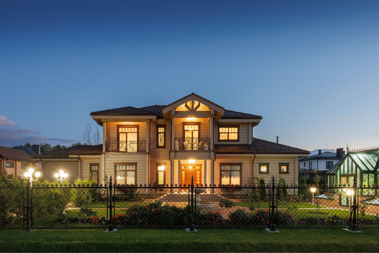 В оформление фасадов дома и ограждения участкабыли деликатно добавлены элементы кованого декора, выполненные вручную по оригинальным историческим моделям. Уделялось внимание каждой мелочи, поэтому даже выбор ткани для маркиз сталоммажемтрадиционному летнему оформлению Петергофских великокняжескихрезиденций. Размещенная рядом с домом аутентичная английская теплица, стала естественным продолжением этой темы.