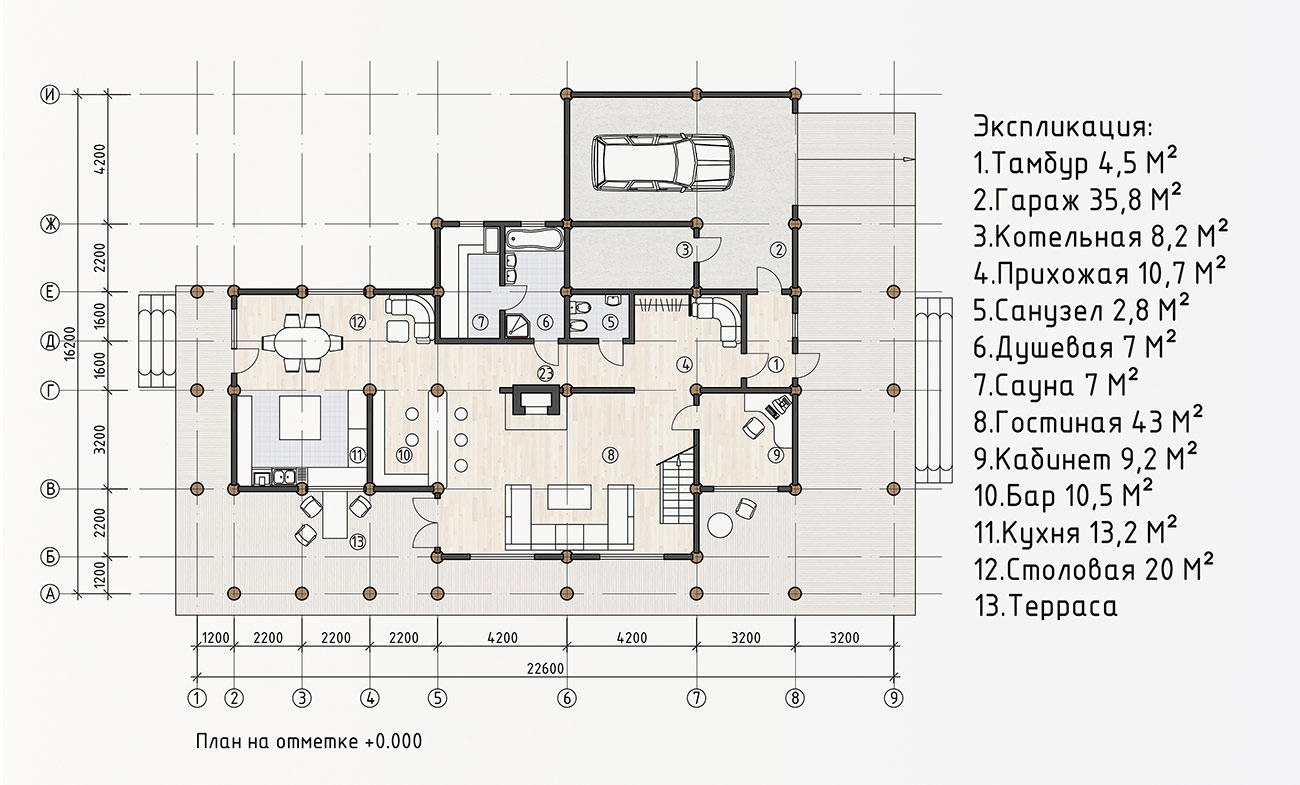 Общая площадь интерьерного пространства — 306 м², включая гараж и тех. комнату.