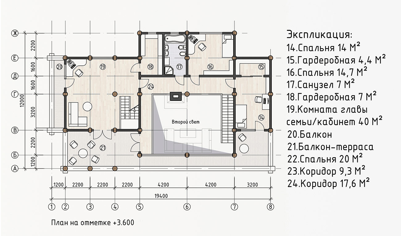 Второй этаж занимают спальни и дополнительный санузел. Комната главы семьи/кабинет (помещение 19 на экспликации) выполнена в 2 уровнях со вторым светом.