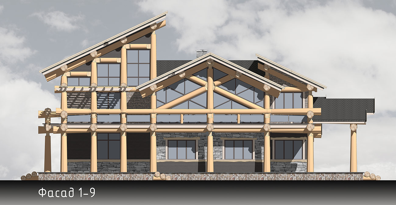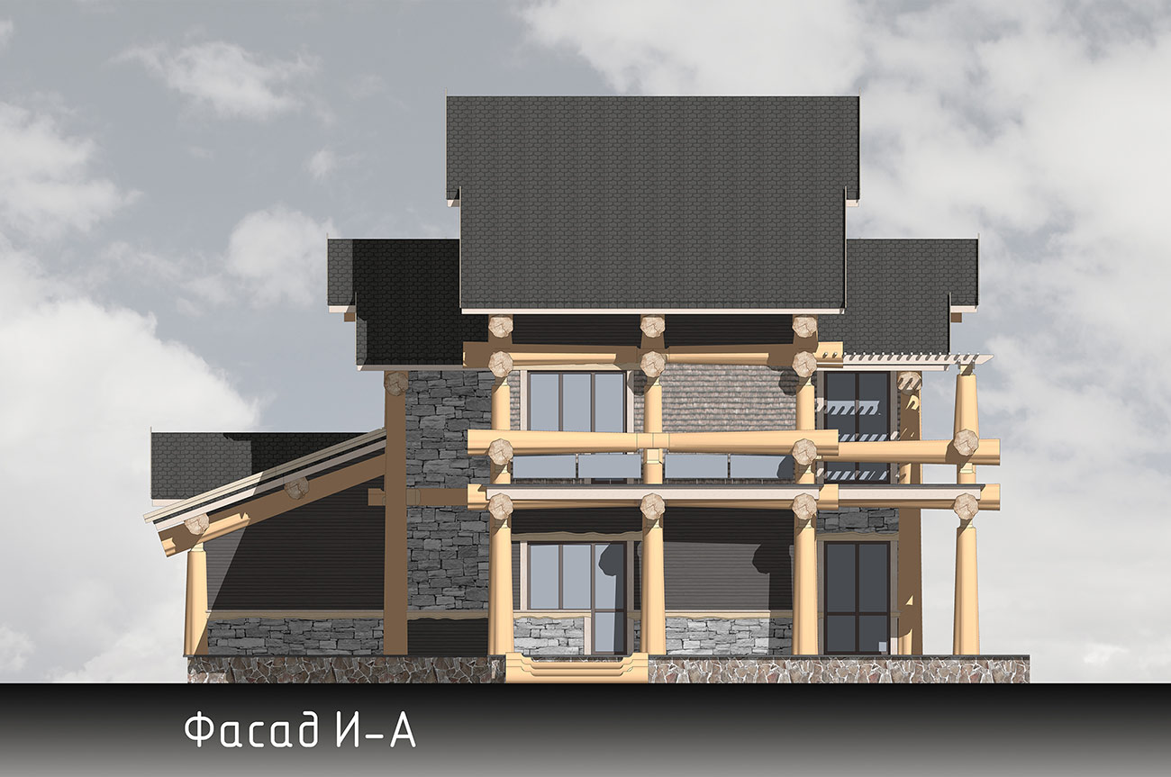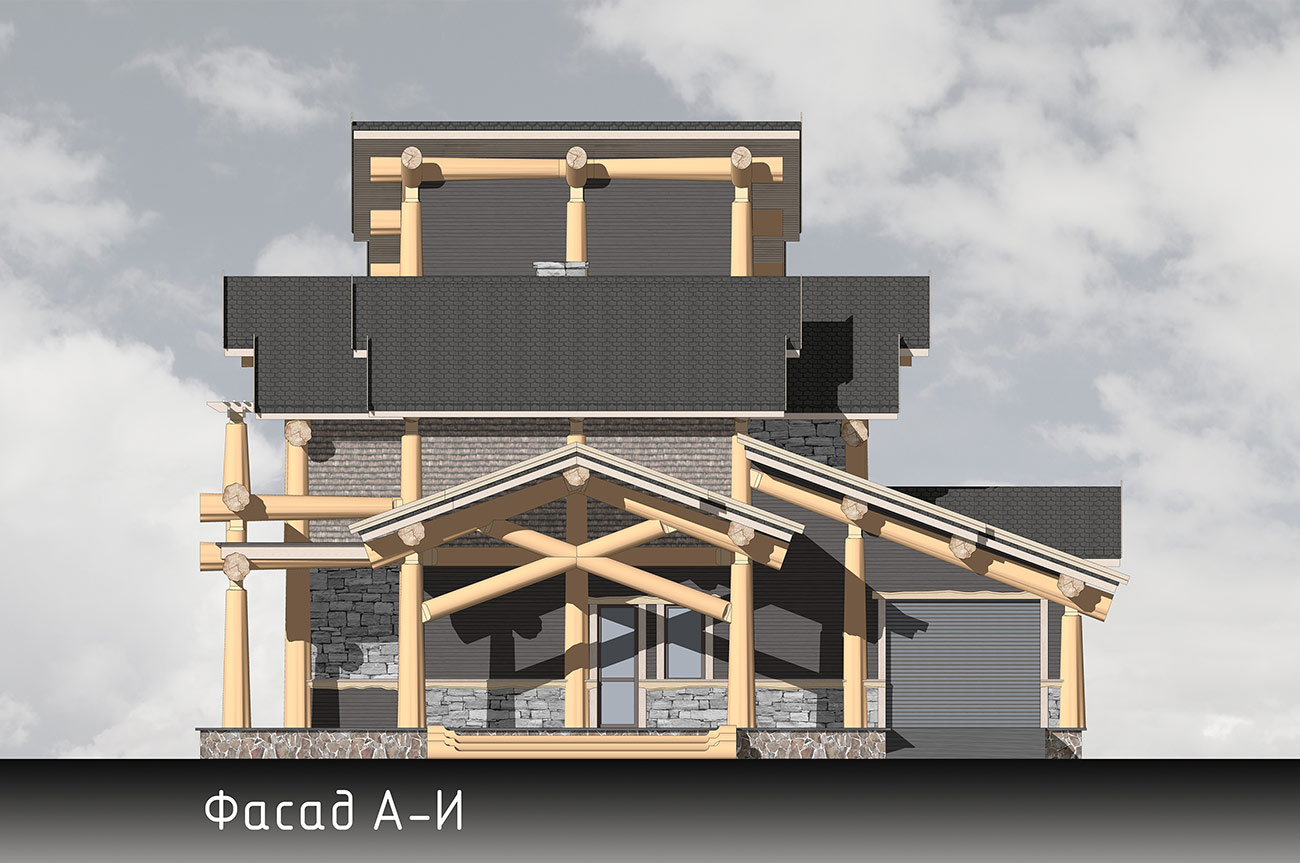 Дом спроектирован в 2 этажа, второй этаж мансардный с видимыми бревенчатыми элементами конструкции кровли.