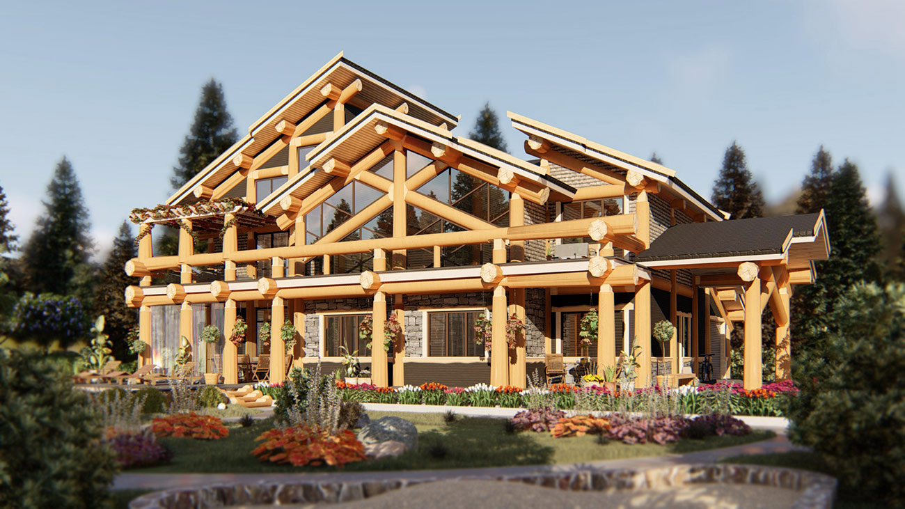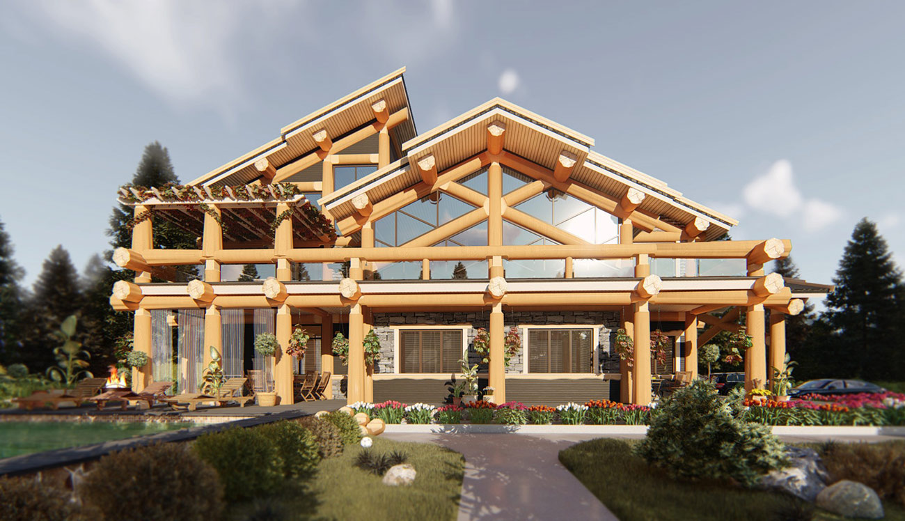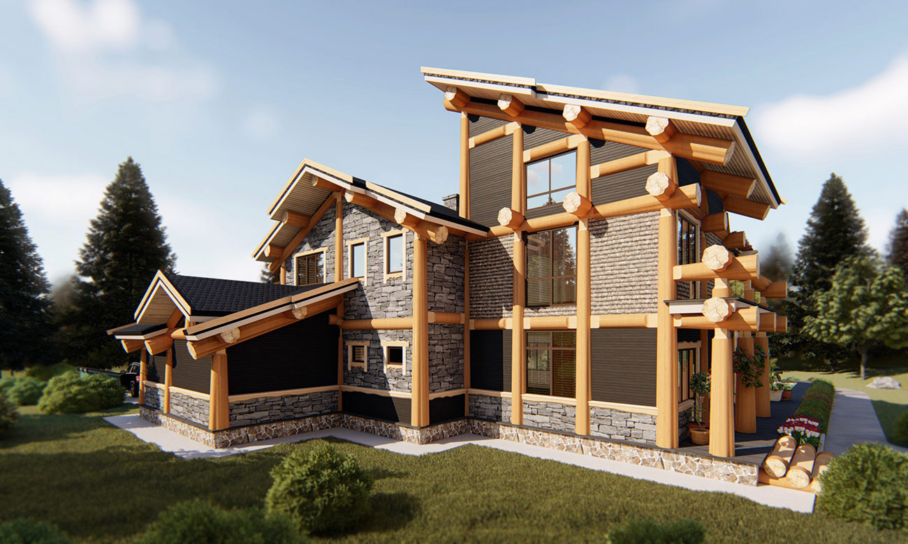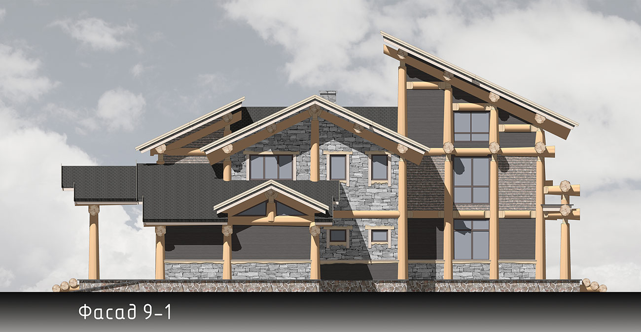 Дом спроектирован в 2 этажа, второй этаж мансардный с видимыми бревенчатыми элементами конструкции кровли.