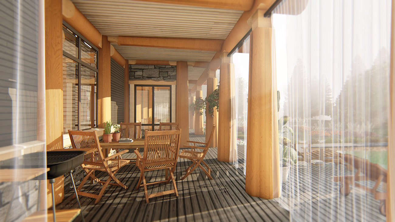 Второй этаж с юга окружен просторным балконом с навесом из пергол с живым озеленением.