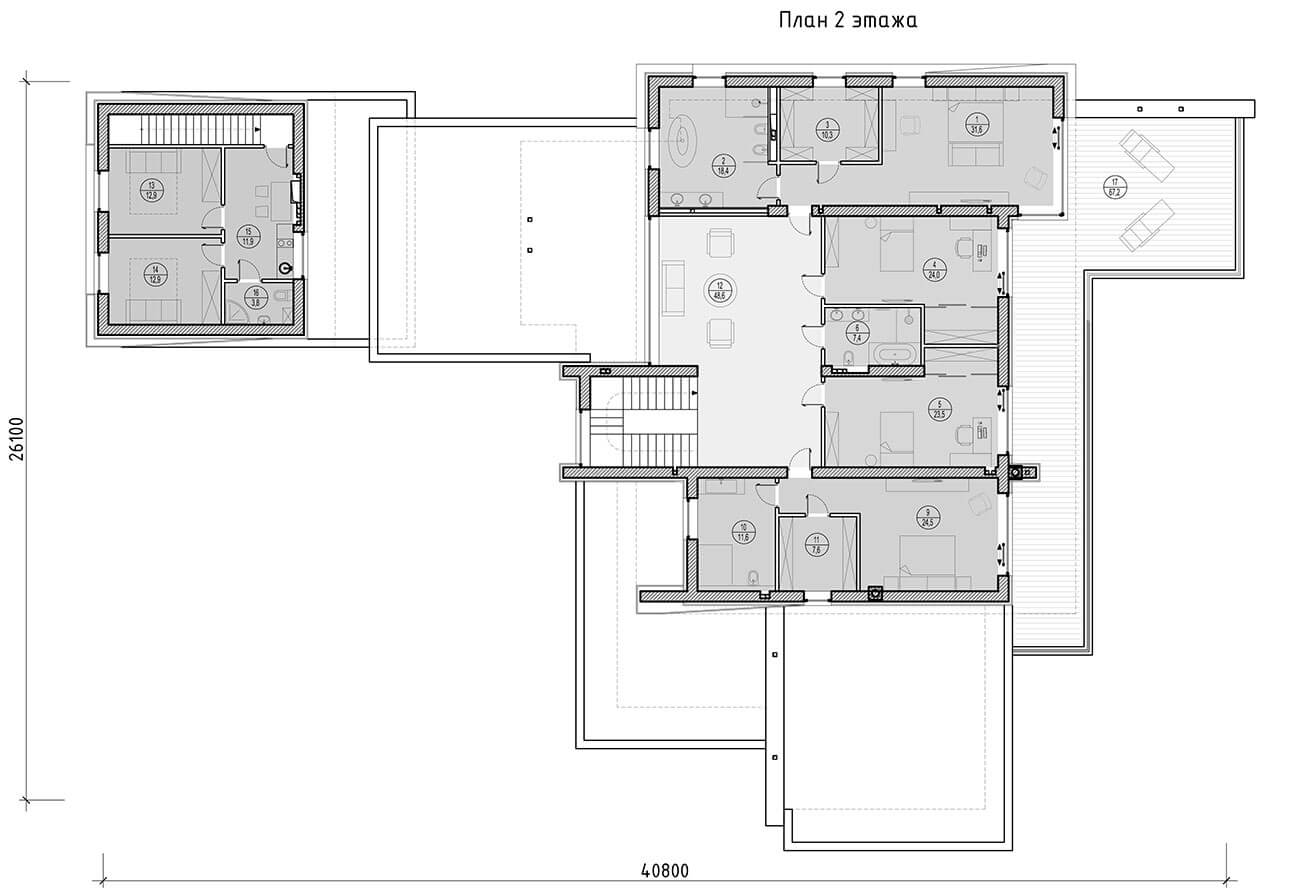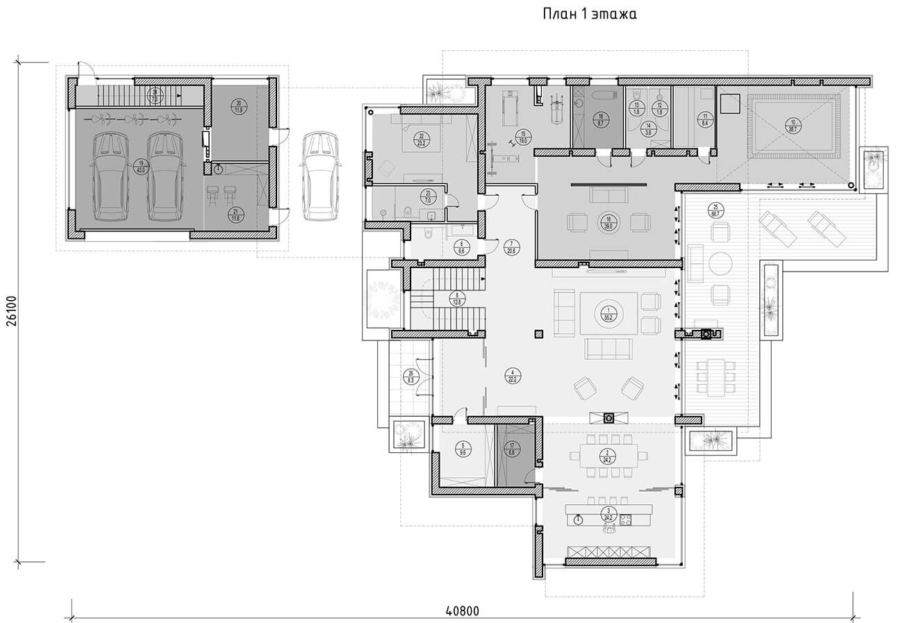 На 1-м этаже при входе — общественная зона с большой гостиной, столовой и кухней, в отдельном пространстве находится кабинет, гостевая комната и спа-зона с сауной и джакузи, просторной комнатой отдыха, из которой есть выход на террасу. На втором этаже располагается приватная зона с большой главной спальней, двумя детскими с собственными гардеробными и гостевая спальня.