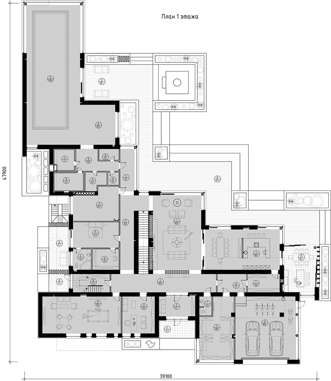 На 1-м этаже при входе находится общественная зона с большой гостиной, столовой и кухней, в отдельной зоне — кабинет, гостевая комната и спа-зона с бессейном, сауной и хаммамом, просторной комнатой отдыха, из которой есть выход на террасу и площадку с очагом.