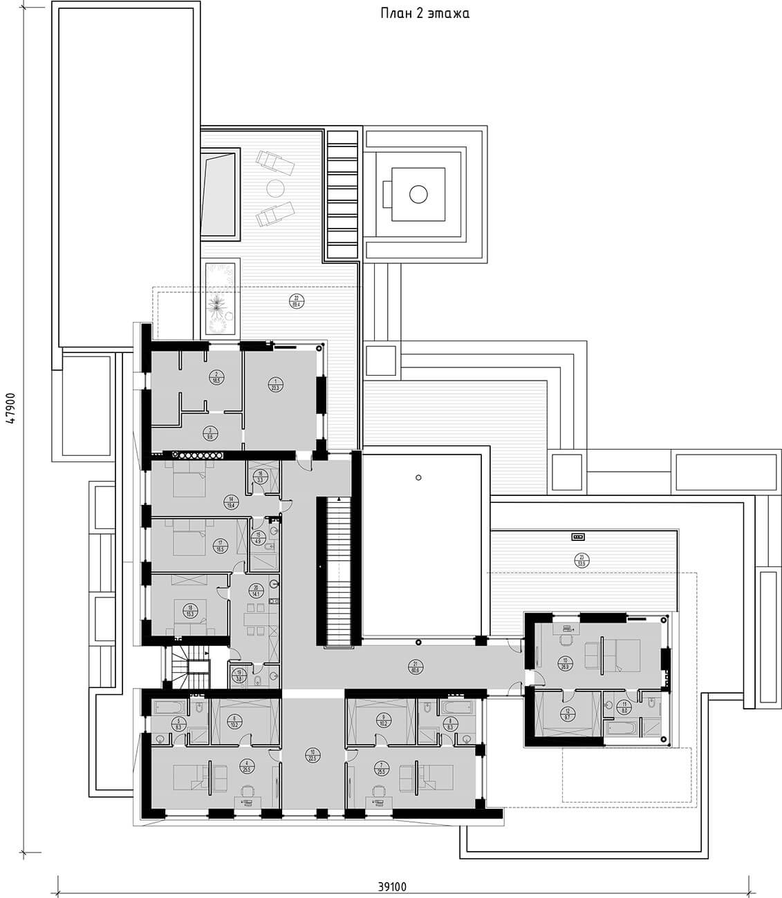 Второй этаж приватный, с большой главной спальней и тремя детскими с собственными санузлами и гардеробными.