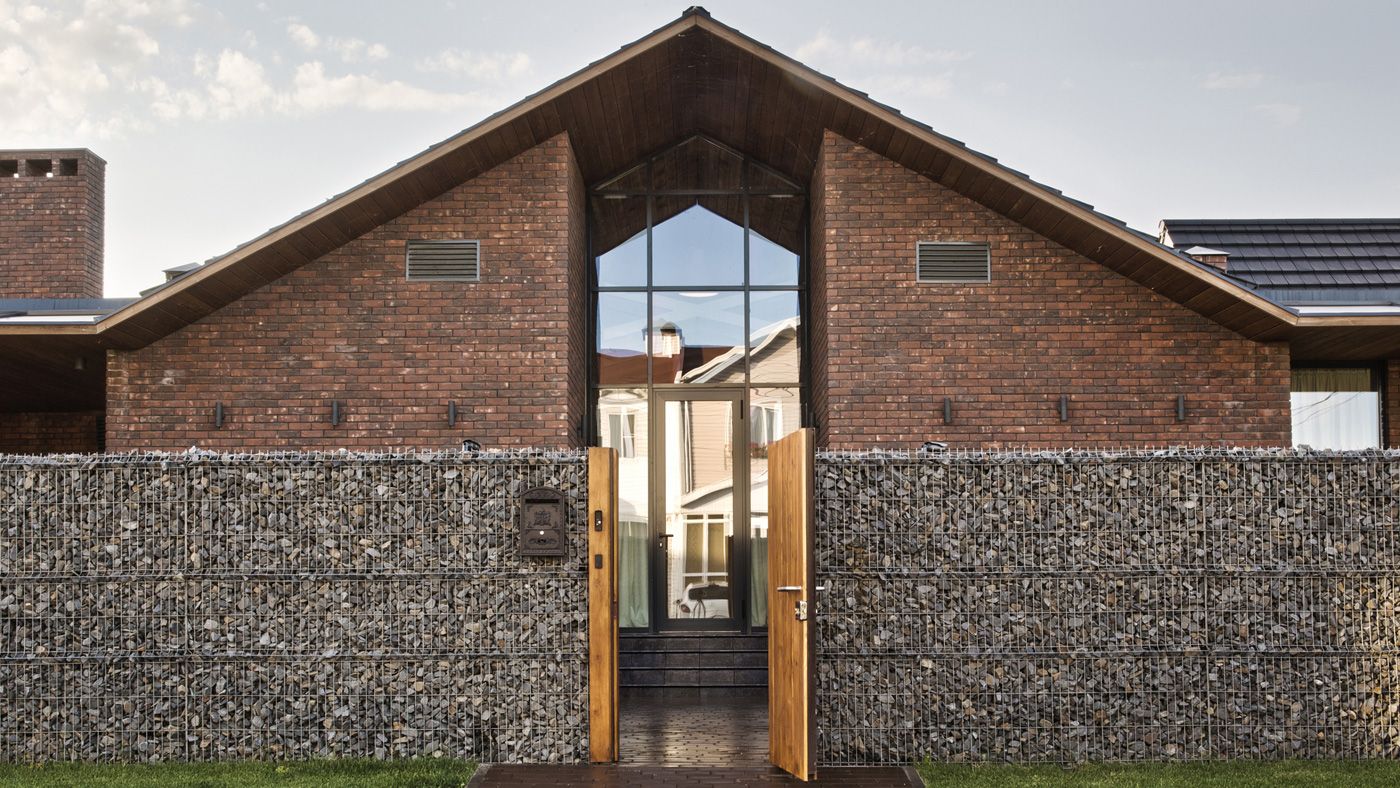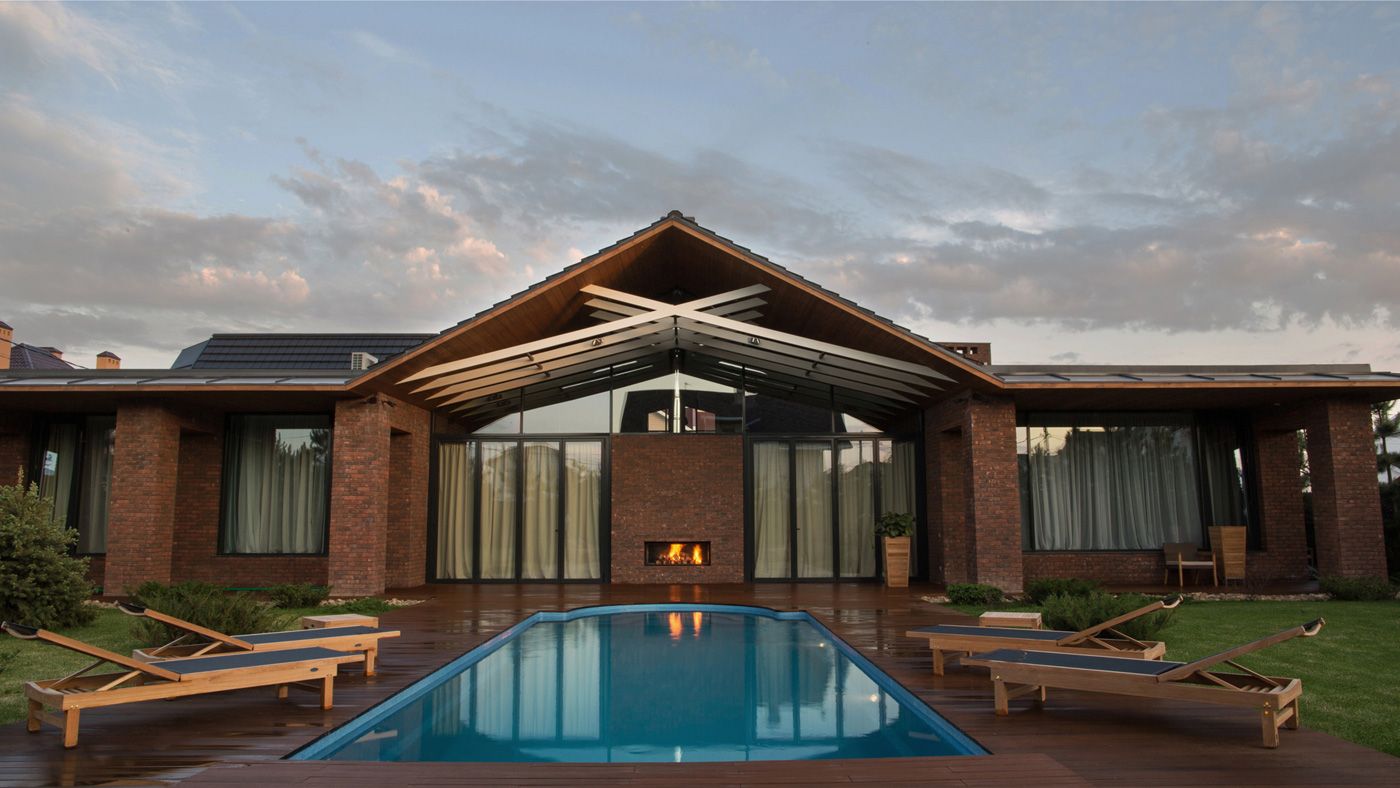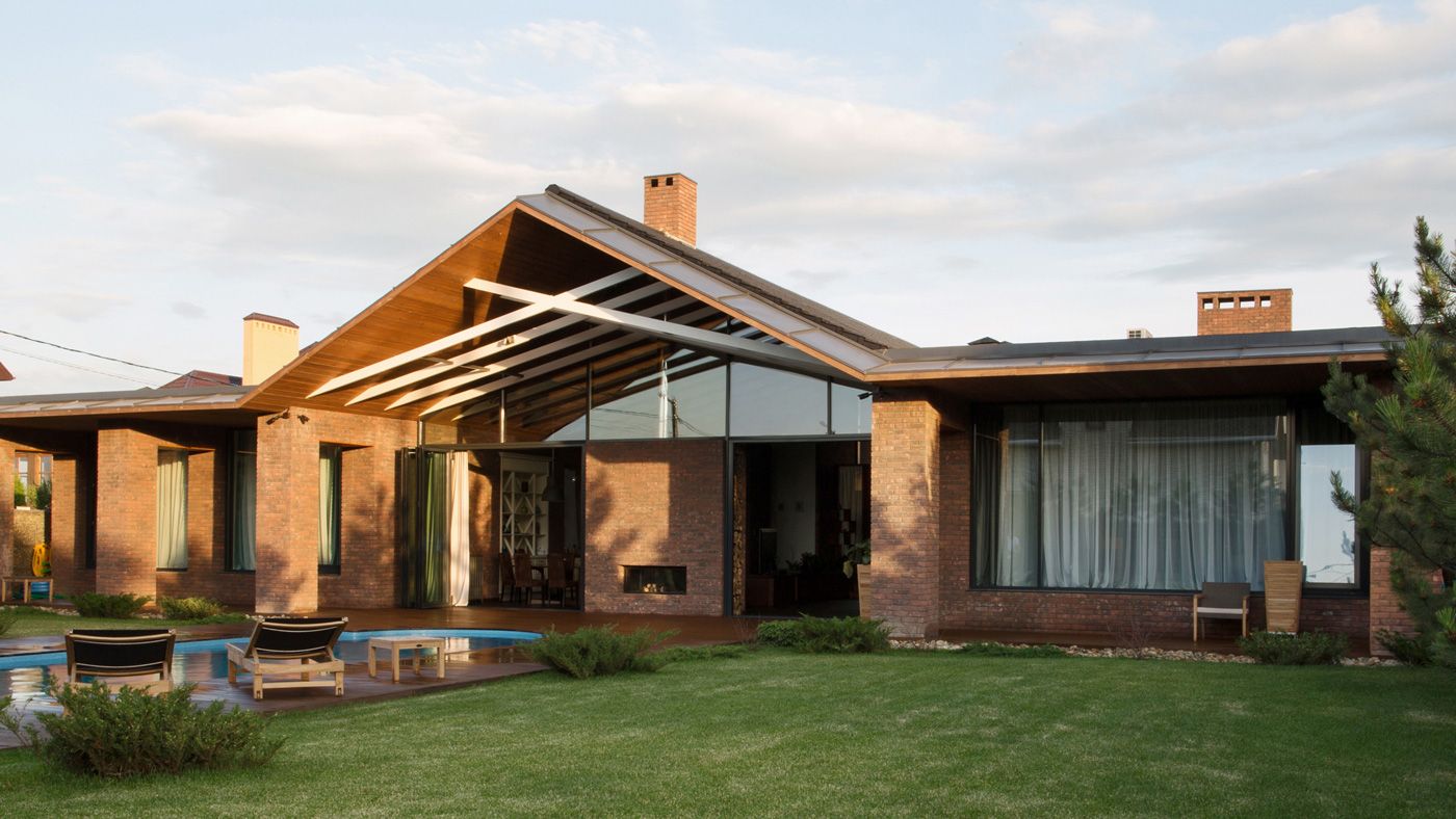 В архитектуре загородного дома обыграны контрасты: монументальность и легкость, традиции и современность. Стены облицованы кирпичом ручной формовки, который эффектно сочетается с огромными витражами. Балки оставлены обнаженными, крыша подшита тонированной доской.