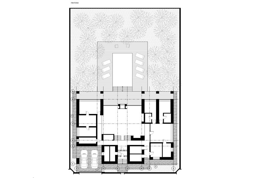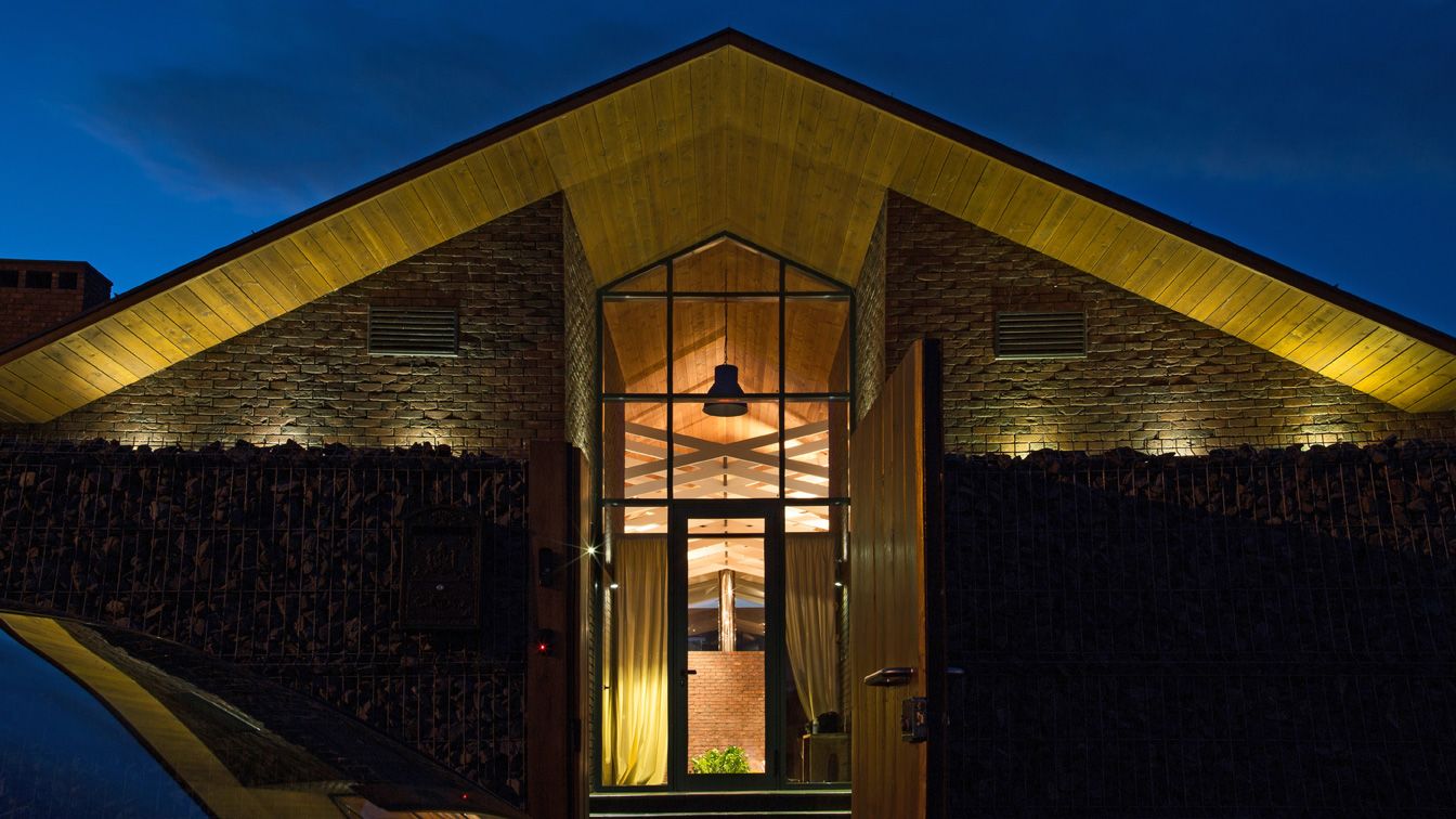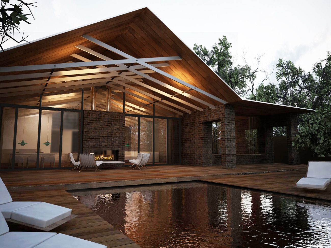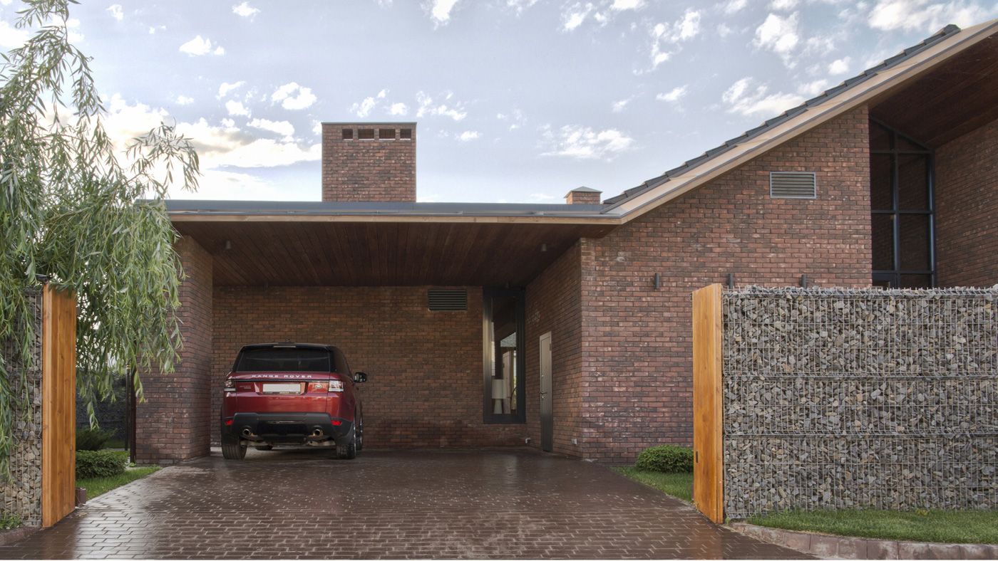 В архитектуре загородного дома обыграны контрасты: монументальность и легкость, традиции и современность. Стены облицованы кирпичом ручной формовки, который эффектно сочетается с огромными витражами. Балки оставлены обнаженными, крыша подшита тонированной доской.