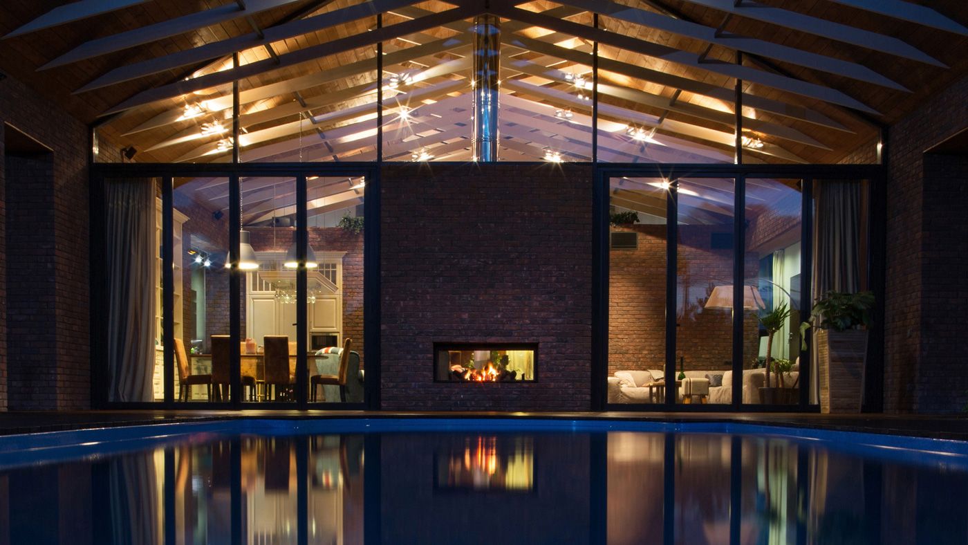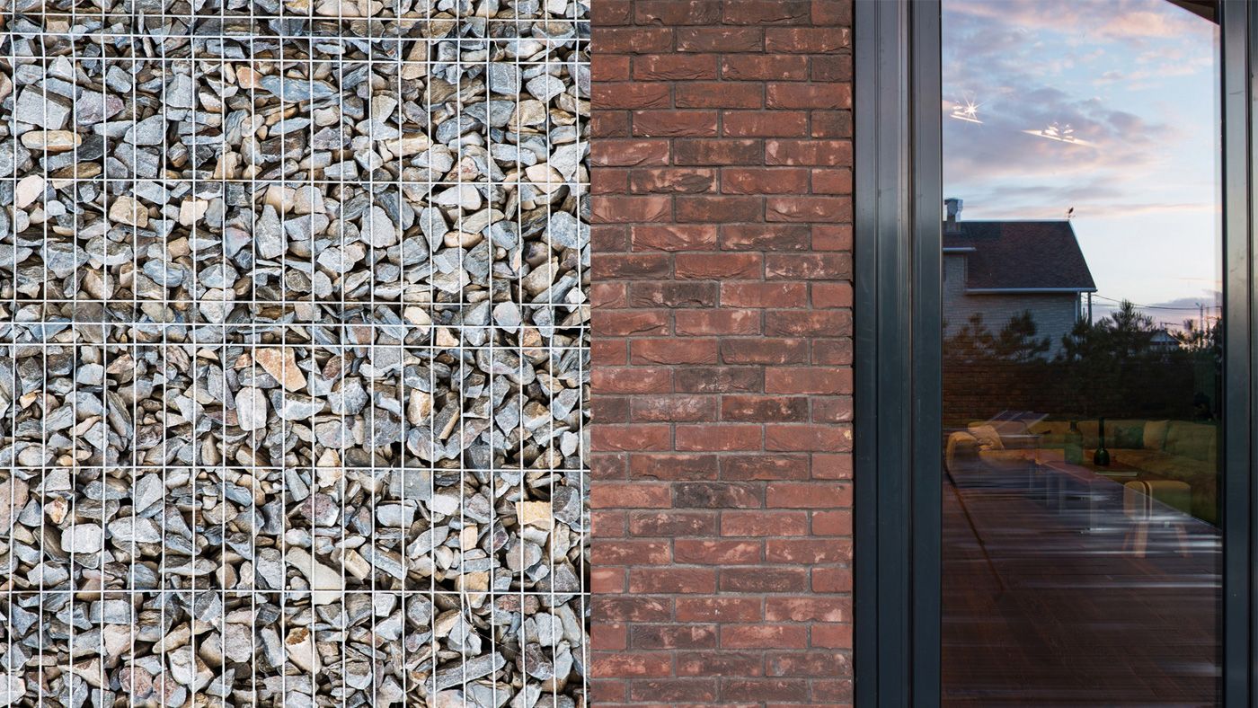 Несмотря на визуальную «прозрачность» архитектуры, дом оснащен продуманной системой отопления и способен достойно выдерживать настоящие русские зимы: обогрев обеспечивают конвекторы под окнами, настенные радиаторы, теплые полы. Еще одно интересное решение, функциональное и декоративное одновременно, — интегрированный в стену двусторонний камин: он обогревает и гостиную, и террасу. Так подчеркивается идея взаимопроникновения внутреннего и внешнего. Эту концепцию поддерживают и полностью раздвижные витражи по бокам от камина, и отделка внутренних стен тем же фактурным кирпичом, что использован для фасада.
