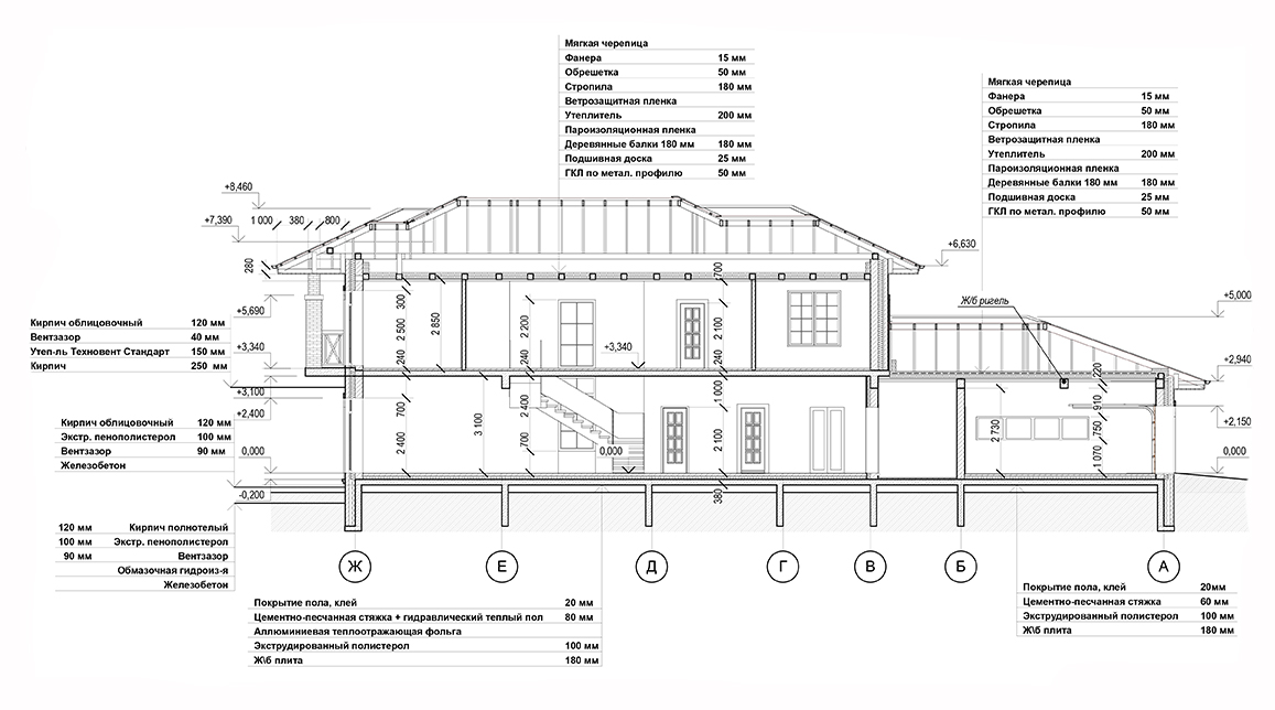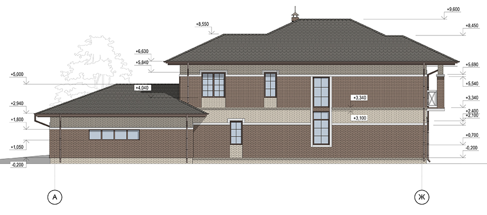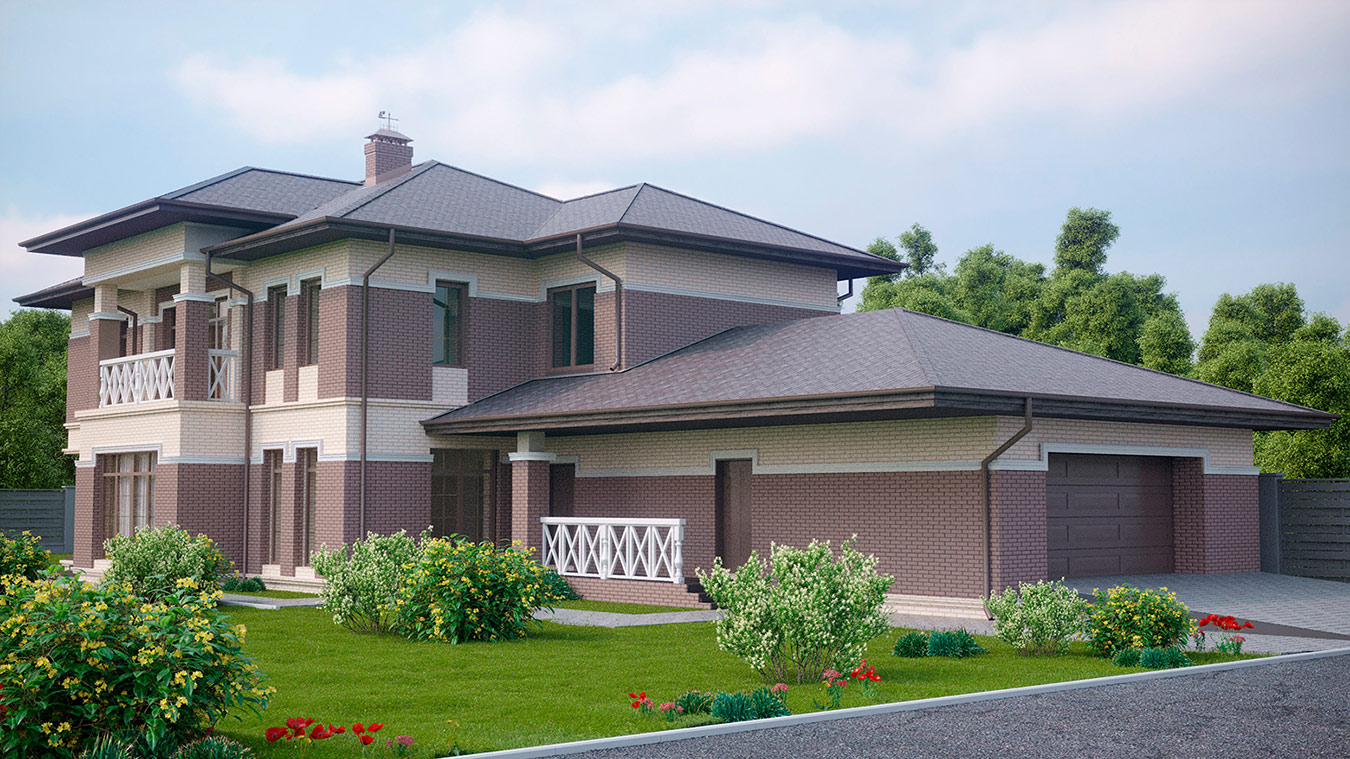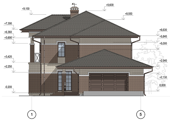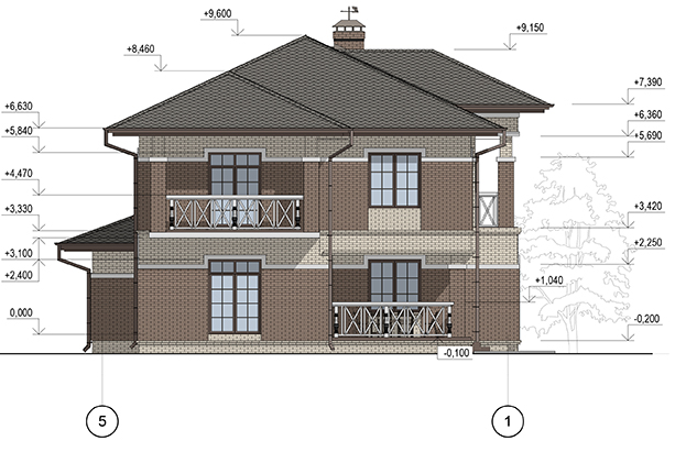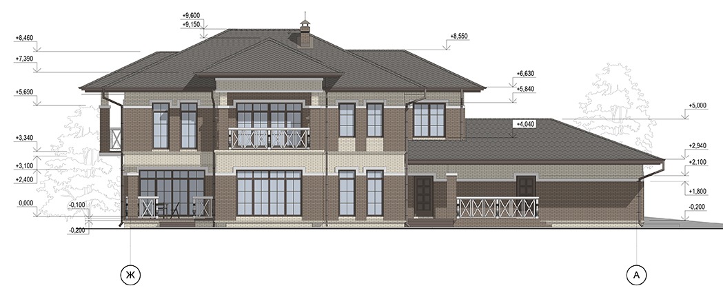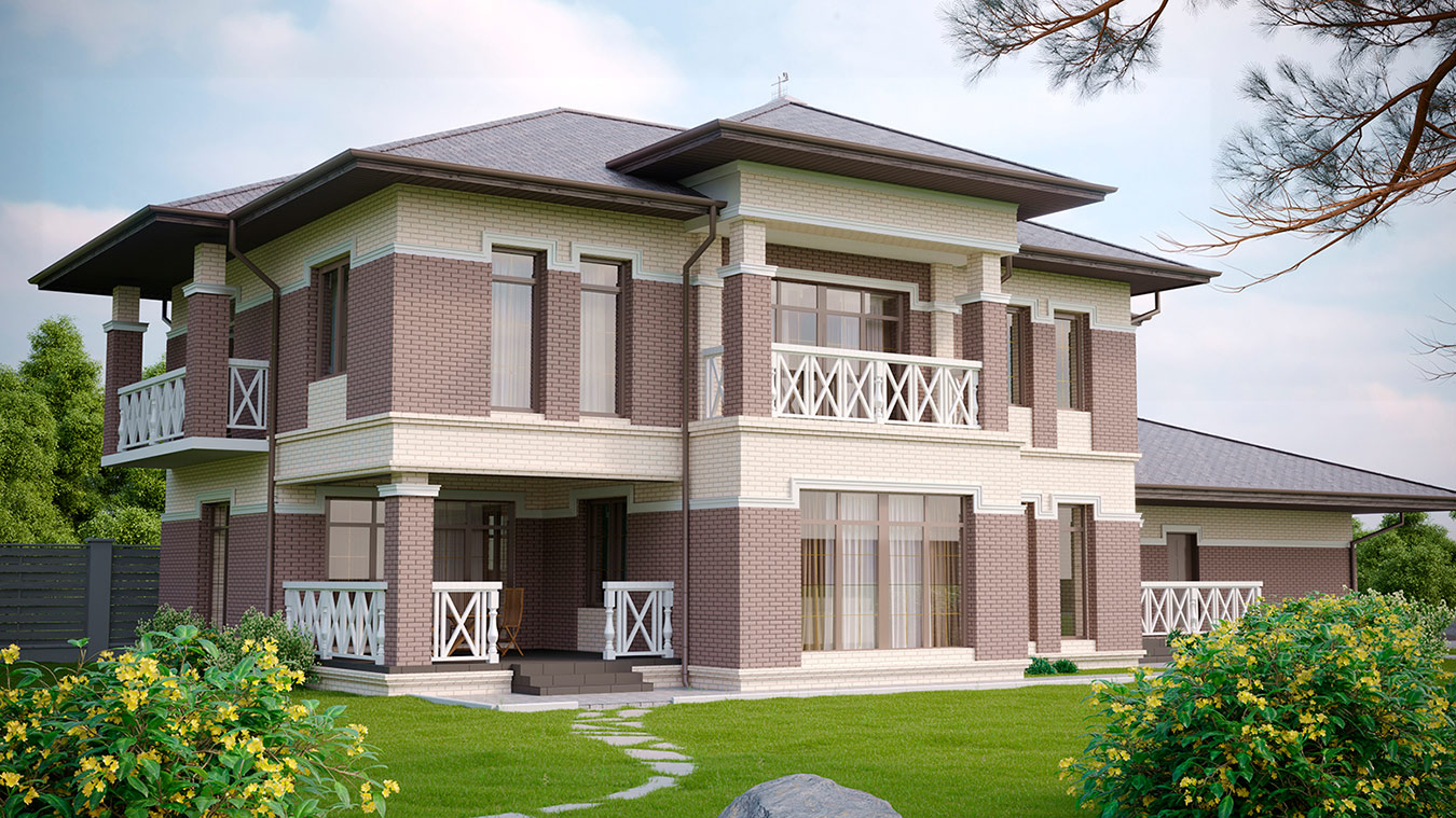Фасады отражают предпочтение заказчиками легкого классического стиля, который просматривается в пластике форм здания и крыши, колоннах, балконах, декоративных элементах. Мягкое сочетание цветов на фасаде поддерживает классический образ.