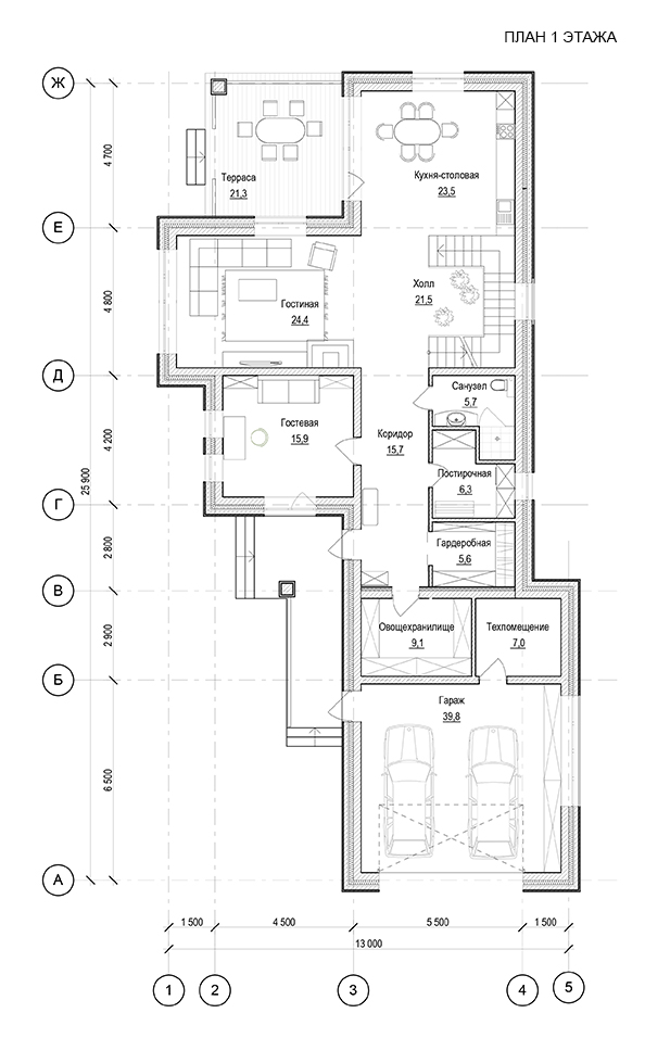 Проект загородного двухэтажного дома разрабатывался для большой семьи. Просторные помещения, возможность проведения застолий и приема гостей в доме и на террасе, парадный холл с лестницей и витражом — таковы были пожелания хозяев. Высокие окна позволяют любоваться внутренним двором и садом, которые благодаря грамотному планированию участка получились достаточно приватными.