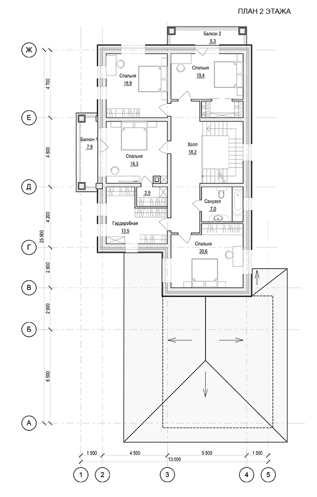 На втором этаже размещены просторные спальни с продуманной системой хранения — гардеробными. Балконы при спальнях обеспечивают связь с природой.
