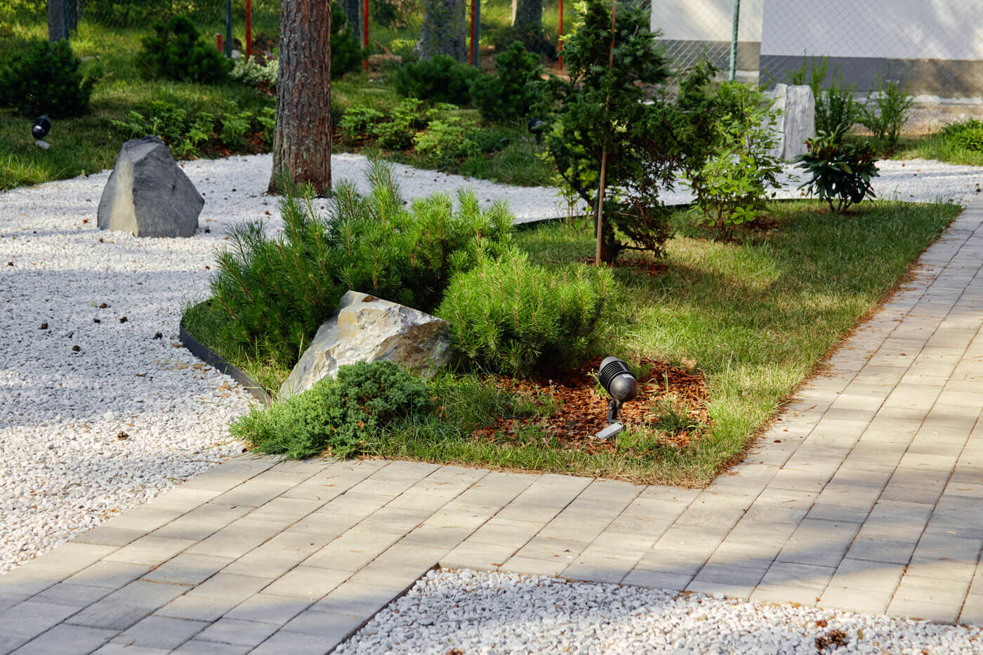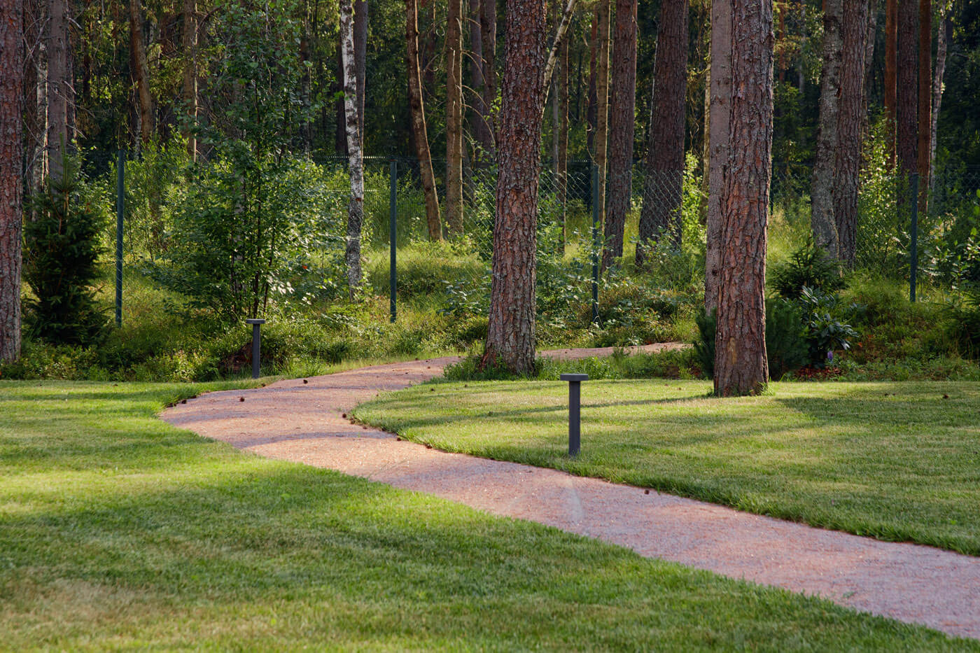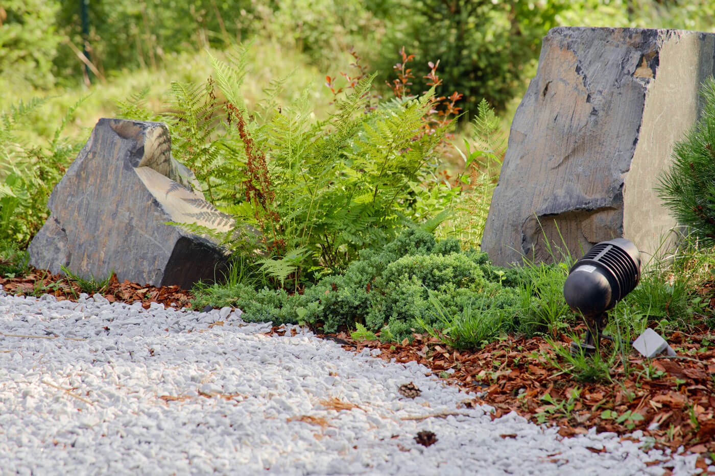 По проекту, напротив парковки размещалась бильярдная, но в процессе реализации вместо нее решили оставить лесную часть. Так, от парковки ведет прогулочный маршрут сквозь лес к зоне очага и стилизованному садику. Дорожка в лесной части выполнена из гравийной отсыпки, а в зоне отдыха и очага мы использовали декоративную белую гальку. При задумке этого стилизованного садика мы вдохновлялись японским искусством создания садов. Идея хозяев состояла в том, чтобы отразить отголоски японской садовой культуры, поэтому здесь появились гравий и валуны, рододендроны, почвопокровные растения и папоротники, компактные горные сосны и сосна формы ниваки. Также использовали прием геопластики и сформировали небольшие холмики. У заказчиков есть возможность в дальнейшем дополнять этот уголок растениями и деталями, чтобы сад менялся с течением времени, как меняются и его хозяева.