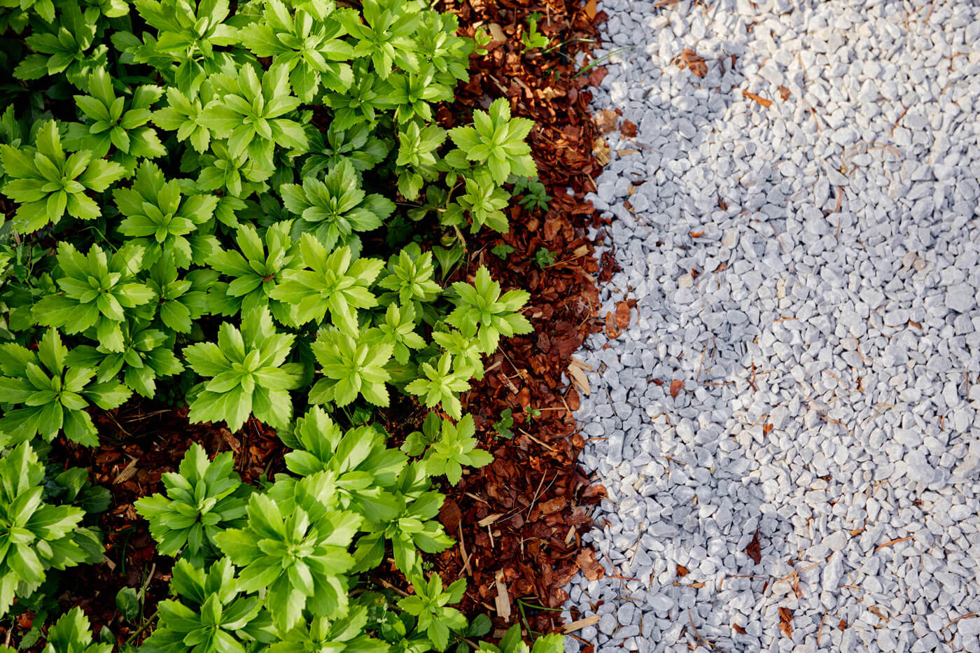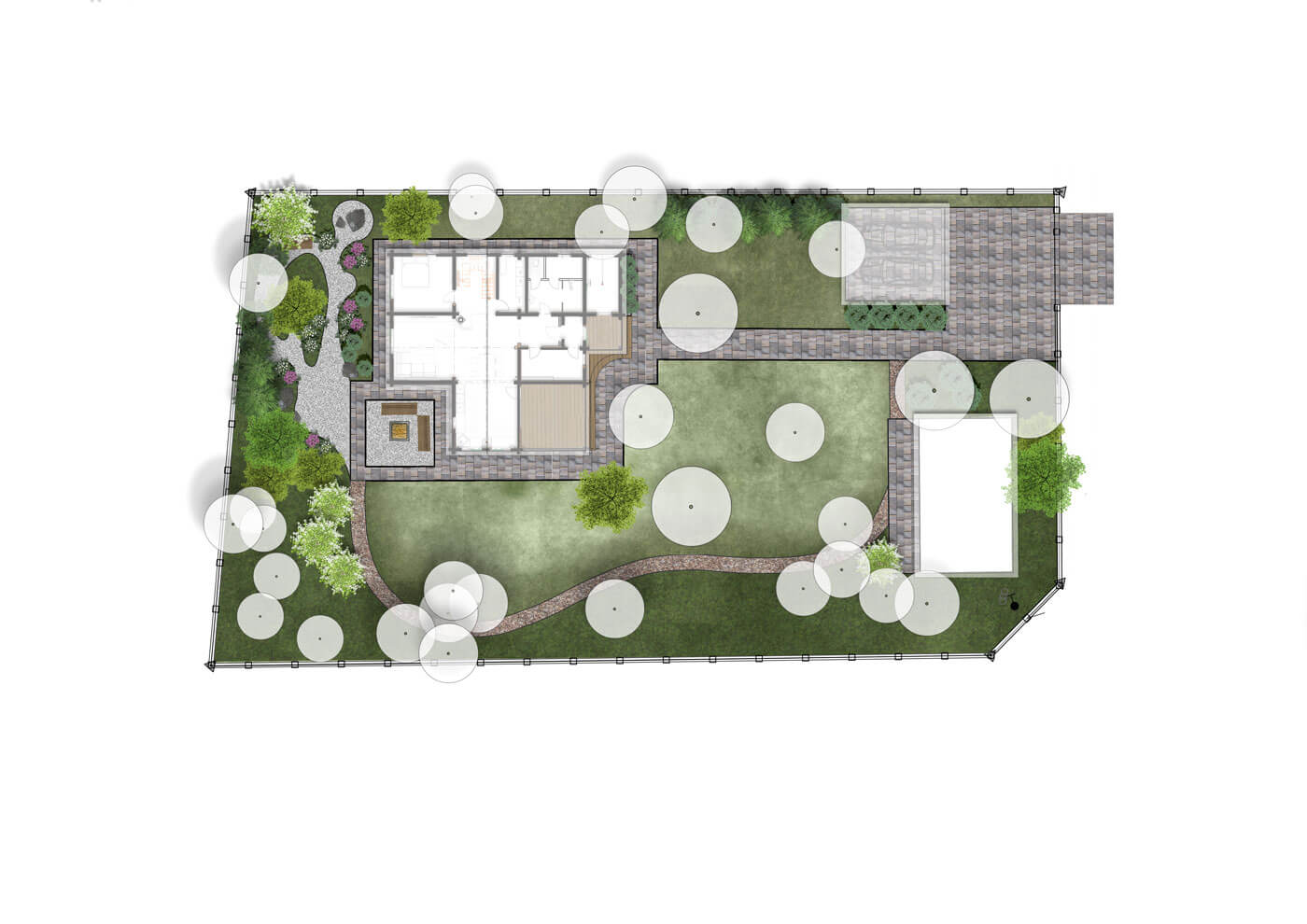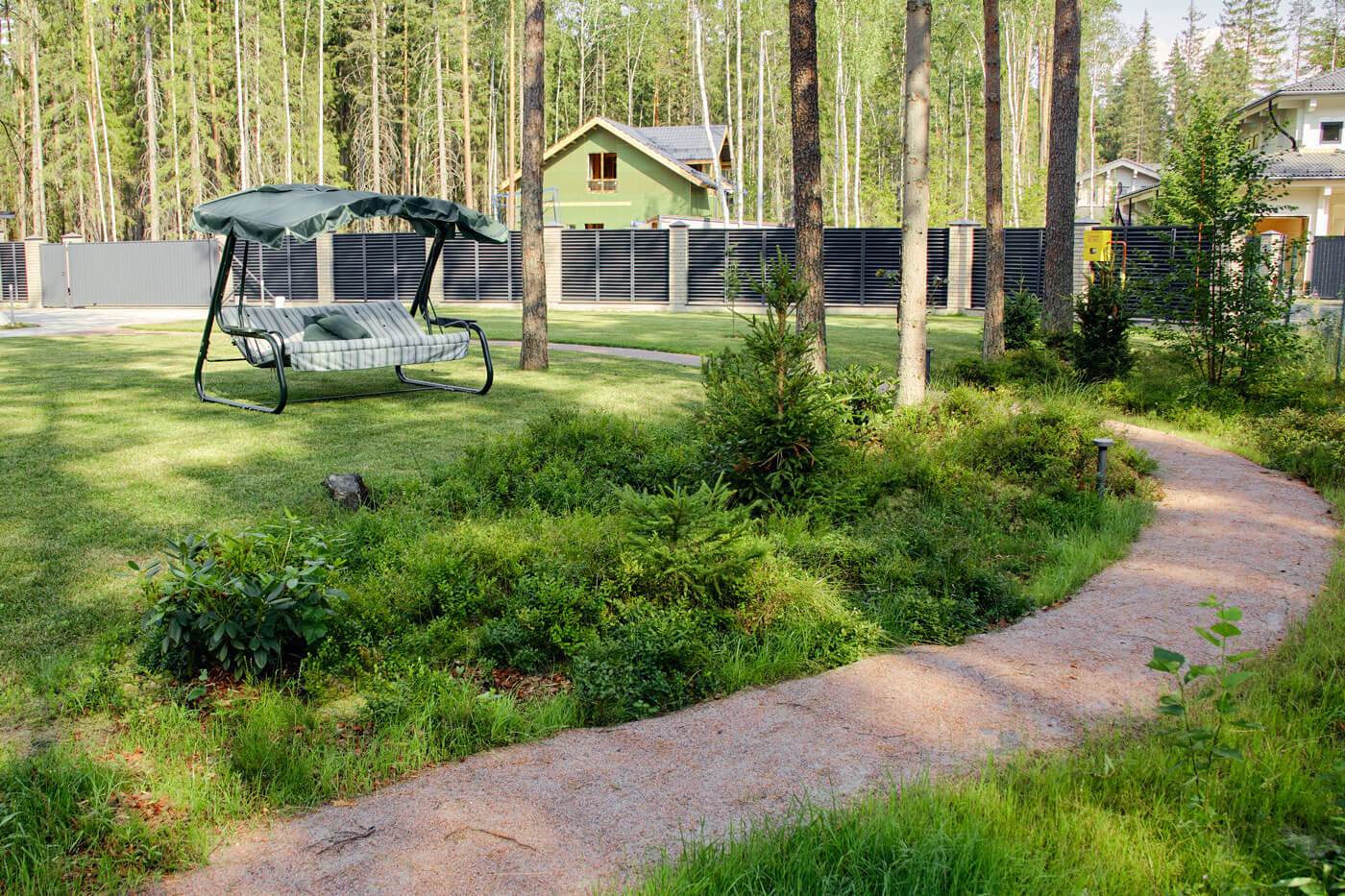 По проекту, напротив парковки размещалась бильярдная, но в процессе реализации вместо нее решили оставить лесную часть. Так, от парковки ведет прогулочный маршрут сквозь лес к зоне очага и стилизованному садику. Дорожка в лесной части выполнена из гравийной отсыпки, а в зоне отдыха и очага мы использовали декоративную белую гальку. При задумке этого стилизованного садика мы вдохновлялись японским искусством создания садов. Идея хозяев состояла в том, чтобы отразить отголоски японской садовой культуры, поэтому здесь появились гравий и валуны, рододендроны, почвопокровные растения и папоротники, компактные горные сосны и сосна формы ниваки. Также использовали прием геопластики и сформировали небольшие холмики. У заказчиков есть возможность в дальнейшем дополнять этот уголок растениями и деталями, чтобы сад менялся с течением времени, как меняются и его хозяева.