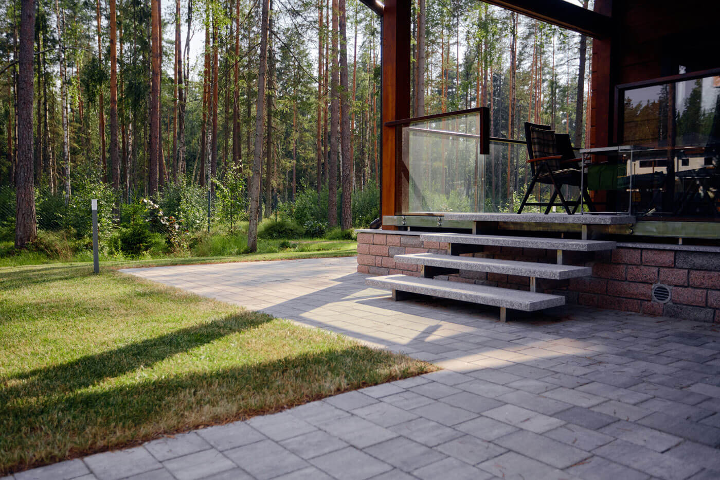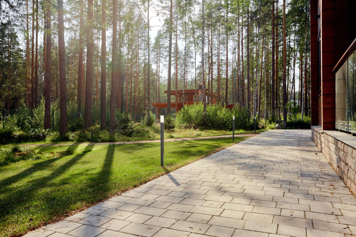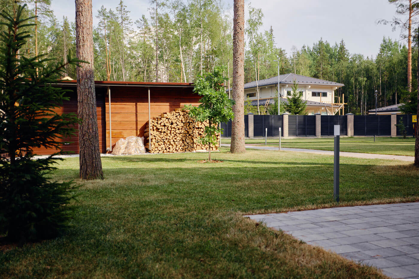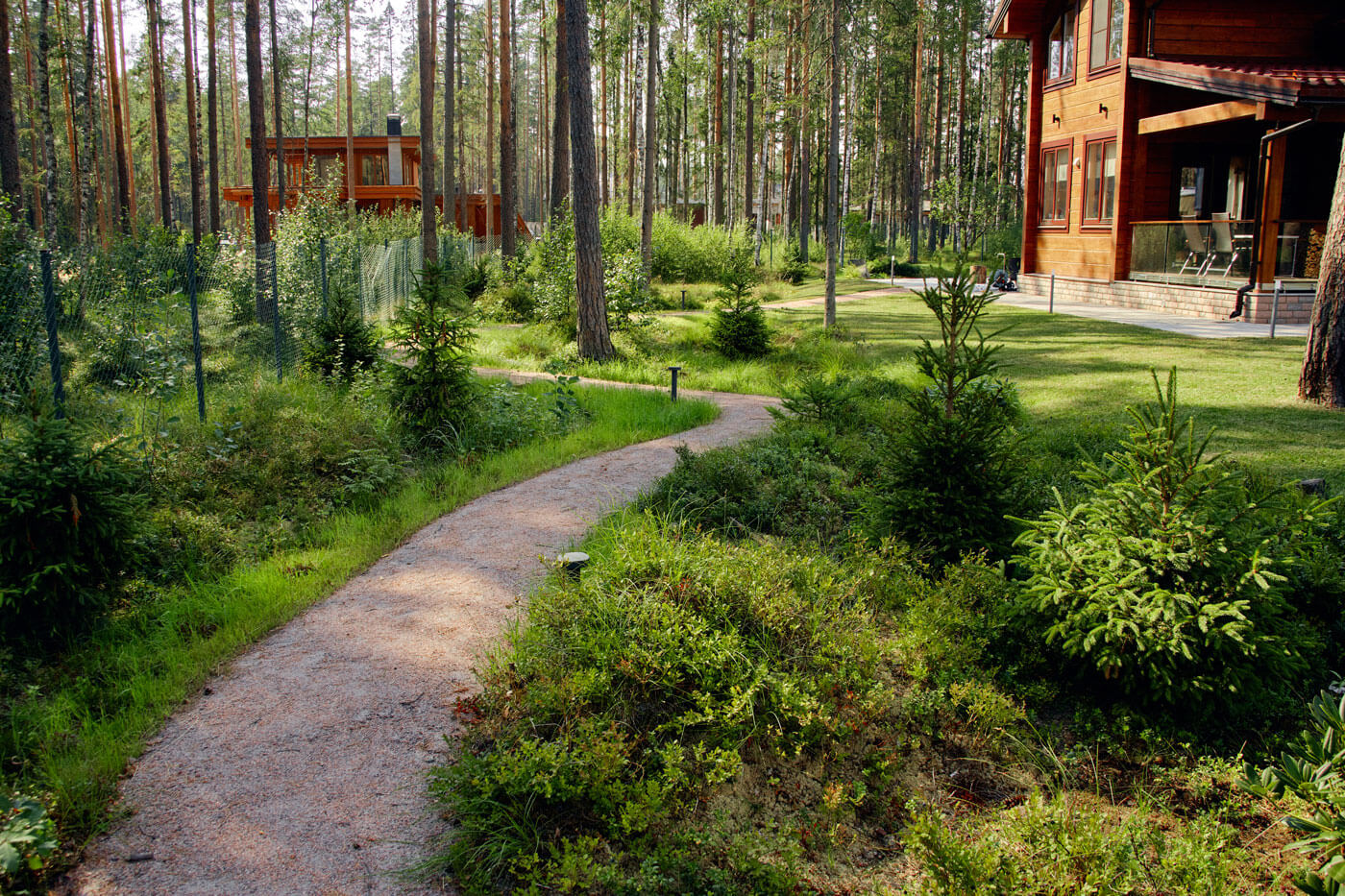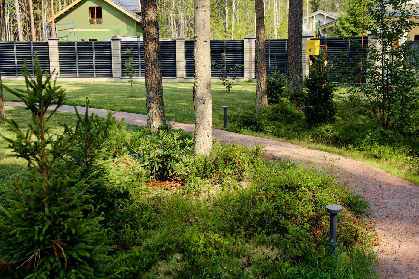 Объект на севере Петербурга в сосновом лесу. На участке мы сохранили фрагмент лесного покрова и существующие деревья, досадили ели, рододендроны и рябины, восстановили черничник – по утрам хозяева любят собирать ягоды. Во въездной зоне расположили парковку и навес, который совмещен с дровником и хоз.блоком, от парковки к дому ведет дорожка. С обеих сторон от дорожки разбита просторная лужайка для активного отдыха и детских игр. Полотно рулонного газона аккуратно подведено к существующим растениям, в процессе оформления лужайки не было повреждено ни одно дерево, поэтому создается максимально естественный эффект.