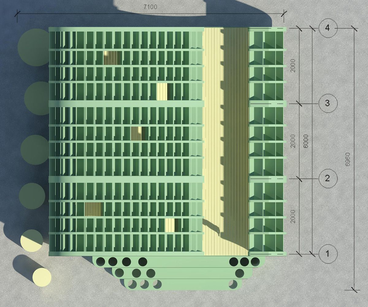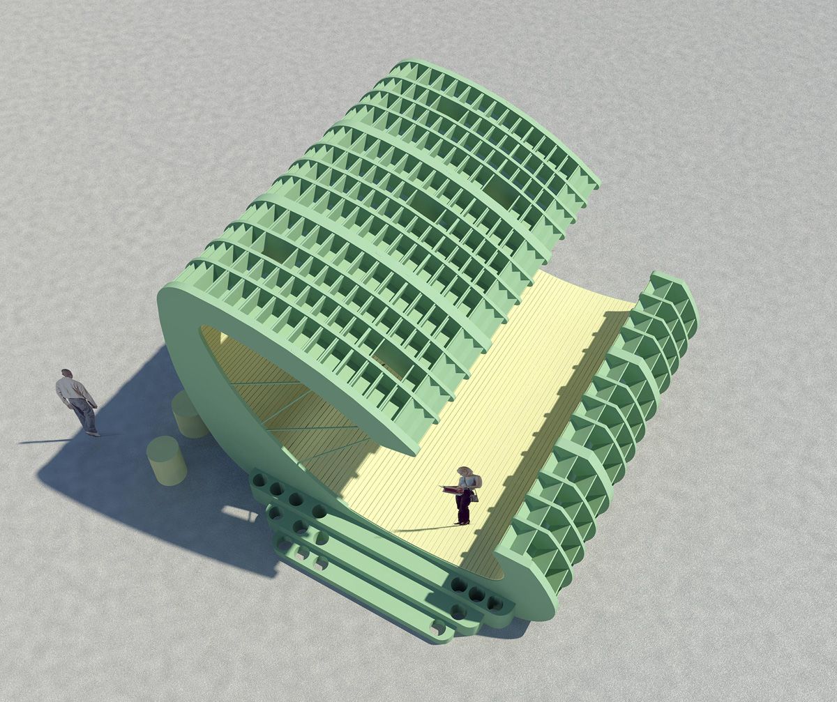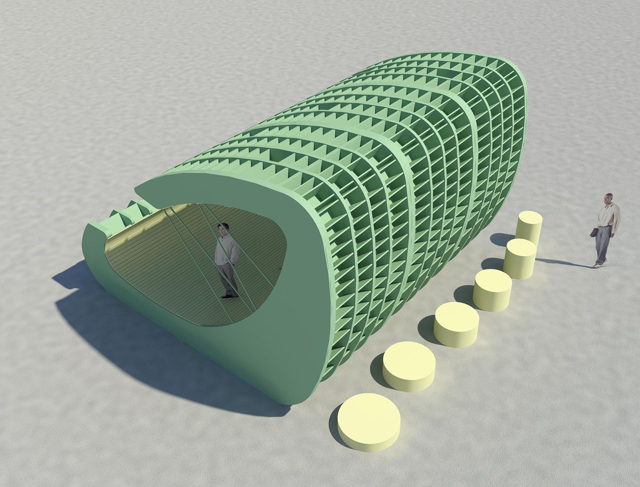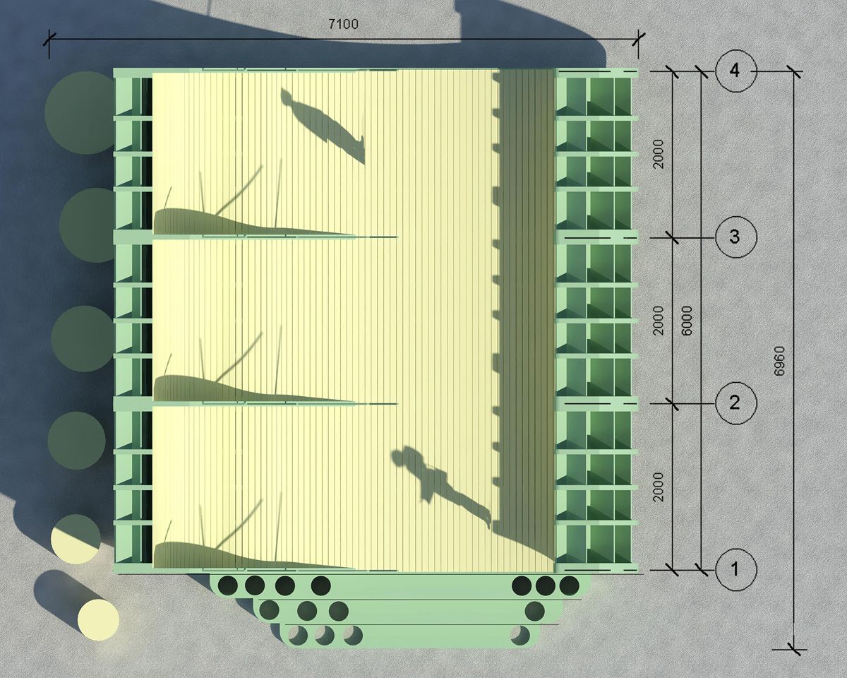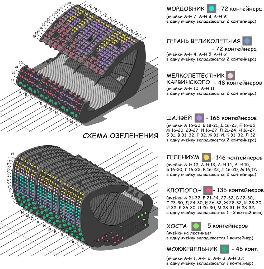 Внутренняя часть формы имеет фигурный профиль и представляет собой зону для отдыха. В покрытии есть проемы, которые позволяют проникать в тенистую зону отдыха лучам солнца, а посетителям сада видеть небо и цветы на крыше. Если подвесить к покрытию контейнеры с ампельными цветами, то природные компоненты среды максимально приблизятся к отдыхающим.