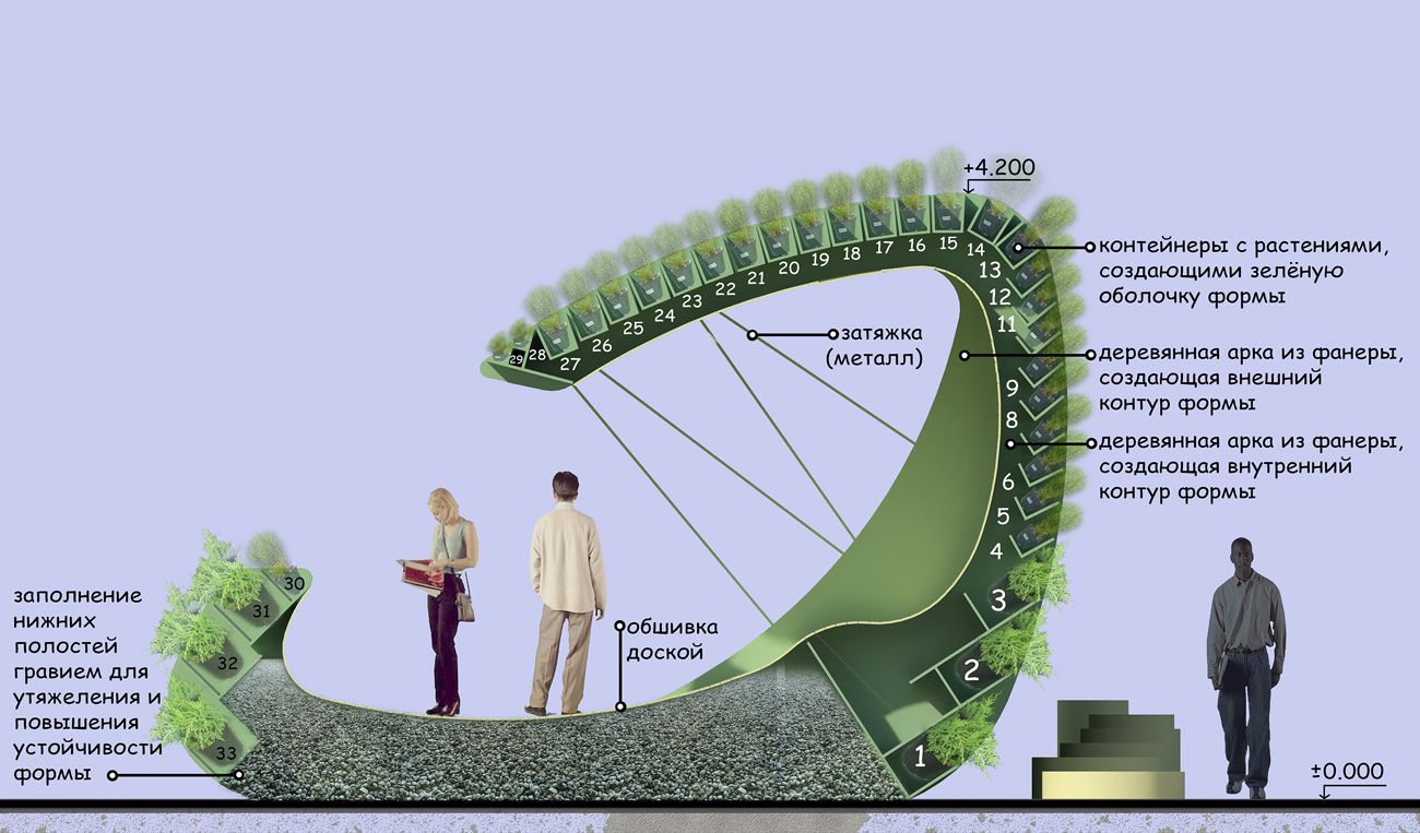 Конструкция сада представляет собой деревянную пространственную решетку, состоящую из деревянных арок с металлическими затяжками и поперечных деревянных ребер. Арки делятся на два типа: первый формирует внешнюю форму валуна, входную зону, а второй тип создает внутреннюю профилированную поверхность, углубленную относительно входа. Каждая арка склеивается из фигурно вырезанных листов фанеры.